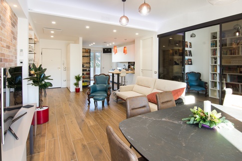 Molto in voga anche gli open space in stile industriale: ispirato ai loft urbani, questo stile utilizza materiali grezzi come metallo, cemento e legno recuperato. Dettagli come mattoni a vista, tubature esposte e grandi finestre danno un carattere robusto e urbano. Mobili robusti e accessori vintage completano l'aspetto industriale.