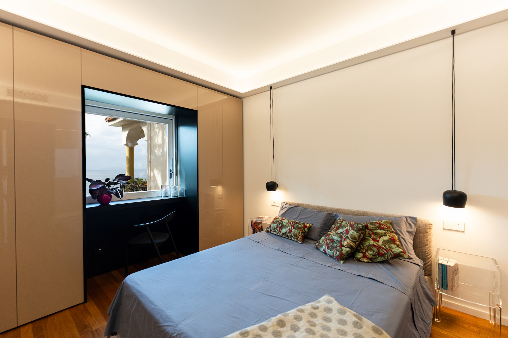 Le camere da letto rappresentano il cuore del minimalismo funzionale. Soluzioni su misura, come l'armadio a parete, si integrano armoniosamente con lo stile, offrendo funzionalità senza compromettere l'eleganza. La combinazione di forme e colori crea un ambiente accogliente e distinto.