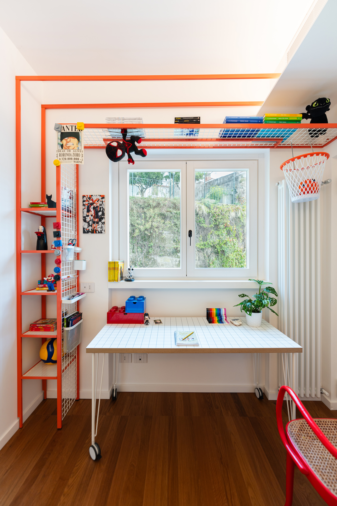La camera delle ragazze, segue lo stesso stile della cucina, con arredi su misura e un vivace color carota che rispecchia le linee e le geometrie dell'intero ambiente.