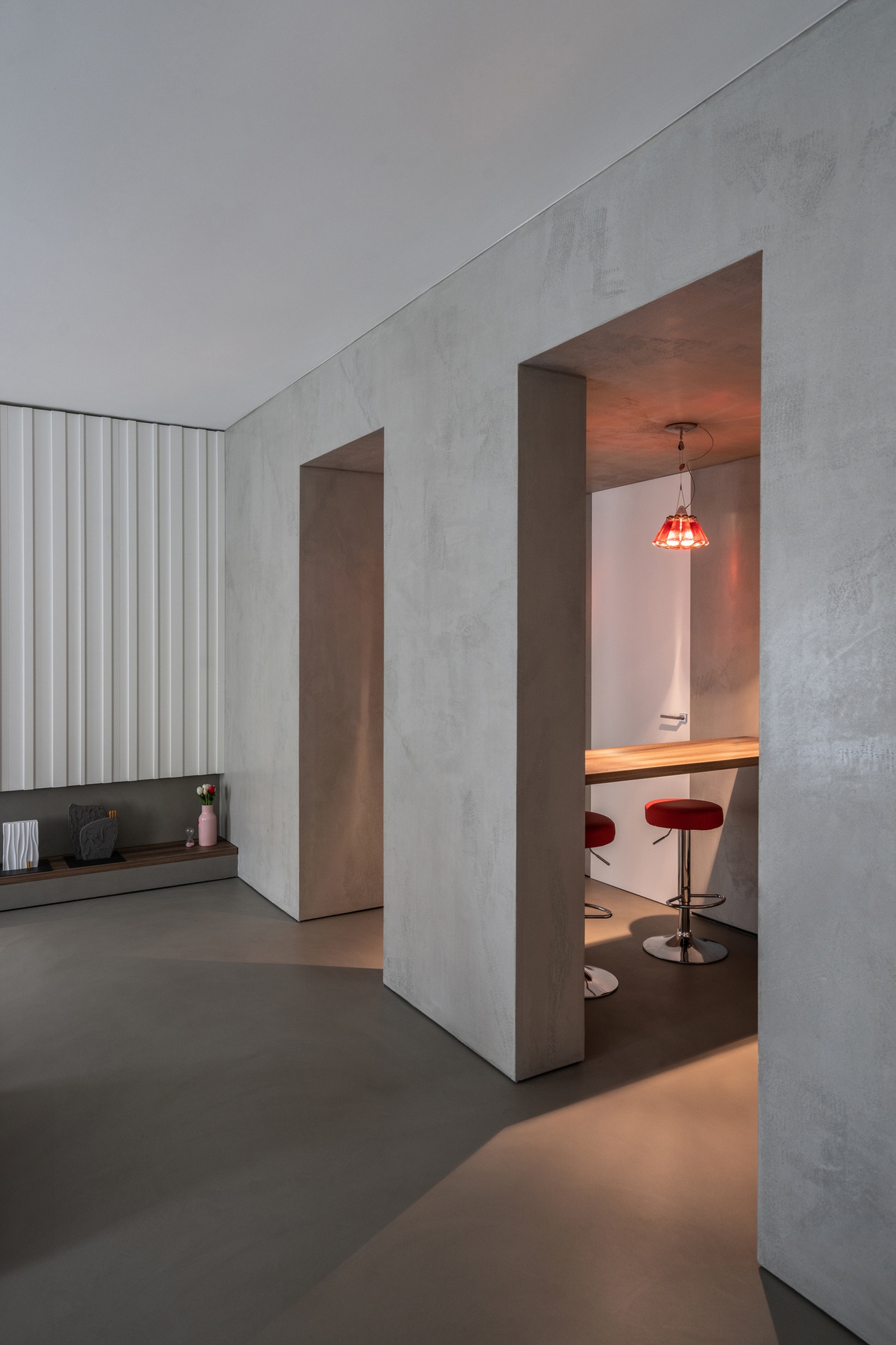 Un aspetto distintivo di questo progetto è la scelta dei materiali. La pavimentazione in cemento architettonico di Innovative Surface conferisce continuità visiva e un senso di ampiezza che si estende in modo fluido attraverso tutti gli ambienti. Il microcemento è un materiale versatile e resistente, ideale per creare superfici uniformi e senza soluzione di continuità.