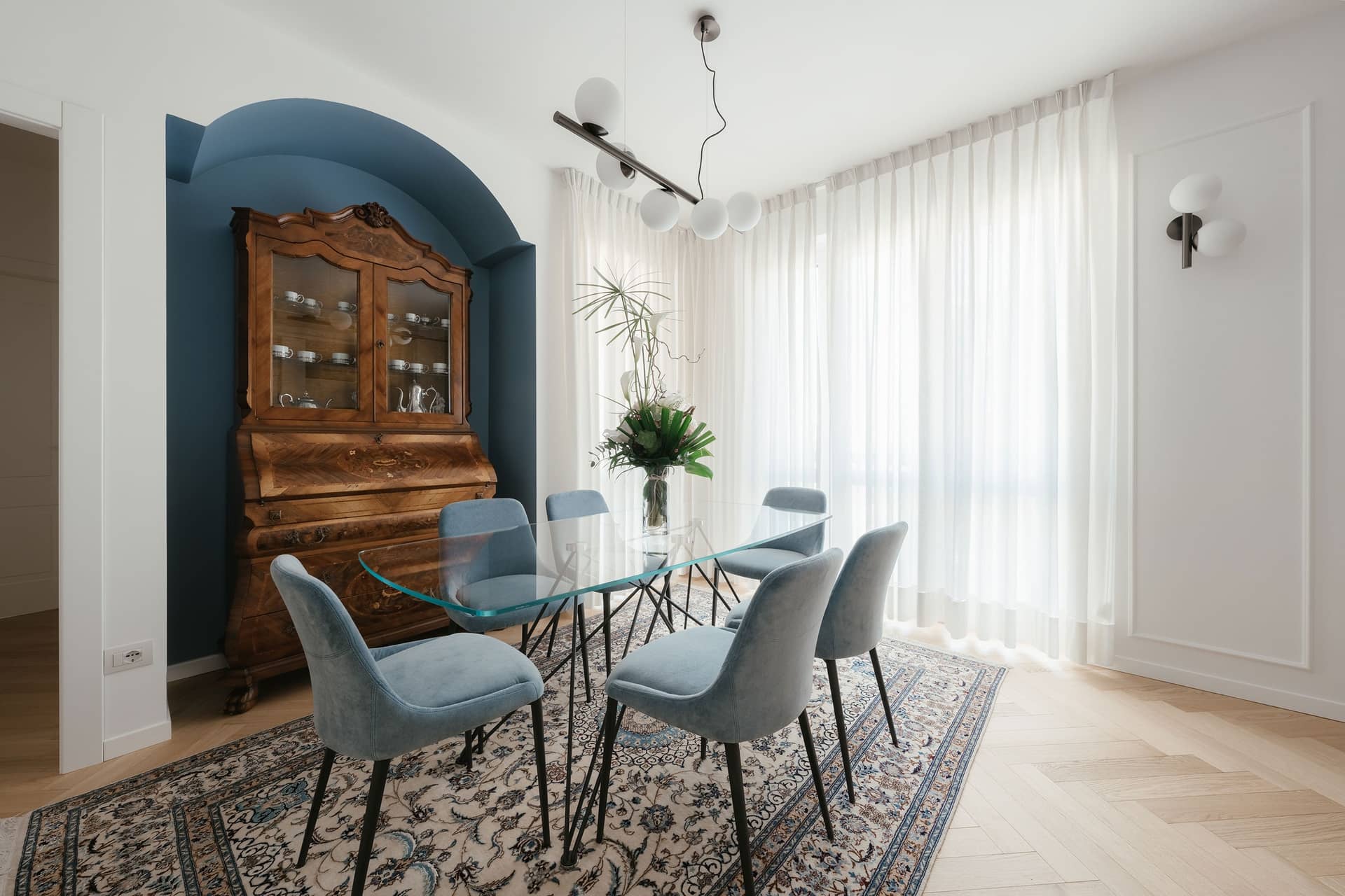 Per quanto riguarda i tessuti, nello stile classico puoi optare per velluto, broccato, seta o damasco, ma anche per cotone e lino, purché con forme e trame tradizionali. Se invece preferisci uno stile moderno, i tessuti saranno più semplici e leggeri, contribuendo così a trasmettere minimalismo e ariosità all’ambiente.