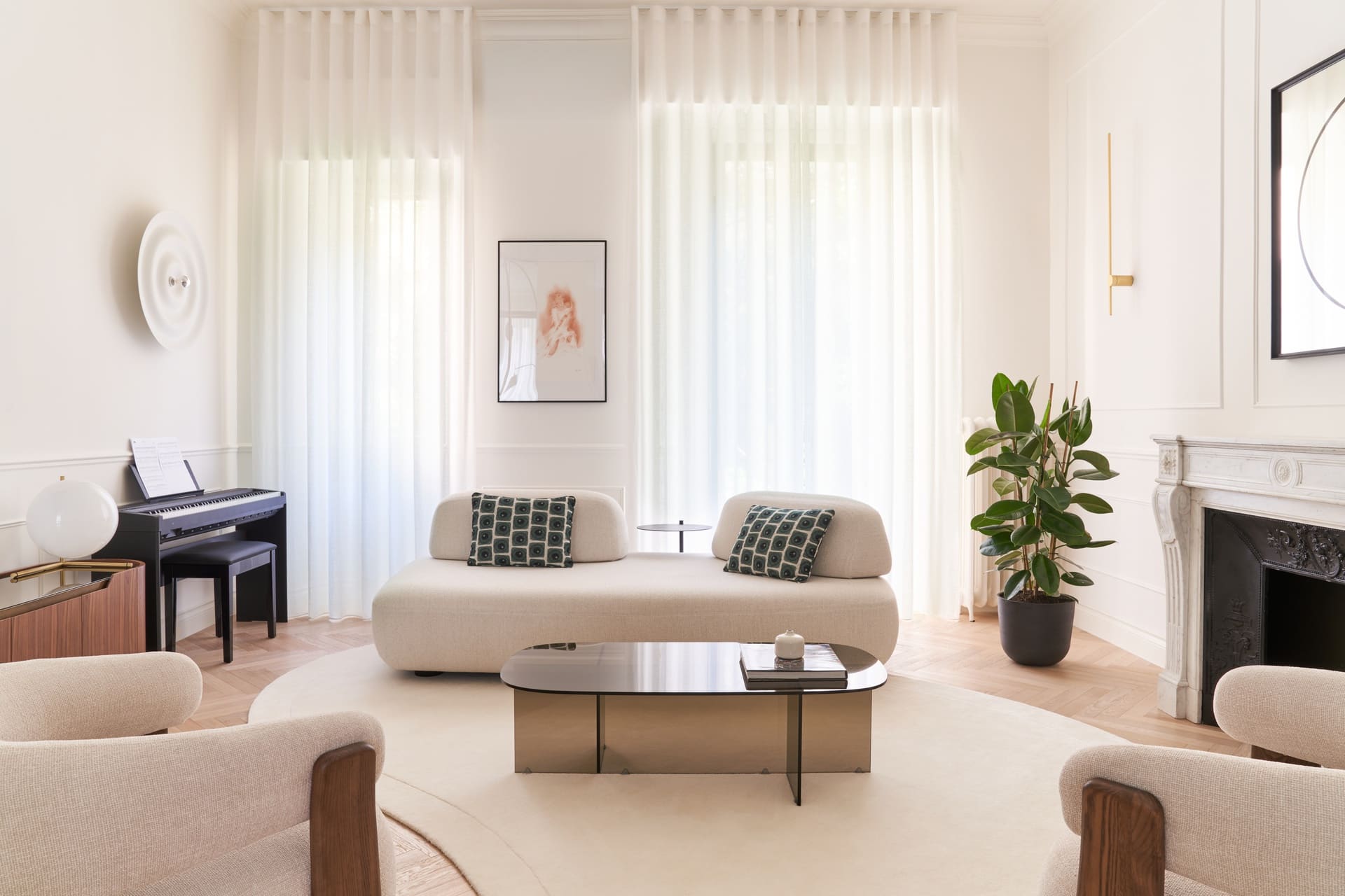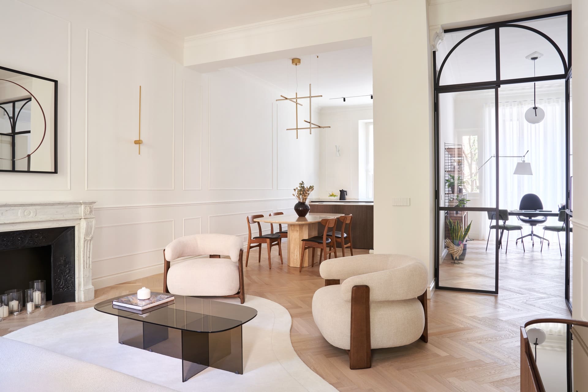 L’abitazione si caratterizza per pareti bianche ornate da cornici, soffitti alti e un parquet a spina di pesce in rovere, elementi tipici dello stile parigino. I dettagli dorati, presenti in accessori e lampade di design, aggiungono tocchi di luce e raffinatezza. Il camino originale in marmo, decorato con linee curve e decoupage, diventa il fulcro emotivo della zona giorno mentre le ampie vetrate incorniciate da profili neri creano un dialogo continuo tra interno ed esterno, valorizzando la palette calda e neutra degli ambienti.