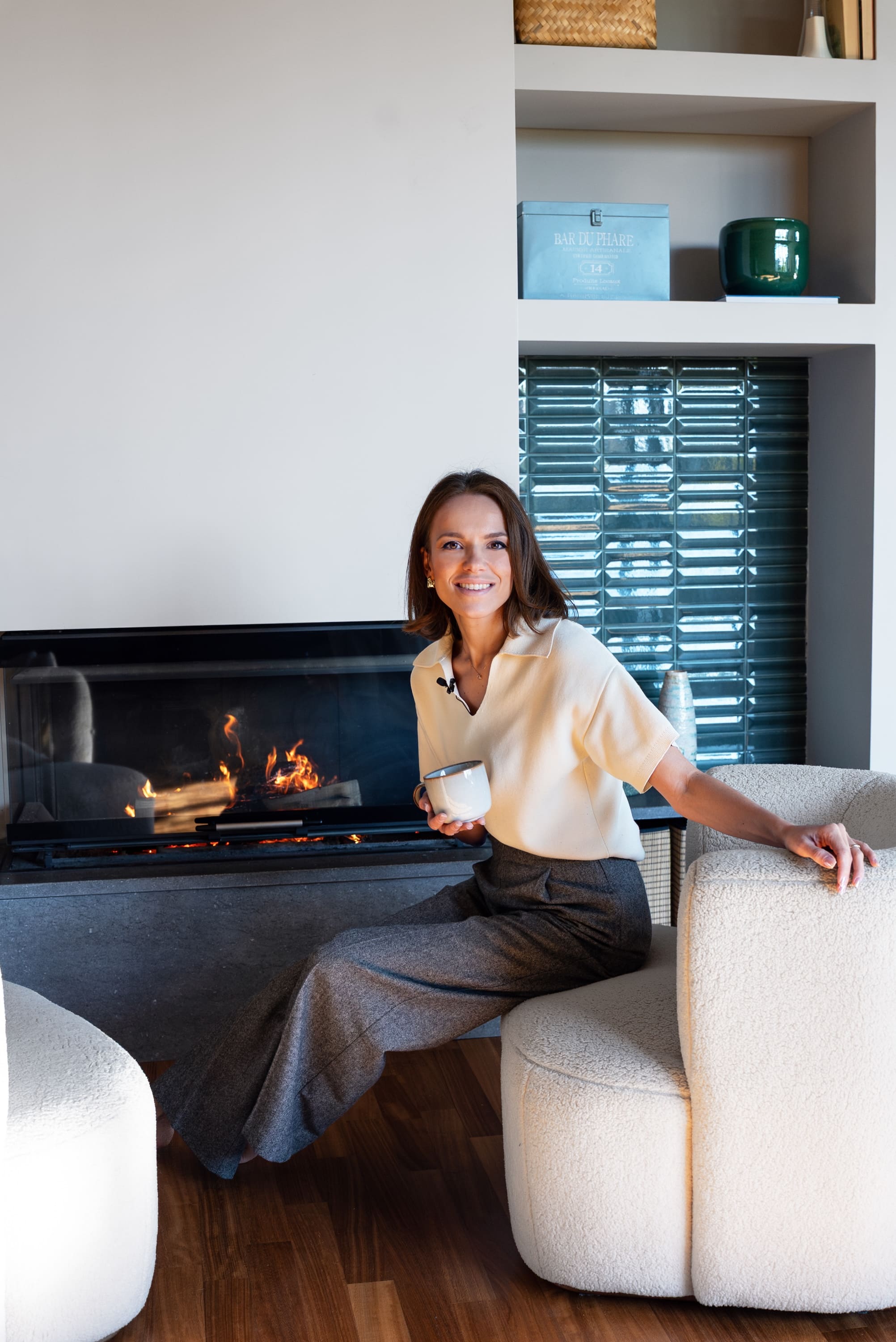 Questa zona dall’atmosfera un po' romantica diventa il fulcro attorno al quale ruotano le altre funzioni dell’open space di 50 mq: sala da pranzo, zona relax con TV e divano. Intorno al camino, una decorazione in brick tridimensionali offre spazi contenitivi e decorativi mentre due poltrone in morbido tessuto bouclé bianco invitano subito al relax.