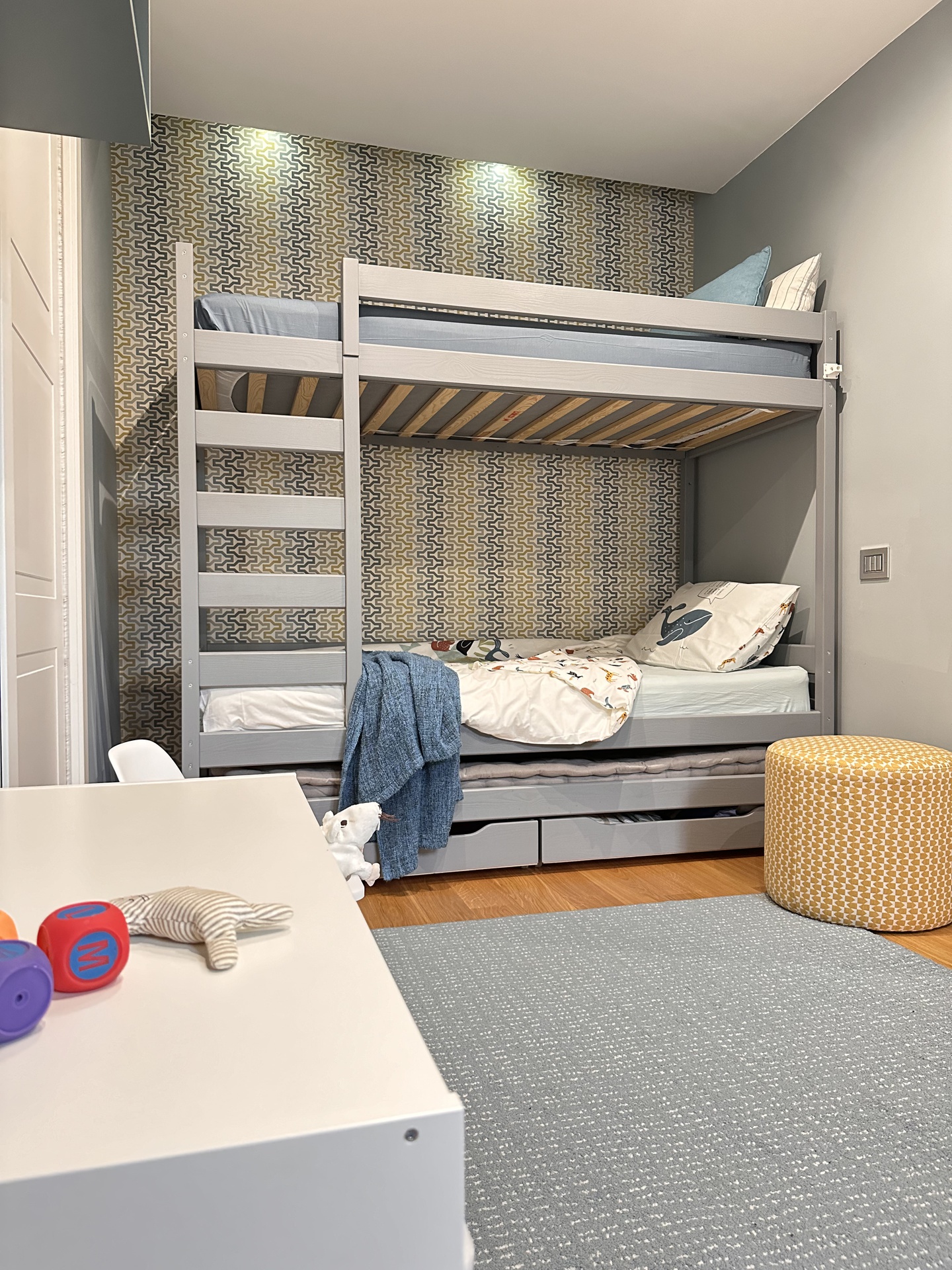 Funzionalità e cura dei dettagli sono evidenti anche nelle camere da letto. Per i bambini è stato scelto un comodo letto a castello con pratici cassettoni e un terzo letto estraibile per accogliere gli amici. È la soluzione perfetta per massimizzare lo spazio e offrire divertimento e comfort! È stata pensata anche una camera-studio con grandi scrivanie, una libreria e un divano per i momenti di tranquillità.