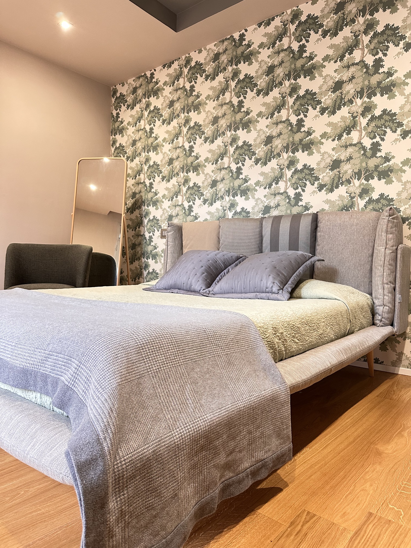 La camera padronale, invece, è circondata da foglie sulla carta da parati, tessuti morbidi e luci delicate. Tutto trasmette una sensazione di calma e relax. Il letto firmato Noctis unisce leggerezza a decoro e sembra evocare un senso di protezione, intimità e calore. Le testiere imbottite si curvano ai lati per avvolgere chi vi si appoggia, come in un morbido abbraccio.