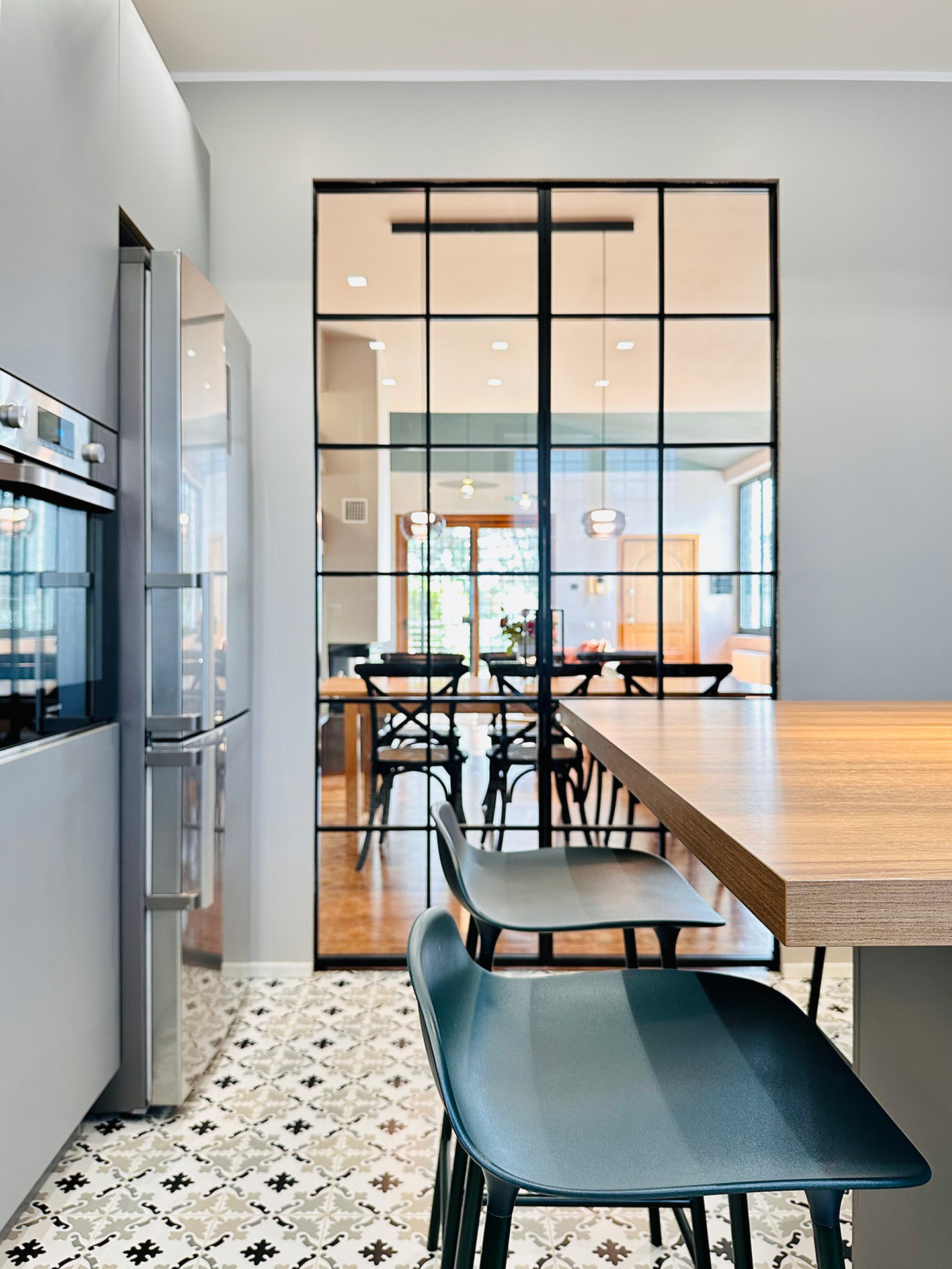 La cucina sorprende con un pavimento in cementine dal decoro floreale ma geometrico, a sottolineare il desiderio di ordine e pulizia. Lo stile è stato suggerito dalla campagna circostante. Una palette di colori ispirata alla natura con nuance verde bosco e grigio perla, si accostano a texture come il legno del top della penisola, creando un’atmosfera avvolgente e accogliente.