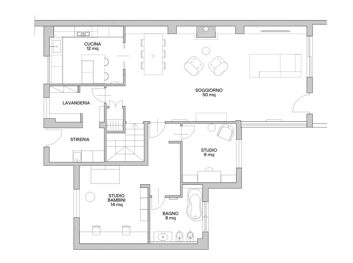 La divisione degli spazi è stata studiata con attenzione: la lavanderia e la stireria occupano ben 15 mq, rispondendo alle esigenze di praticità dei proprietari. Ogni ambiente è stato definito con precisione, creando una sequenza fluida di spazi che si integrano armoniosamente tra loro.