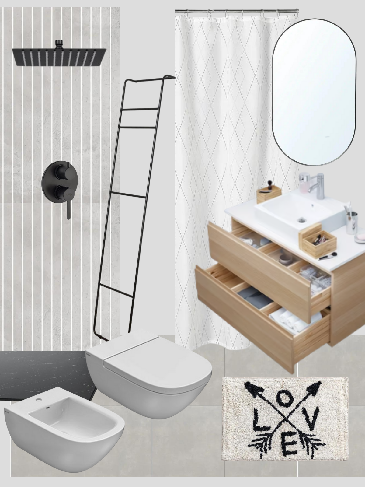 Bagno essenziale dai colori naturali. L'unico accento di dettaglio sono la rubinetteria e le parti in metallo nero opaco che spiccano a contrasto con il mobile lavabo color rovere. Con il suo design semplice e lineare anche il bagno ha uno stile originale