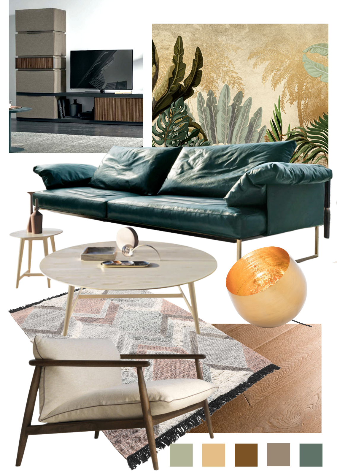 Un soggiorno dallo stile moderno, dalle linee morbide e sinuose. Il pavimento il legno di quercia dalle tonalità calde bene si abbina ai divani e poltrone di Desiree. Un tocco eccentrico che dà all'ambiente uno stile jungle è la carta da parati di Inkiostro, le forme delle palme sono riprese nelle imbottiture delle poltrone.