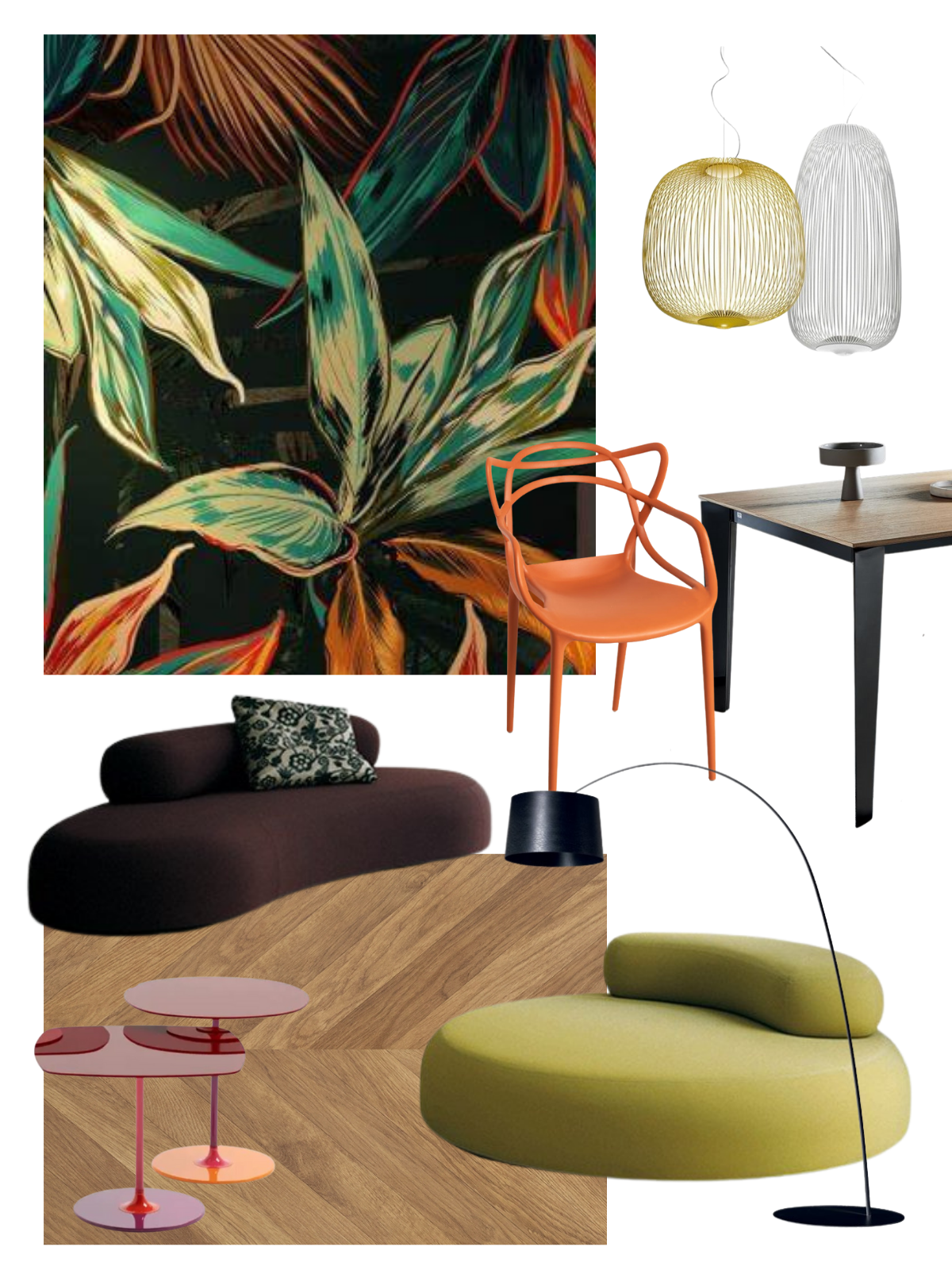 Un ambiente urban con numerosi tocchi di colore per rendere ancora più caldo lo spazio, un soggiorno con divani dalle forme sinuose e complementi d’arredo di design che riprendono i colori della carta da parati a parete.
