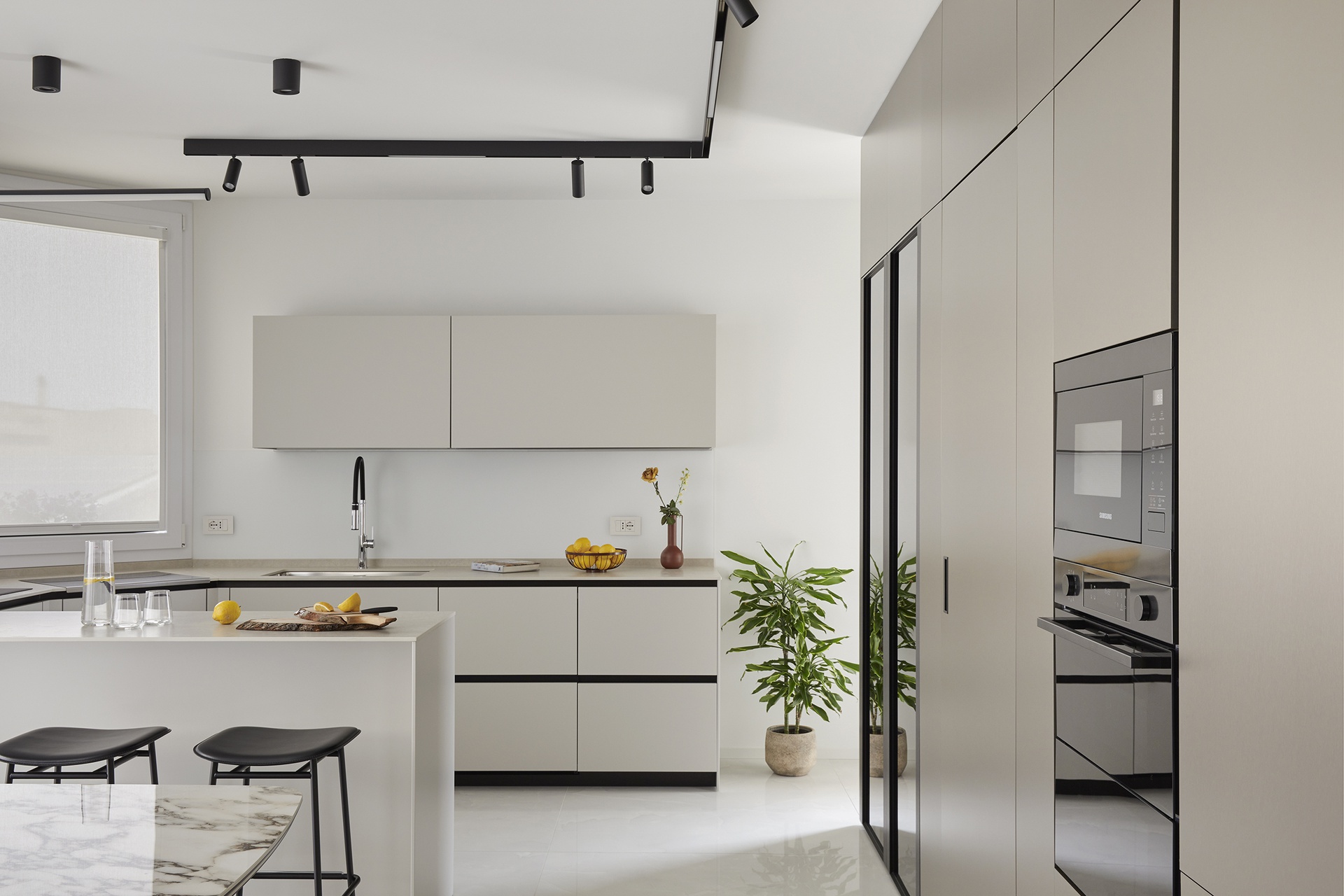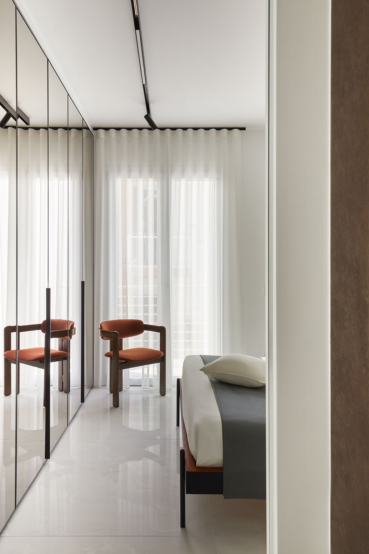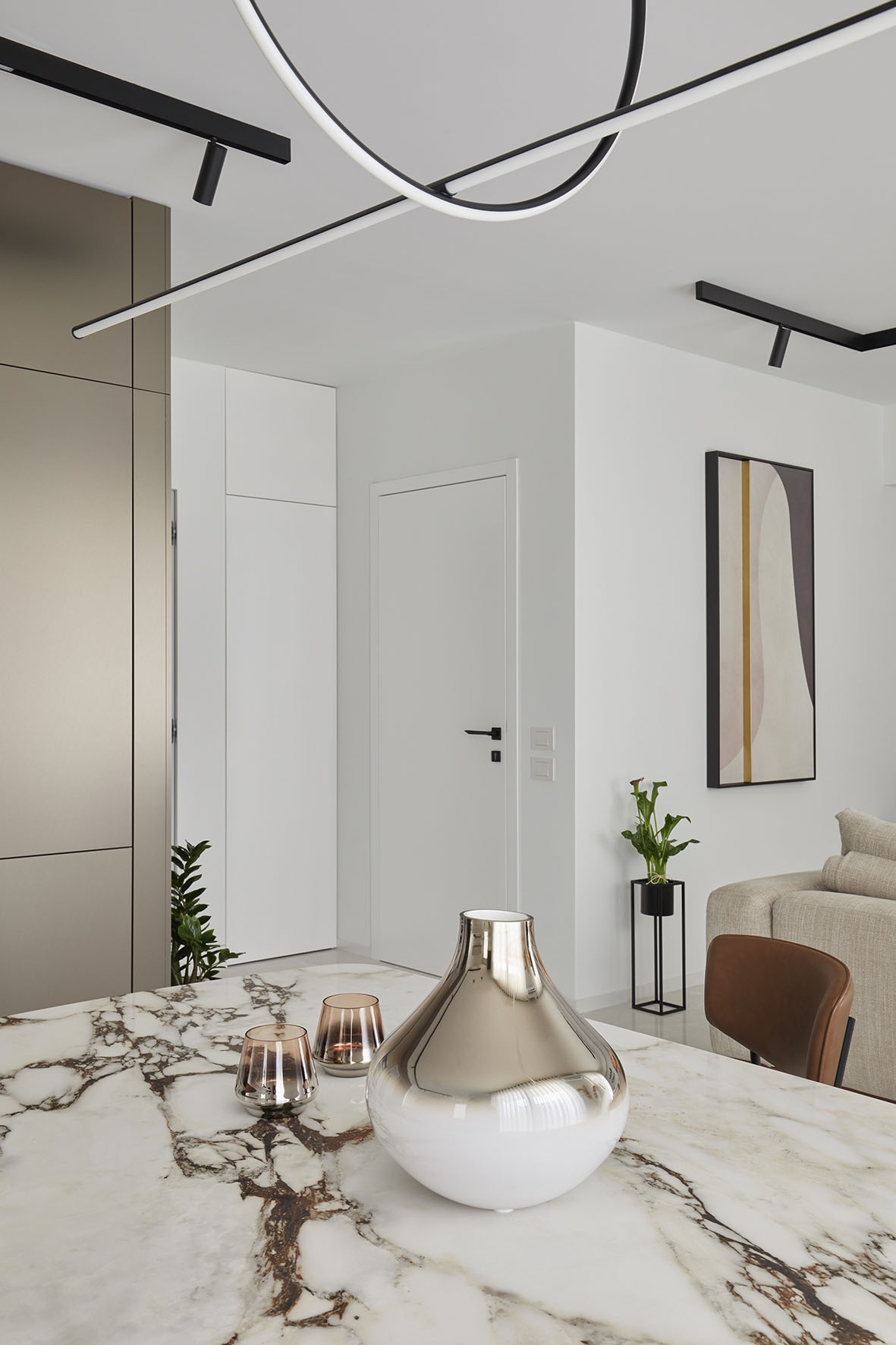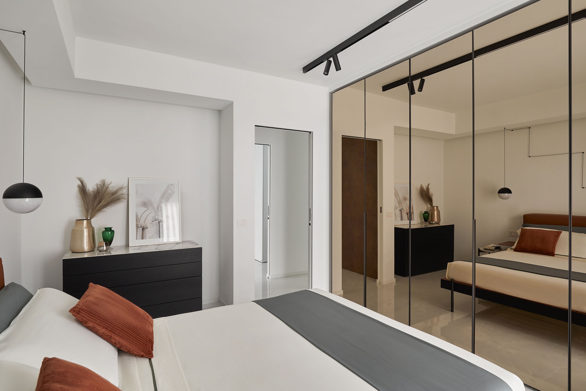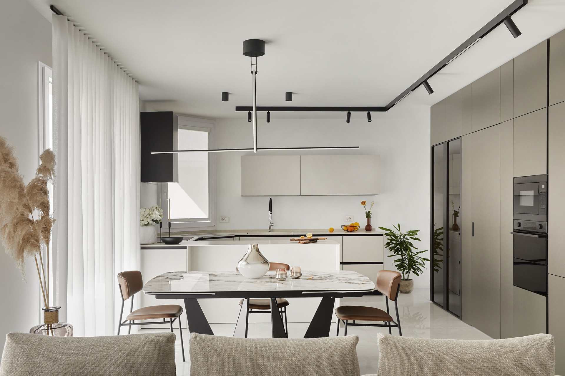 Vicino al centro storico, questo appartamento di una giovane coppia siciliana è caratterizzato da ampi spazi, grandi vetrate, colori neutri e giochi di volumi.Nella zona giorno un volume armadiato a supporto della cucina, rivestito con effetto metallico, nasconde il bagno ospiti e la lavanderia attraverso una porta che si mimetizza tra le ante.La pavimentazione in gres in grande formato effetto onice, grazie al suo colore chiaro e alle venature delicate, uniforma elegantemente l’intero alloggio.I lavabi in marmo dei bagni sono stati realizzati su disegno da artigiani locali, mentre diversi sono gli elementi di design contemporaneo che caratterizzano il resto della casa.Per la luce è stata prevista un’illuminazione più tecnica per le aree di lavoro, affiancata da lampade più decorative ed iconiche creando un’atmosfera calda e accogliente.