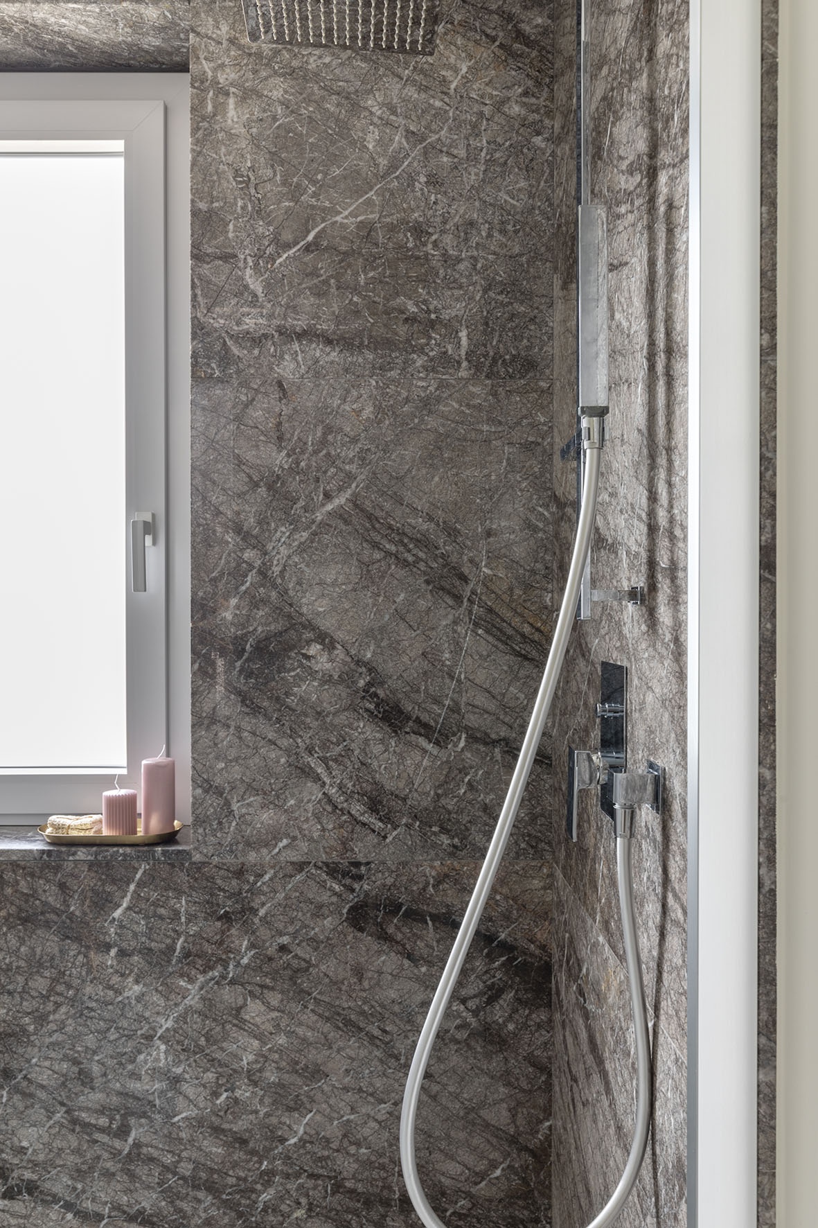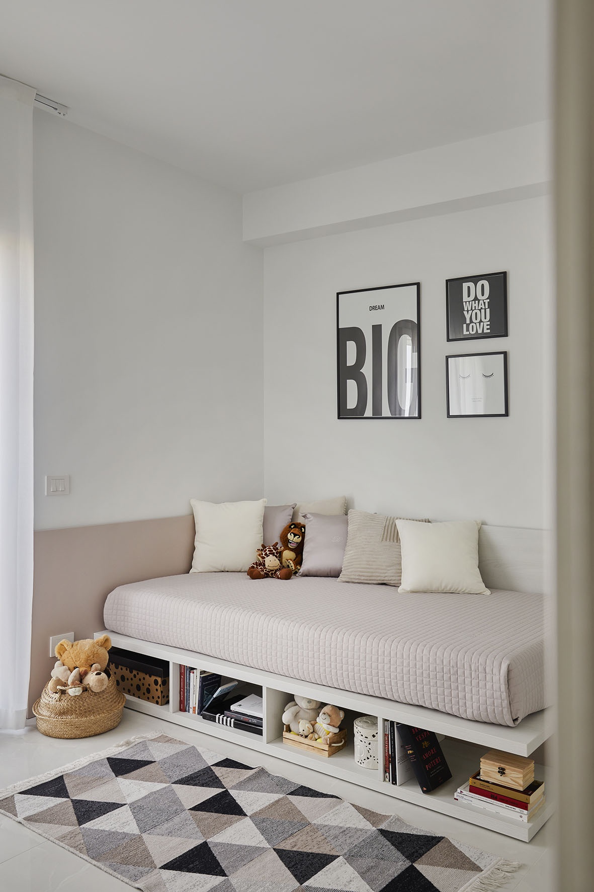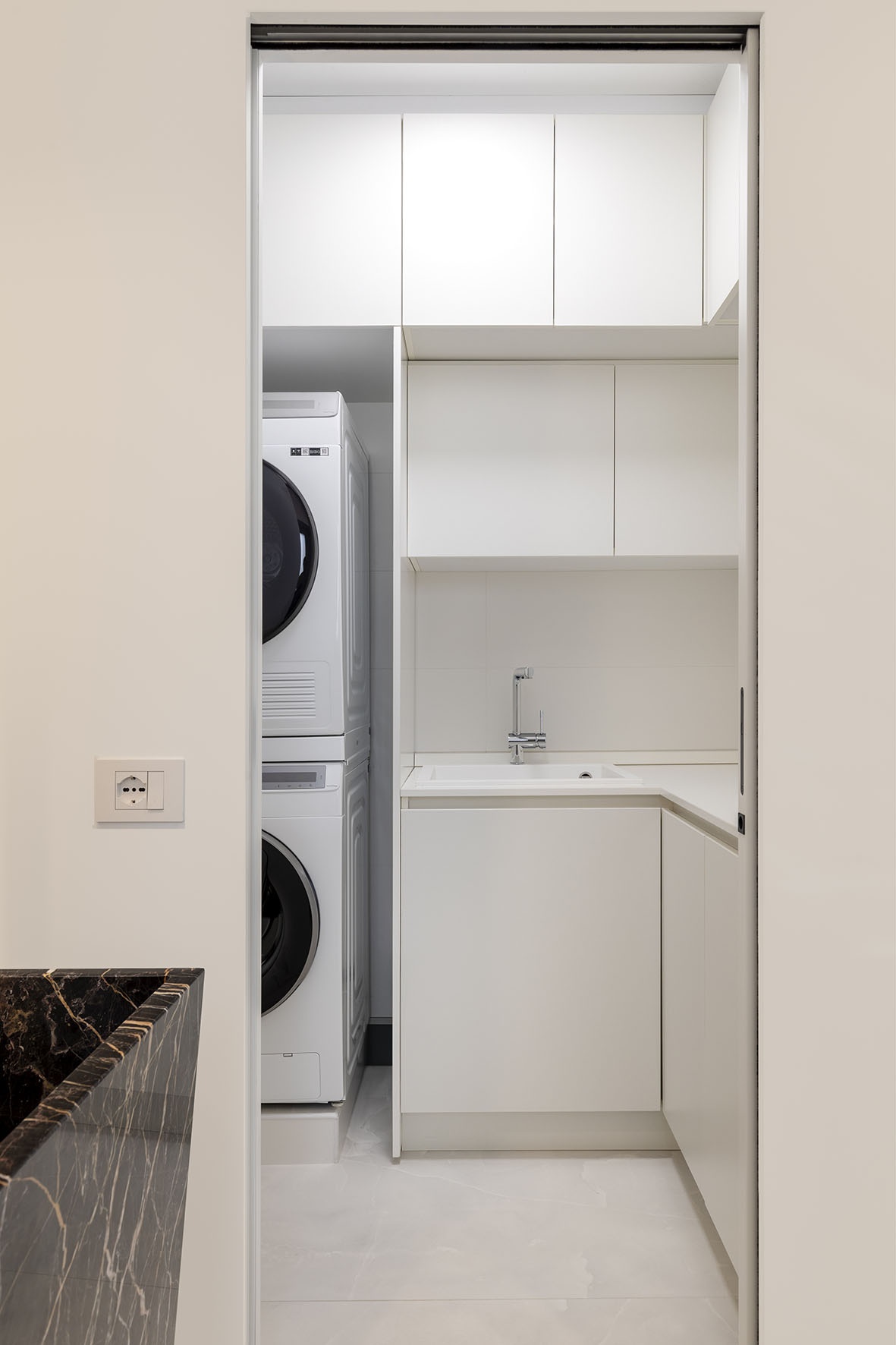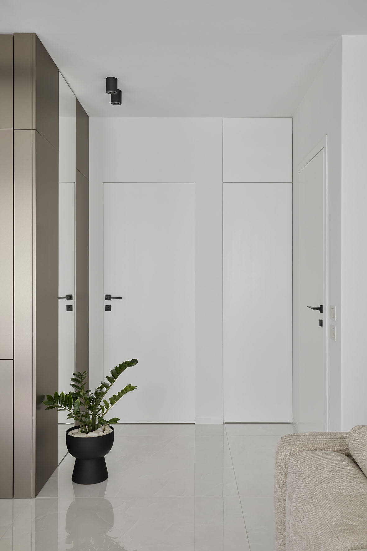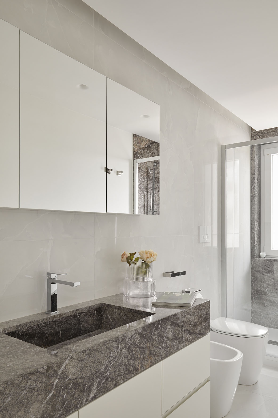 Vicino al centro storico, questo appartamento di una giovane coppia siciliana è caratterizzato da ampi spazi, grandi vetrate, colori neutri e giochi di volumi.Nella zona giorno un volume armadiato a supporto della cucina, rivestito con effetto metallico, nasconde il bagno ospiti e la lavanderia attraverso una porta che si mimetizza tra le ante.La pavimentazione in gres in grande formato effetto onice, grazie al suo colore chiaro e alle venature delicate, uniforma elegantemente l’intero alloggio.I lavabi in marmo dei bagni sono stati realizzati su disegno da artigiani locali, mentre diversi sono gli elementi di design contemporaneo che caratterizzano il resto della casa.Per la luce è stata prevista un’illuminazione più tecnica per le aree di lavoro, affiancata da lampade più decorative ed iconiche creando un’atmosfera calda e accogliente.