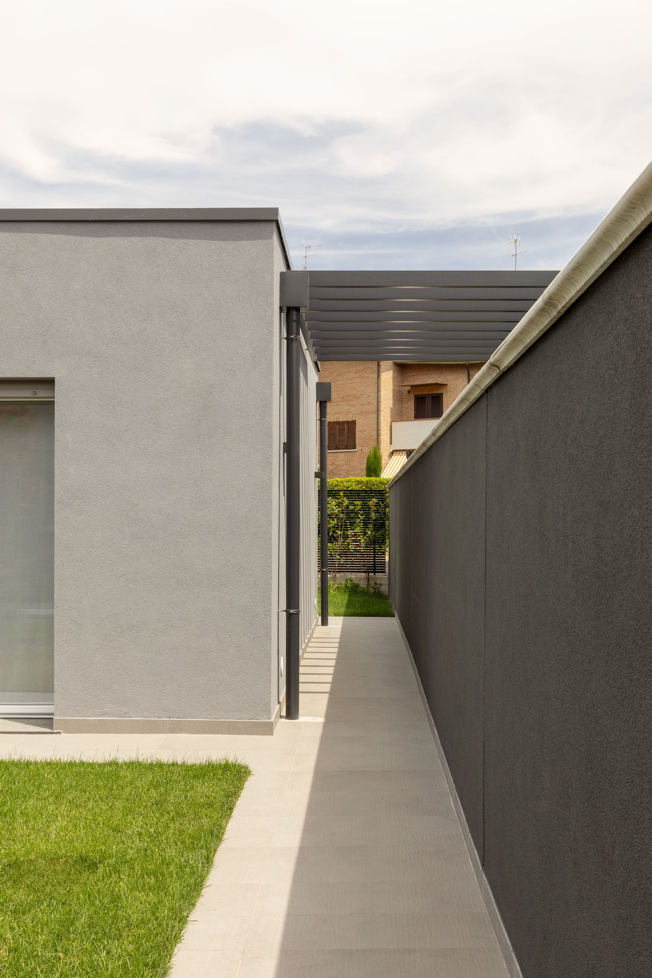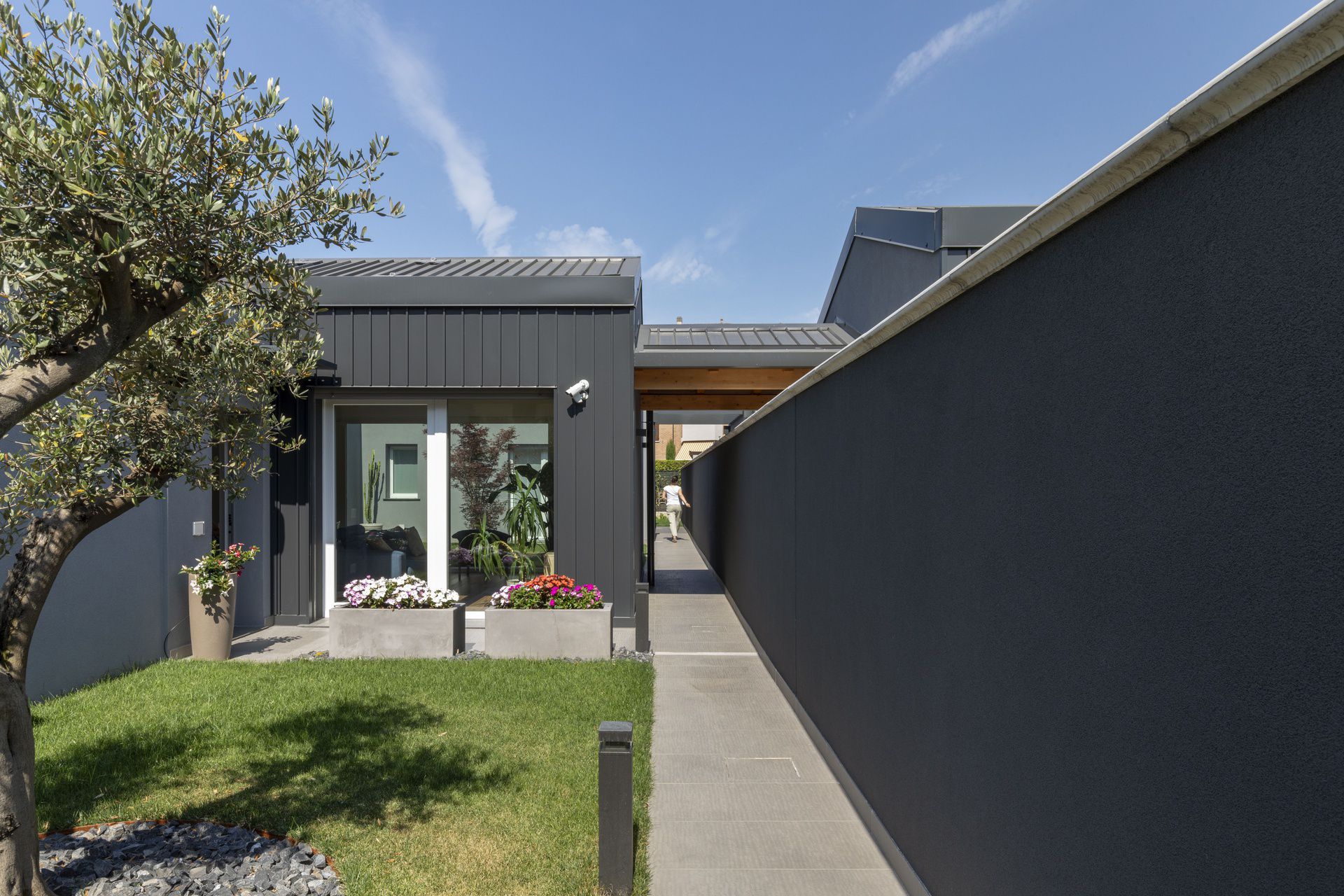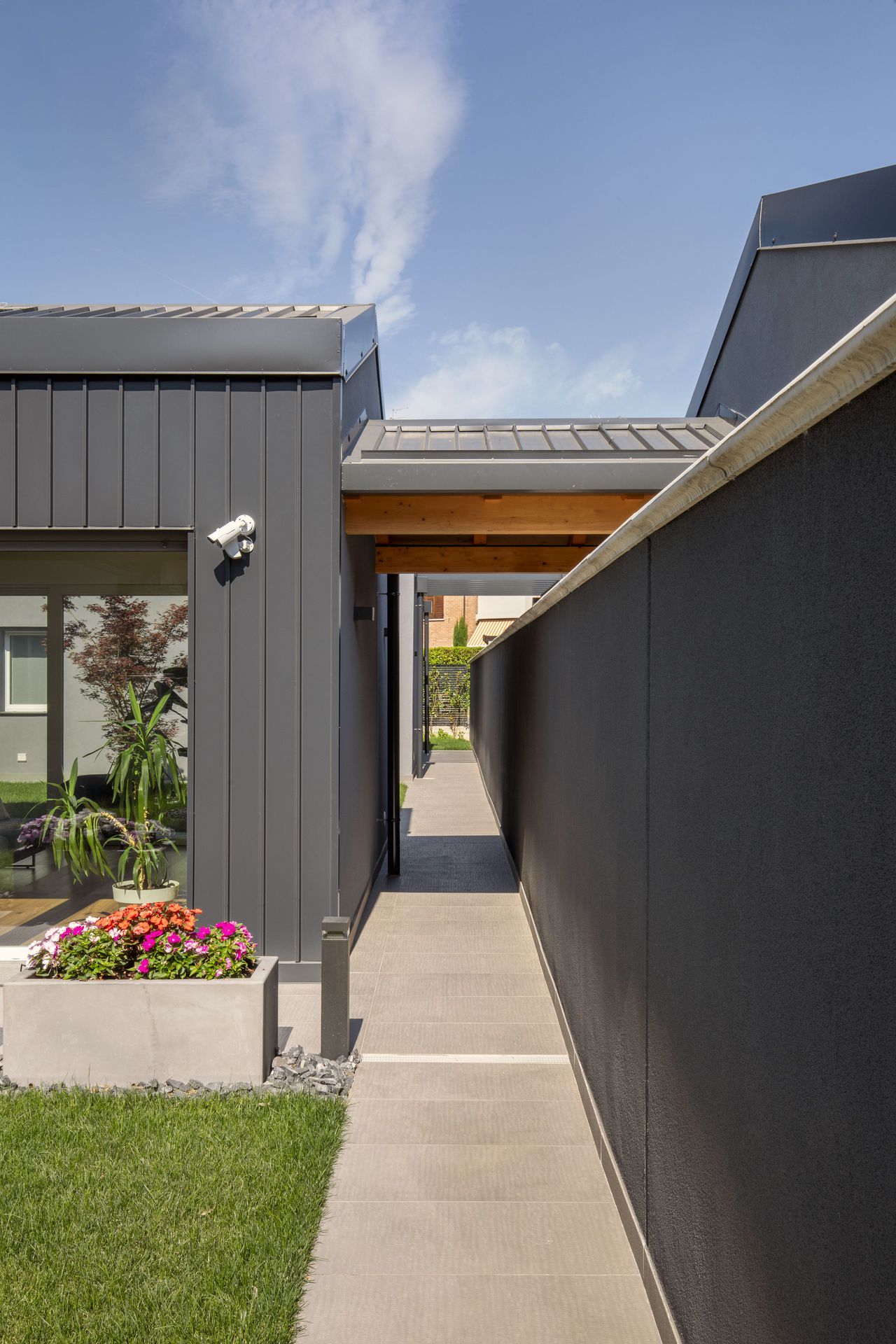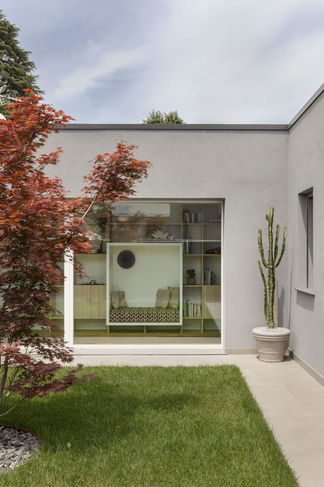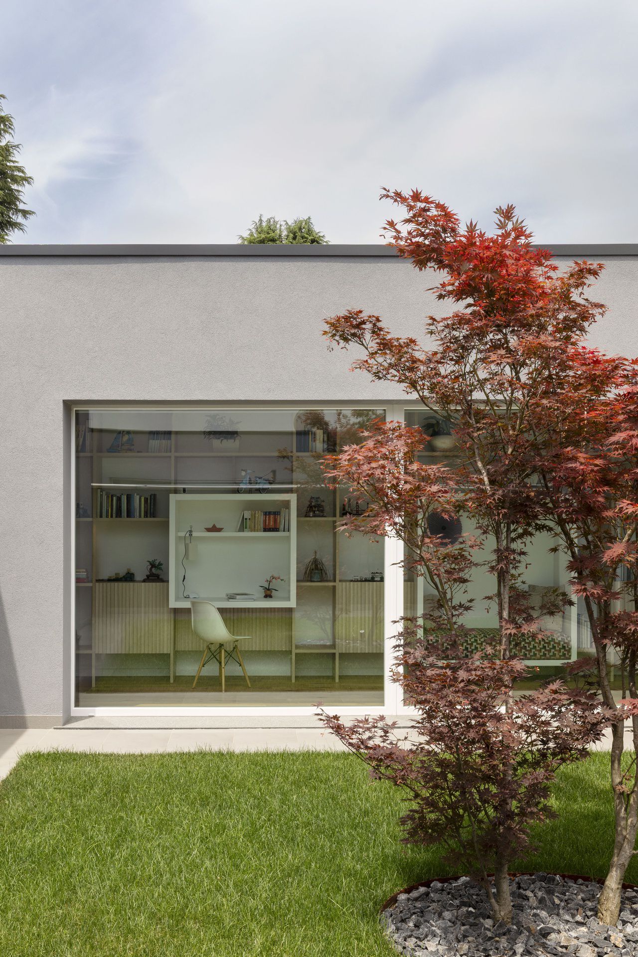 Il progetto di interni di questa villetta è stato sviluppato durante le sua costruzione, permettendo di ottenere un'altissima personalizzazione degli spazi. Gli ambienti principali affacciano su un patio grazie ad ampie vetrate, che rendono l'ambiente esterno parte integrante dell'abitazione.Nel progetto degli interni si è scelto di optare per l'uso predominante del legno, nei rivestimenti e negli arredi, per creare connessione, materica e visiva, con l'area verde esterna.Il living è un grande open space con tetto in legno a falde, che ai suoi estremi ospita rispettivamente la cucina e il salotto.Un lungo corridoio vetrato collega i due volumi di cui è composta la villetta: uno per la zona giorno e uno per la zona notte.Questo spazio è stato valorizzato con una libreria in legno, disegnata appositamente e progettata con un angolo scrivania e un angolo lettura vista giardino.Ogni mobile è stato disegnato e realizzato su misura e presenta caratteristiche e soluzioni che vengono riproposte tra loro, donando così un forte carattere identitario all'intera abitazione.