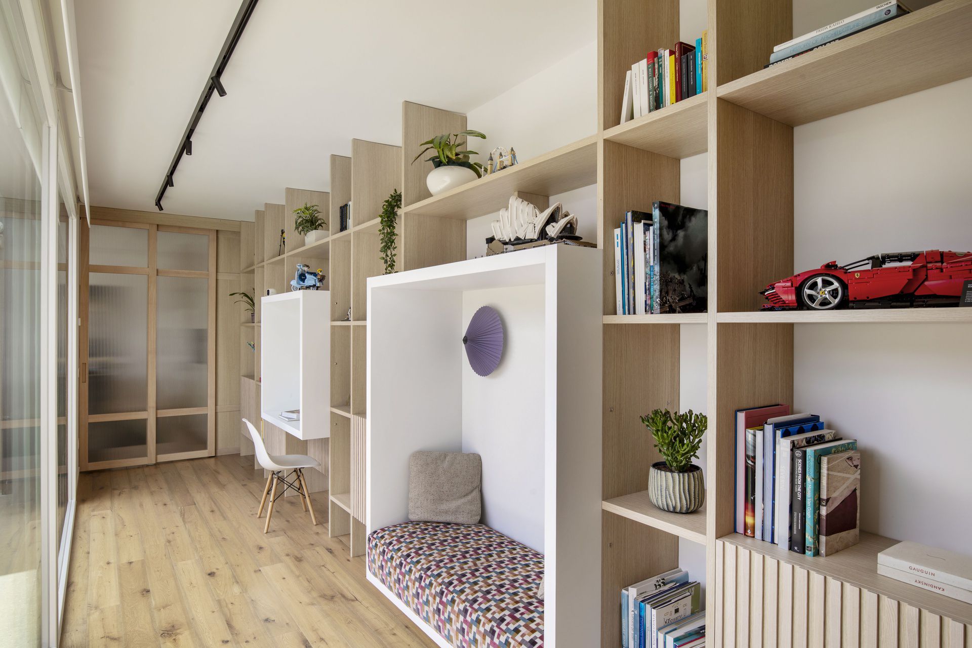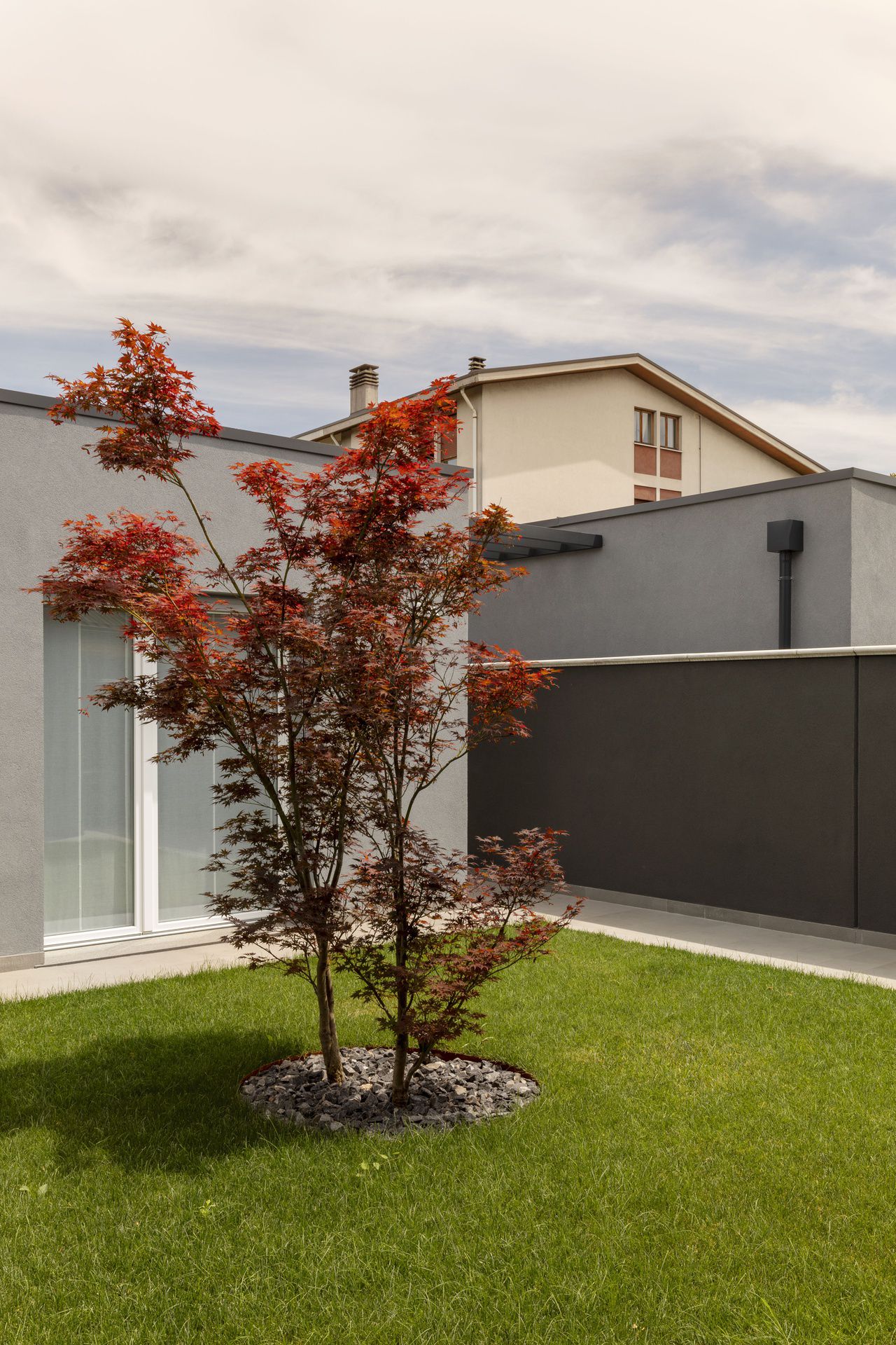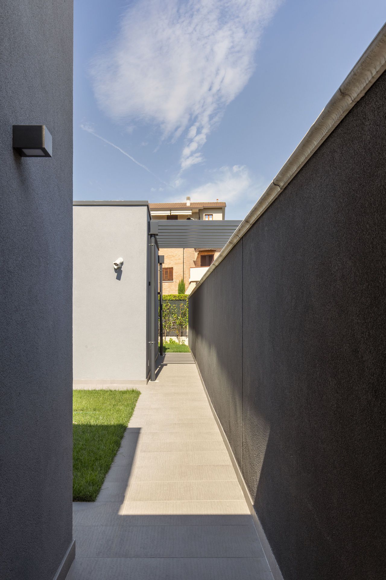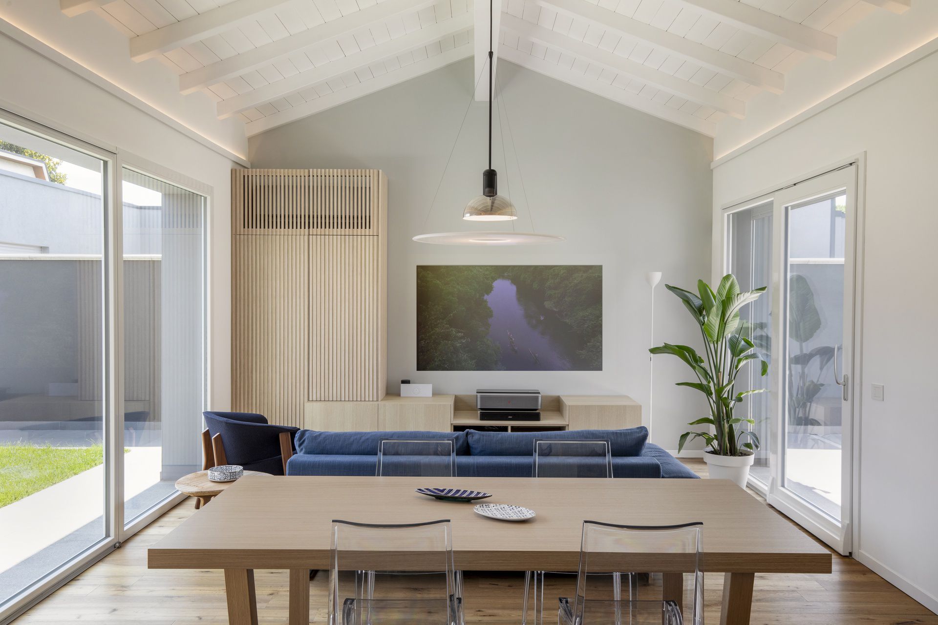 Il progetto di interni di questa villetta è stato sviluppato durante le sua costruzione, permettendo di ottenere un'altissima personalizzazione degli spazi. Gli ambienti principali affacciano su un patio grazie ad ampie vetrate, che rendono l'ambiente esterno parte integrante dell'abitazione.Nel progetto degli interni si è scelto di optare per l'uso predominante del legno, nei rivestimenti e negli arredi, per creare connessione, materica e visiva, con l'area verde esterna.Il living è un grande open space con tetto in legno a falde, che ai suoi estremi ospita rispettivamente la cucina e il salotto.Un lungo corridoio vetrato collega i due volumi di cui è composta la villetta: uno per la zona giorno e uno per la zona notte.Questo spazio è stato valorizzato con una libreria in legno, disegnata appositamente e progettata con un angolo scrivania e un angolo lettura vista giardino.Ogni mobile è stato disegnato e realizzato su misura e presenta caratteristiche e soluzioni che vengono riproposte tra loro, donando così un forte carattere identitario all'intera abitazione.