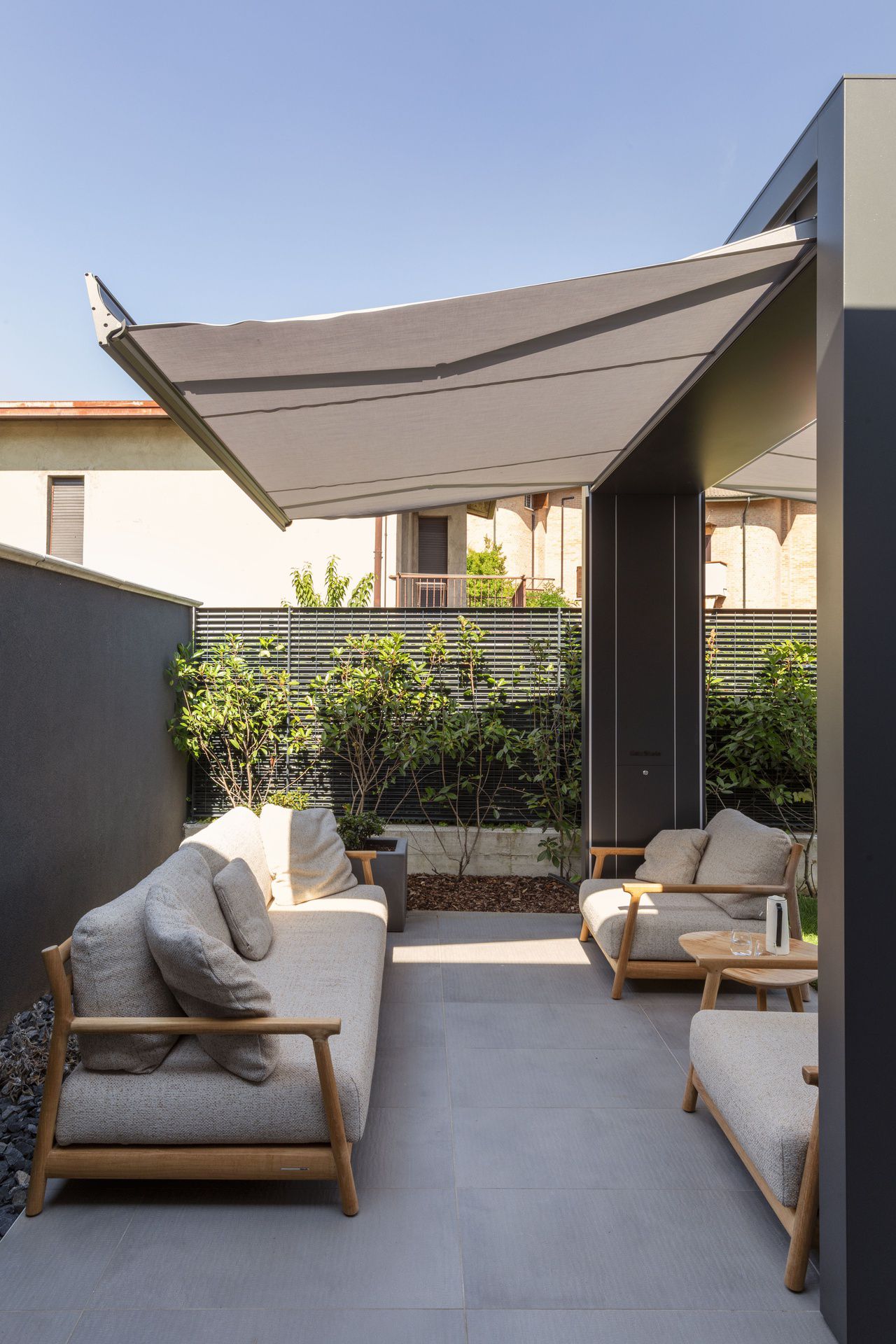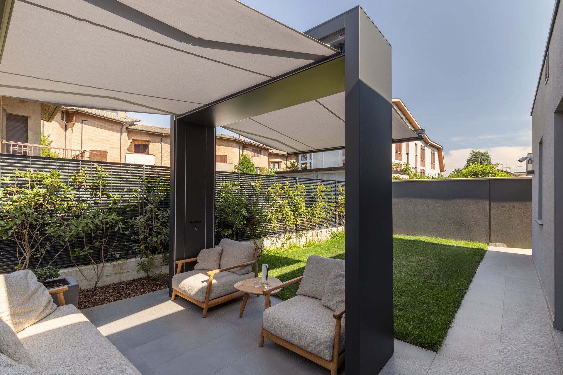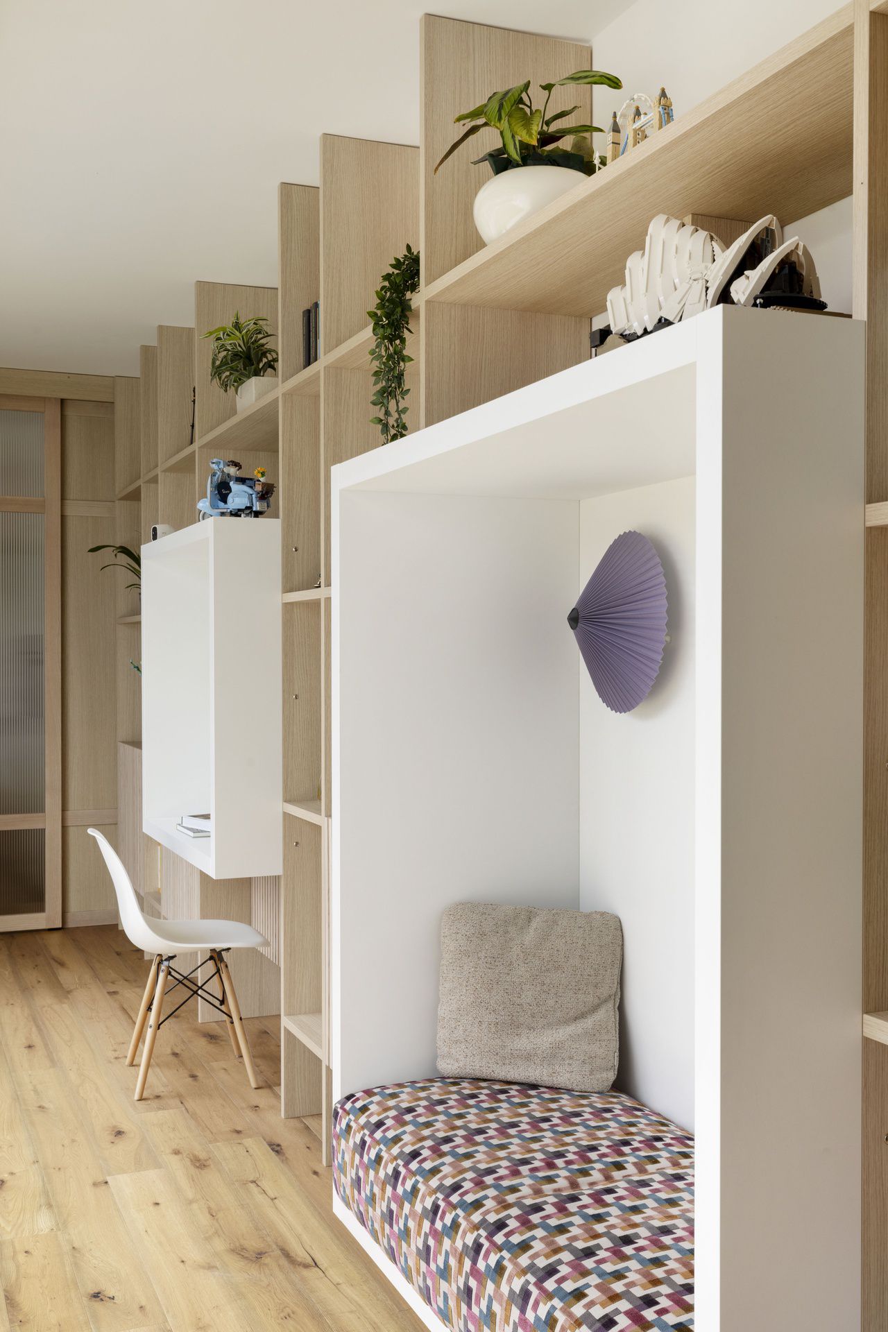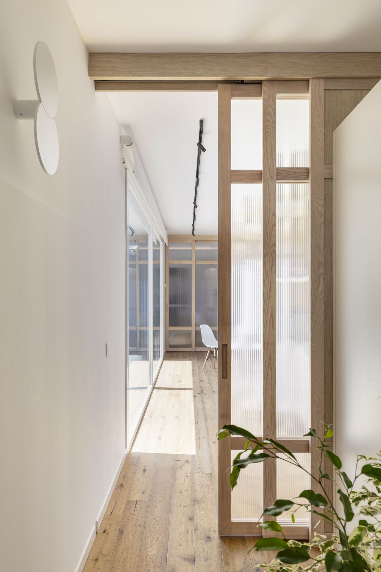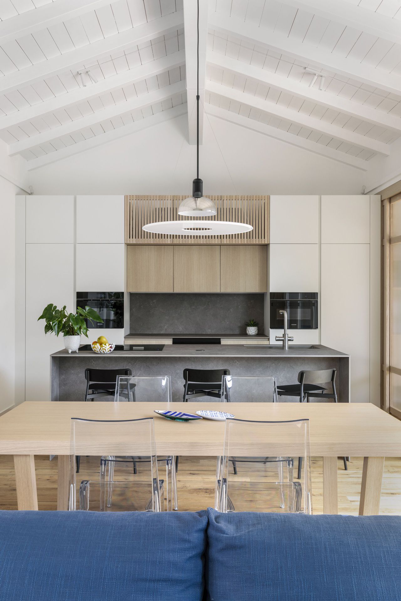 Il progetto di interni di questa villetta è stato sviluppato durante le sua costruzione, permettendo di ottenere un'altissima personalizzazione degli spazi. Gli ambienti principali affacciano su un patio grazie ad ampie vetrate, che rendono l'ambiente esterno parte integrante dell'abitazione.Nel progetto degli interni si è scelto di optare per l'uso predominante del legno, nei rivestimenti e negli arredi, per creare connessione, materica e visiva, con l'area verde esterna.Il living è un grande open space con tetto in legno a falde, che ai suoi estremi ospita rispettivamente la cucina e il salotto.Un lungo corridoio vetrato collega i due volumi di cui è composta la villetta: uno per la zona giorno e uno per la zona notte.Questo spazio è stato valorizzato con una libreria in legno, disegnata appositamente e progettata con un angolo scrivania e un angolo lettura vista giardino.Ogni mobile è stato disegnato e realizzato su misura e presenta caratteristiche e soluzioni che vengono riproposte tra loro, donando così un forte carattere identitario all'intera abitazione.