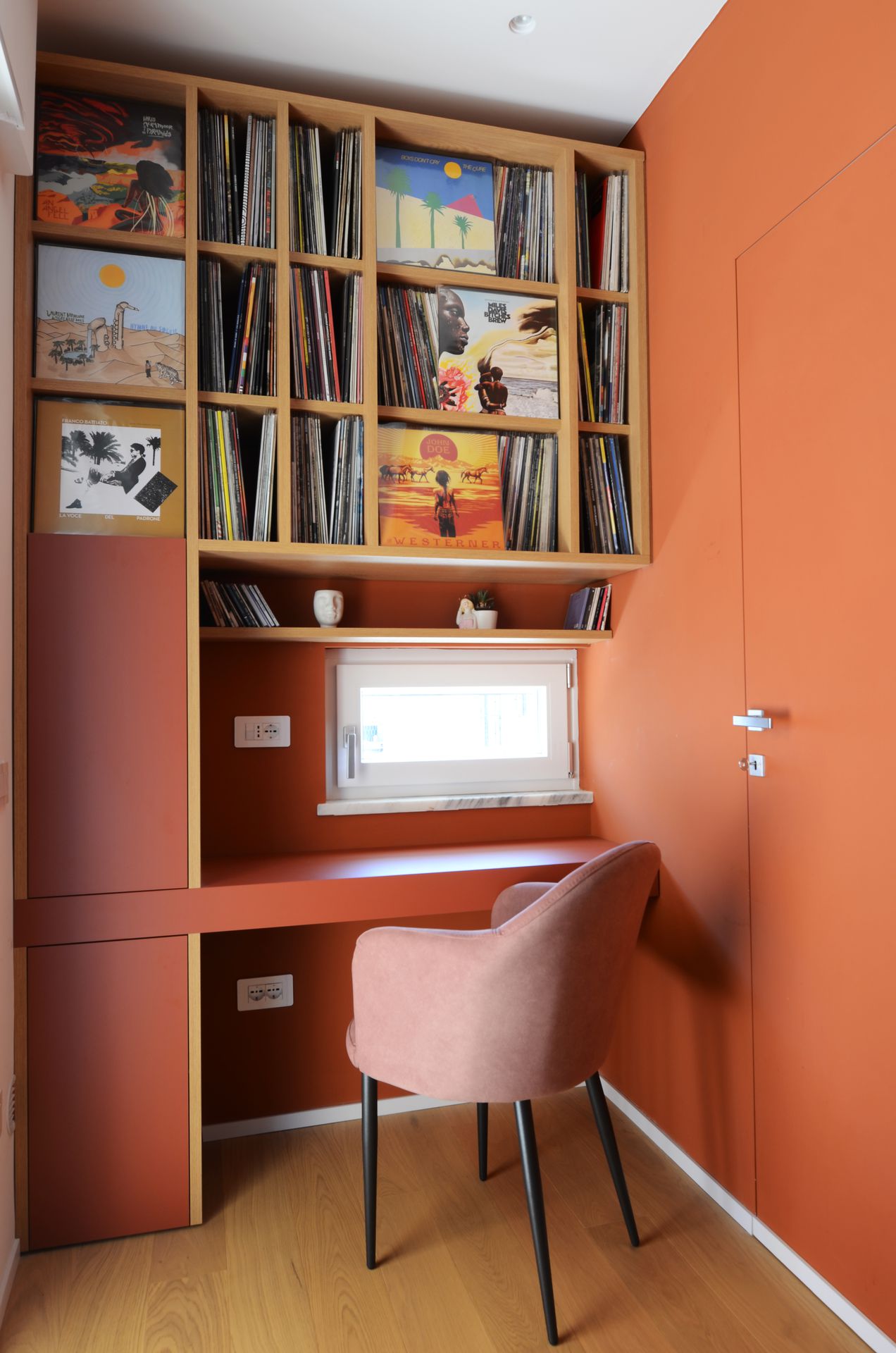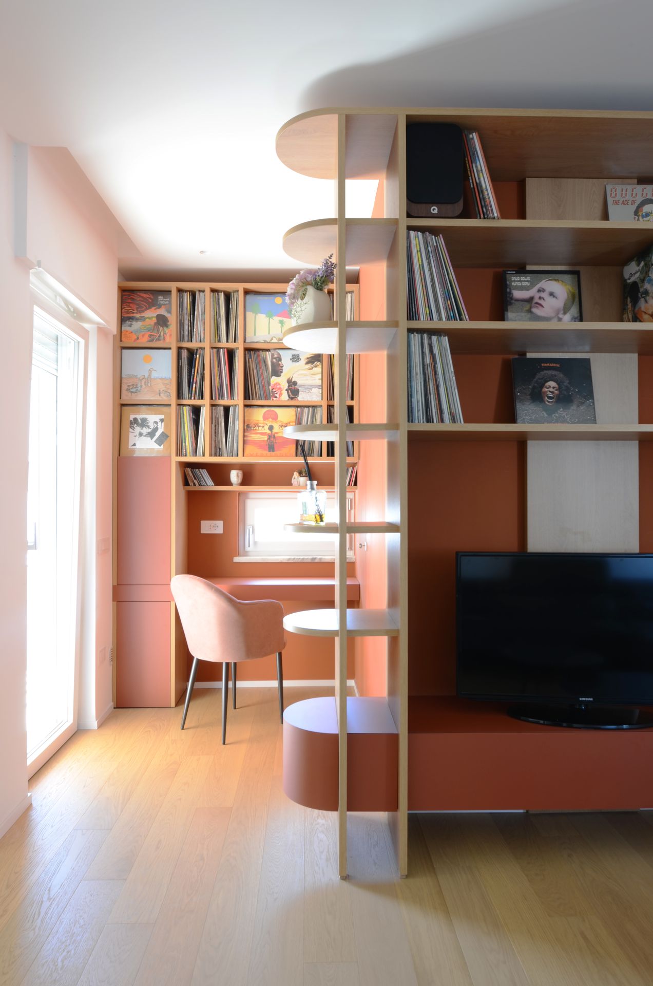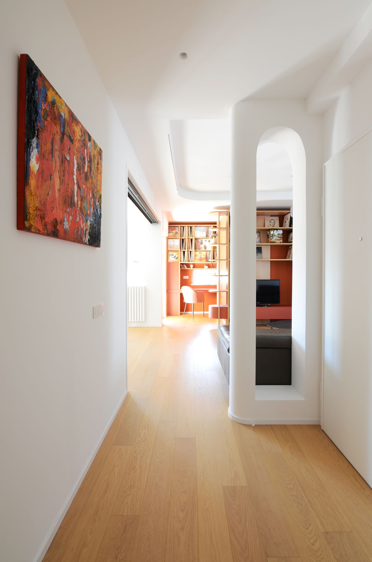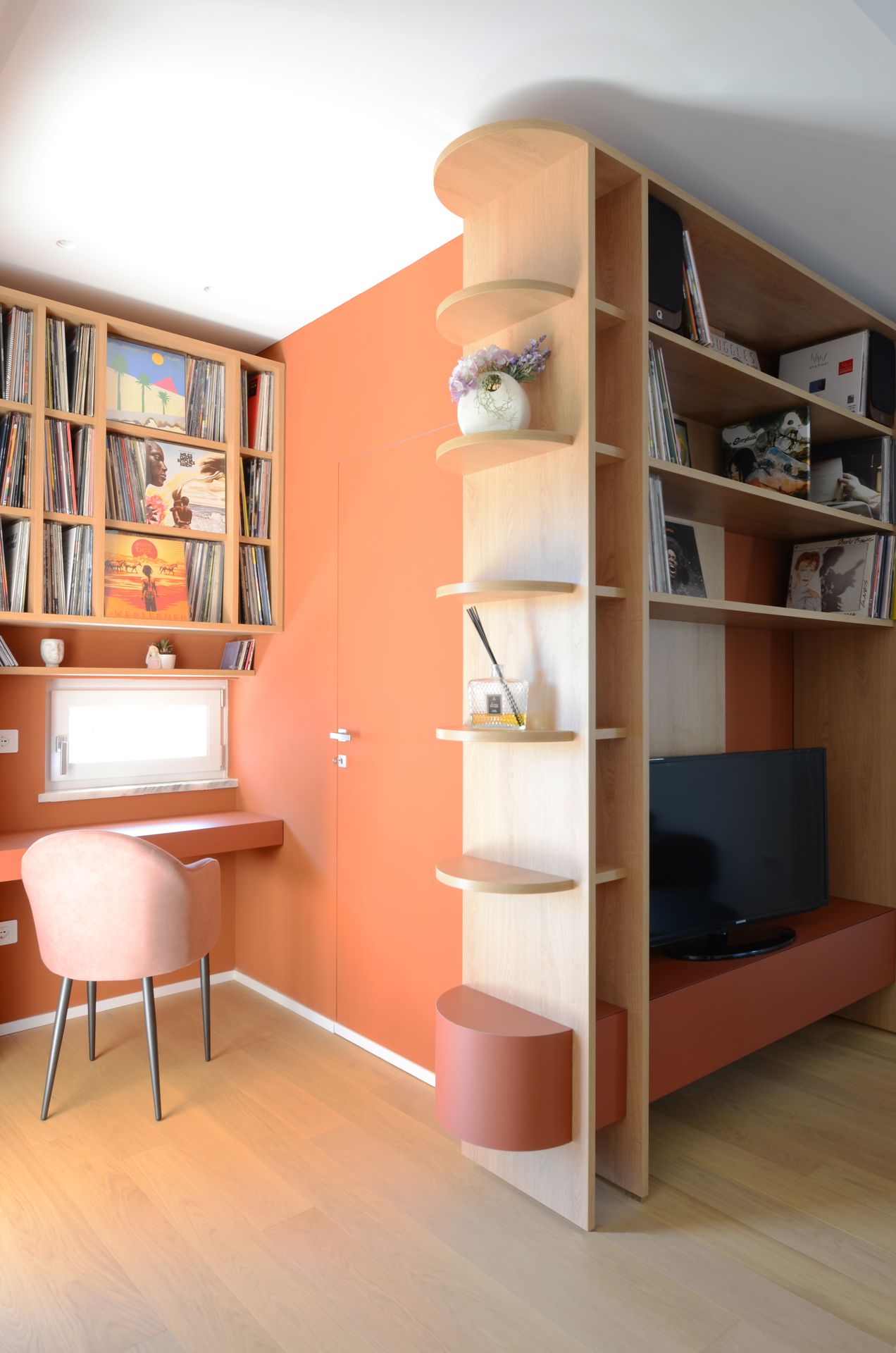 Il progetto nasce dal rientro di una giovane coppia nella propria terra d’origine, dopo un periodo di sospensione collettiva che ha ridefinito priorità e modalità dell’abitare. L’appartamento, costruito negli anni Ottanta, rifletteva un modello ormai superato: sequenze chiuse, gerarchie rigide, spazi incapaci di accogliere una dimensione contemporanea della vita domestica. L’intervento non si limita a una redistribuzione funzionale, ma introduce un nuovo principio ordinatore. Il fulcro del progetto è una collezione musicale — oltre 2500 dischi — che da archivio personale diventa struttura spaziale. La libreria assume così un ruolo ambivalente: elemento di separazione e dispositivo di connessione. Non è un semplice contenitore, ma una soglia abitata, capace di articolare lo spazio e costruire relazioni visive e fisiche tra gli ambienti. Attorno ad essa, la zona giorno si riconfigura come sistema fluido, aperto a diverse modalità d’uso. La casa si adatta, si apre e si chiude. Una porta scorrevole permette di modulare il grado di continuità tra gli spazi principali, introducendo una variabilità che risponde ai ritmi della vita quotidiana. In questo nuovo assetto, la cucina perde il suo carattere marginale e diventa centro relazionale, luogo di condivisione e permanenza. Parallelamente, la zona notte viene ridefinita attraverso una maggiore articolazione funzionale, con la creazione di due ambienti bagno distinti. Il progetto si completa attraverso un uso intenzionale del colore, che non è decorazione ma strumento spaziale. Le superfici contribuiscono a definire profondità, gerarchie e identità, restituendo alla casa un carattere deciso, coerente con quello dei suoi abitanti. L’abitazione si trasforma così in un dispositivo dinamico, in cui memoria, uso e spazio si sovrappongono, costruendo un equilibrio tra dimensione privata e apertura verso l’altro