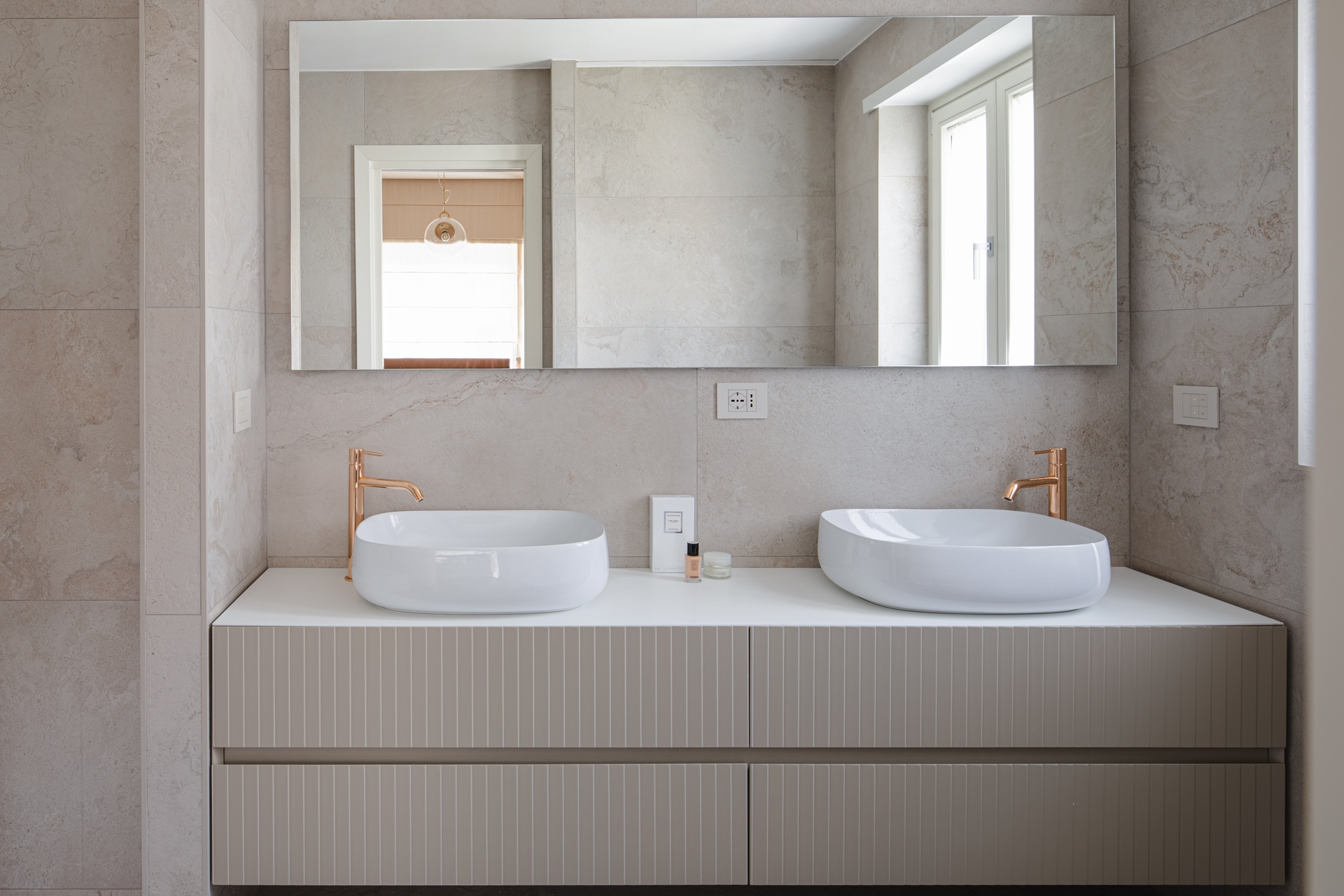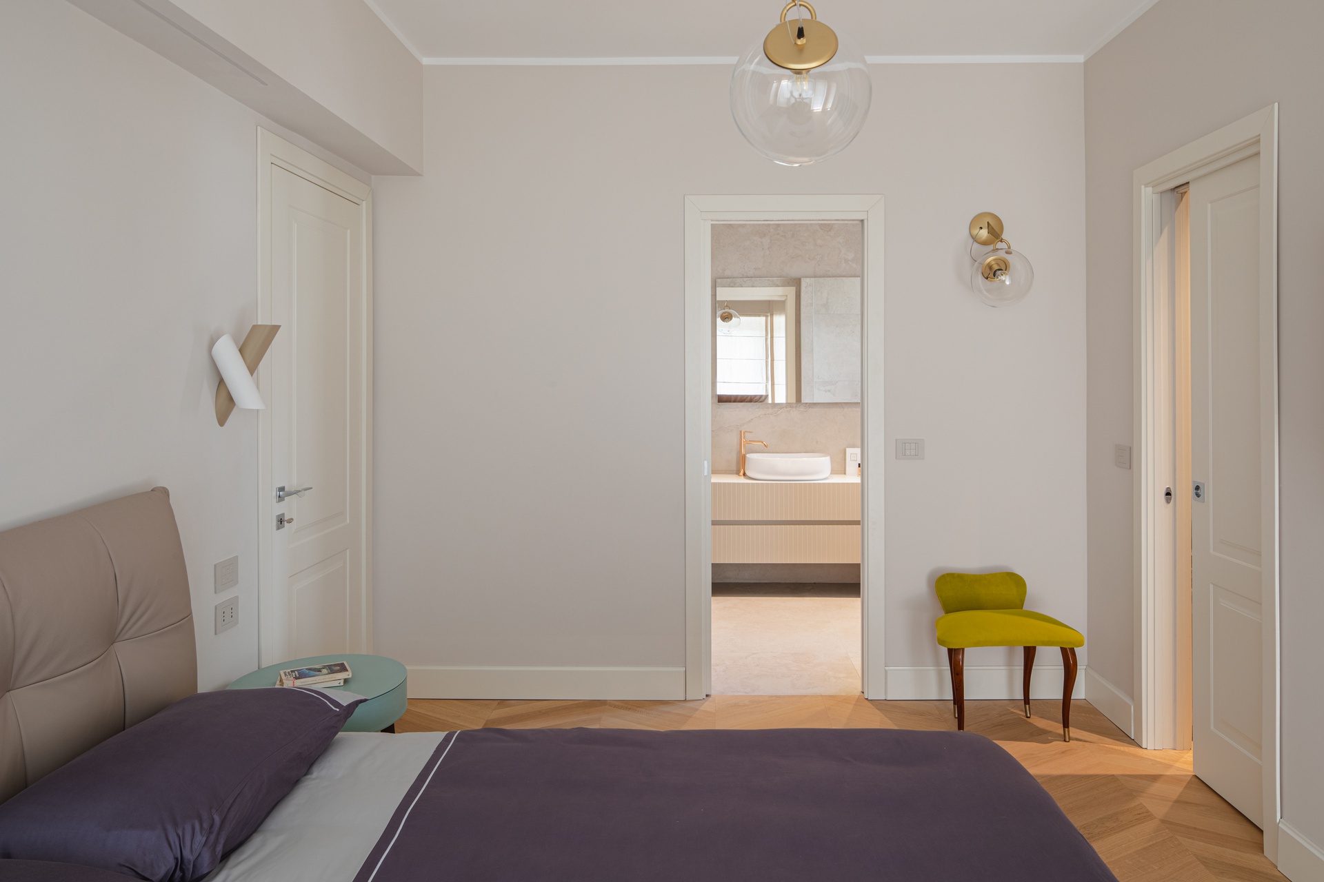 Questo progetto di ristrutturazione crea uno spazio abitativo aperto, luminoso e fluido. La ridistribuzione degli ambienti offre una zona giorno connessa e ariosa, con una cucina elegantemente separata da vetrate. Il design si distingue per l'uso sapiente di colori caldi, materiali raffinati come tessuti e vetro color oro, e dettagli curati come travi rimodellate e arredi su misura. La zona notte include una suite padronale ricercata e camere per bambini personalizzate. L'intero progetto bilancia perfettamente funzionalità ed estetica, creando un ambiente sofisticato e accogliente per tutta la famiglia. Le finiture coerenti si estendono su entrambi i piani, garantendo continuità e armonia in tutto lo spazio abitativo