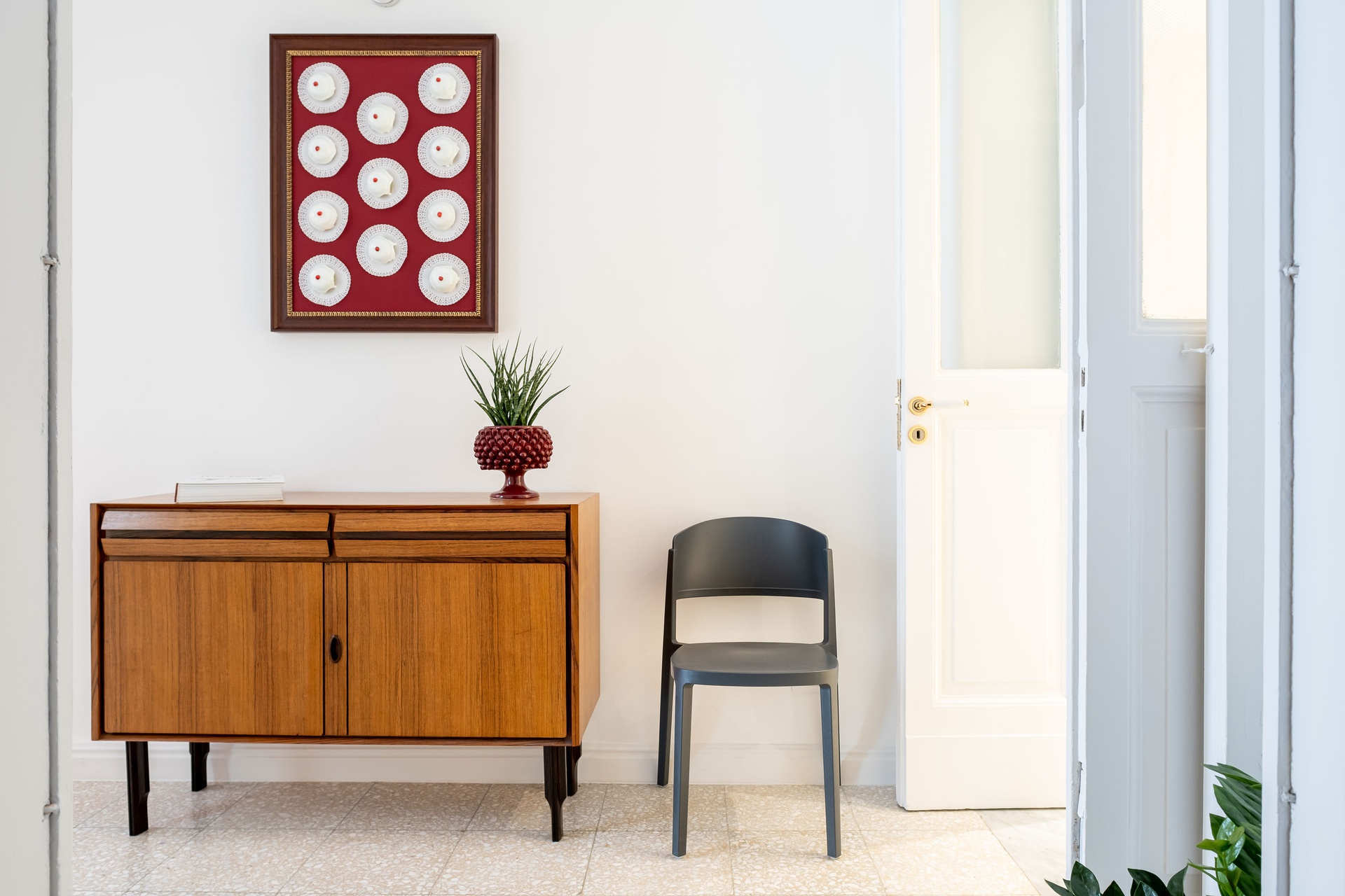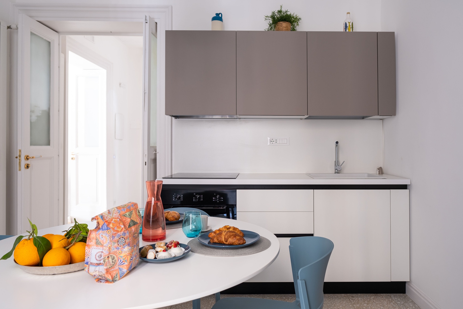“Una casa vacanze dal design minimale e dal dualismo cromatico”Riorganizzazione interna di un appartamento ubicato all’interno di un edificio del 1800 in posizione nevralgica nel centro storico di Catania, nelle immediate vicinanze di piazza Duomo e piazza Università, alle spalle della rinomata, barocca, via Dei Crociferi.Già adibito a struttura ricettiva, si è realizzato un restyling degli interni mantenendo le partizioni esistenti ad eccezione di una piccola rimodulazione dei due bagni. Intervento minimo, organizzato sulla dualità cromatica delle camere e dei servizi associati.Negli arredi un mix di elementi di recupero, oggetti low budget, arredi su progetto e icone del design. Un intervento “in punta di piedi”, non invasivo, nel rispetto dell’esistente. Un progetto caldo, misurato e confortevole concepito per un’utenza internazionale.