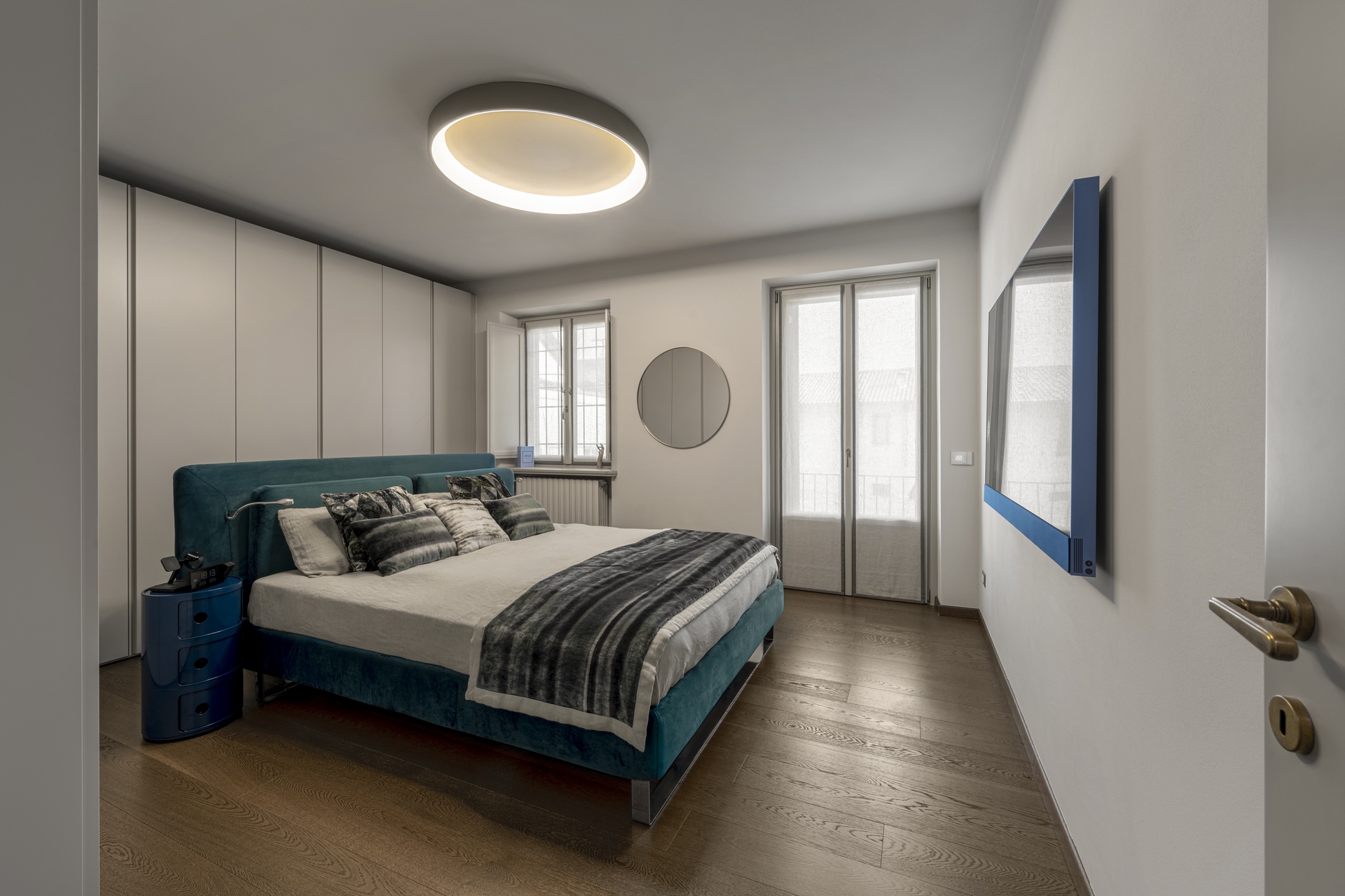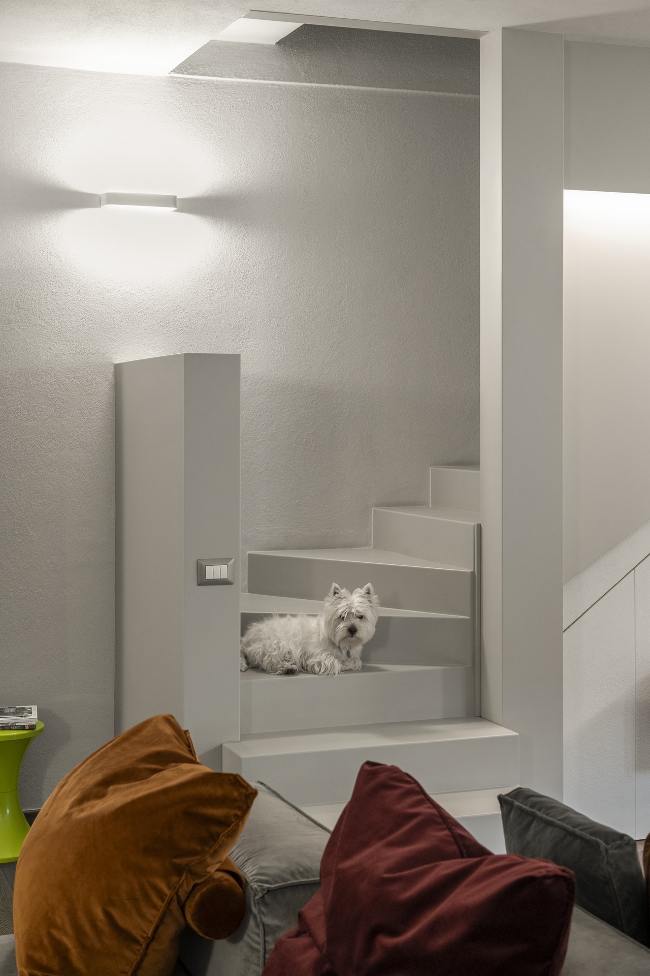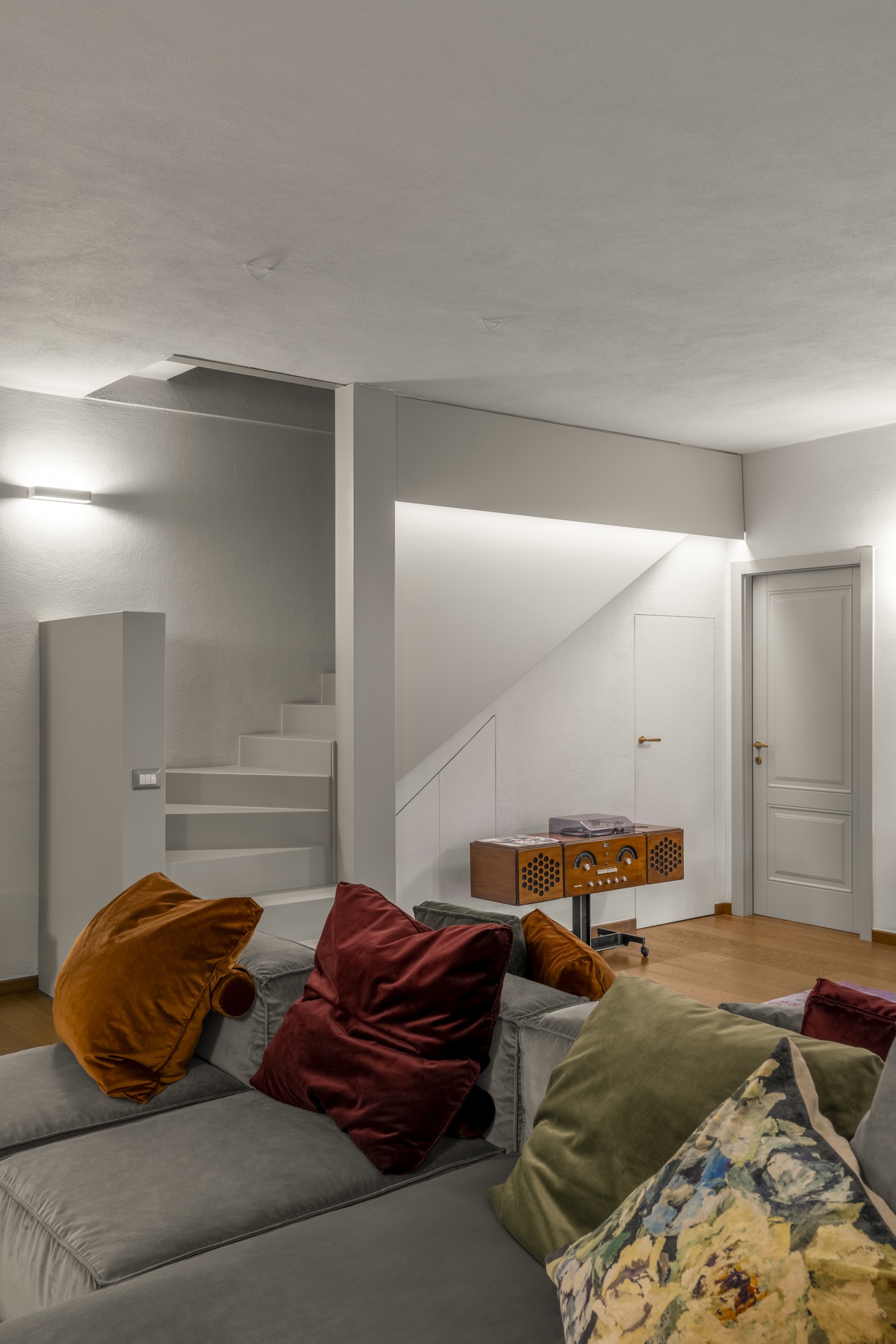 Restyling completo dell’abitazione. Nessuna modifica muraria. Fare un restyling di un’abitazione è forse più difficile di una ristrutturazione. Bisogna stravolgerne completamento l’aspetto, soddisfare le aspettative del cliente e spesso e volentieri si hanno tempi strettissimi. Bisogna dunque saper giocare su colori, luci e materiali. I materiali hanno giocato un ruolo fondamentale per la riuscita di questa scala realizzata su disegno da Cirifer design. La vecchia scala in muratura, con gradini in pietra di Luserna e parapetto anni 70’ in legno, è stata sostituita da una lamiera in metallo laccata RAL. I gradini sono stati interamente rivestiti dalla lamiera in metallo così come il parapetto, Questo è a tutta altezza al piano terra, dove, per nascondere elementi strutturali della casa, è stata realizzata una doppia lamiera dove è stato alloggiata una striscia led che permette di avere una luce indiretta. Al primo piano invece il parapetto diventa una lama sottilissima che fuoriesce dal pavimento enfatizzando il corridoio che porta alle camere. La lamierà è levigata in tutte le superfici e verniciata a polvere con successivo passaggio in forno a 220° (un trattamento ad altissima resistenza all’usura non ottenibile con le tradizionali verniciature)Il risultato ottenuto è una scala minimale di grande impatto estetico.Al piano terra, la presenza di un arco con rivestimento in mattoni, non riscontrava il gusto del committente da anni. Dopo alcune valutazioni di differenti rivestimenti, si è optato per una scelta molto semplice ma dal grande impatto. Una rasatura dei mattoni e successiva tinteggiatura come le pareti ha conferito a quest’arco un aspetto moderno valorizzandone i punti di vista principali (vista da cucina a soggiorno e viceversa).A concludere il restyling del piano terra, l’illuminazione e l’arredamento. Un grande divano bifacciale, il Reef di Flexteam valorizza il soggiorno dalle dimensioni generose.La caratteristica di questo divano è quello di modularlo a seconda dello spazio a disposizione e delle esigenze di chi lo vivrà. E’ stato infatti configurato secondo gusti e abitudini di questa famiglia che ama trascorrere del tempo guardando film. La possibilità di averlo bifacciale, in questo contesto, permette di sfruttare completamente l’ingresso non lasciando zone prettamente di passaggio ma inglobandolo con il soggiorno. Una consolle di Riflessi e la madia Rigadin di Alf daFrè completa l’arredamento del soggiorno. Illuminazione a parete applique Frame di Rotaliana. Completa il piano terra una bellissima cucina Lacanche.Salendo al primo piano troviamo due camere da letto e uno studio. La camera da letto padronale è stata progettata in funzione alla richiesta del committente che necessitava di un grande spazio contenitivo. Dopo numerose soluzioni, tra cui quella di realizzare una quinta in cartongesso per creare una cabina armadio, si è optato per spostare in letto in centro stanza (viste le generose dimensioni) e realizzare su disegno un armadio ad angolo (Tomasella) con profondità diverse. Lampadario plafone Affralux Band Diondi color sabbia. Letto Samoa Lift flux con luci per lettura. Comodini Kartell La camera da letto delle due gemelle doveva rispecchiare le loro esigenze, ossia due letti da una piazza e mezza (Me di Noctis, cuscini Romo) e due consolle con cassetto per realizzare una zona trucco ad entrambe. La posizione dei letti permette di muoversi comodamente nello spazio.La terza camera, è stata adibita ad uso studio. Molto spazio contenitivo e una grande scrivania per due. A completare l’arredamento libreria Charlotte di Bontempi e sedie Drop di Bontempi. Pavimentazione parquet vernice all’acqua, colorazione a campione color tabacco.