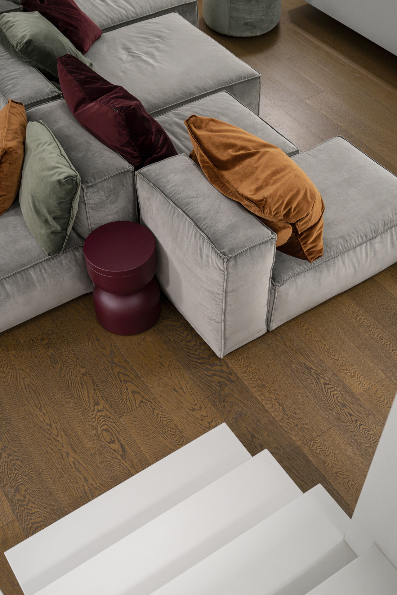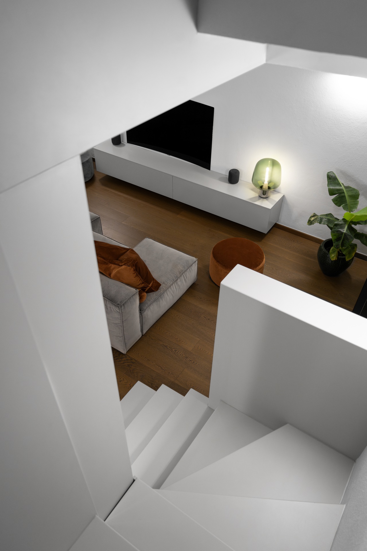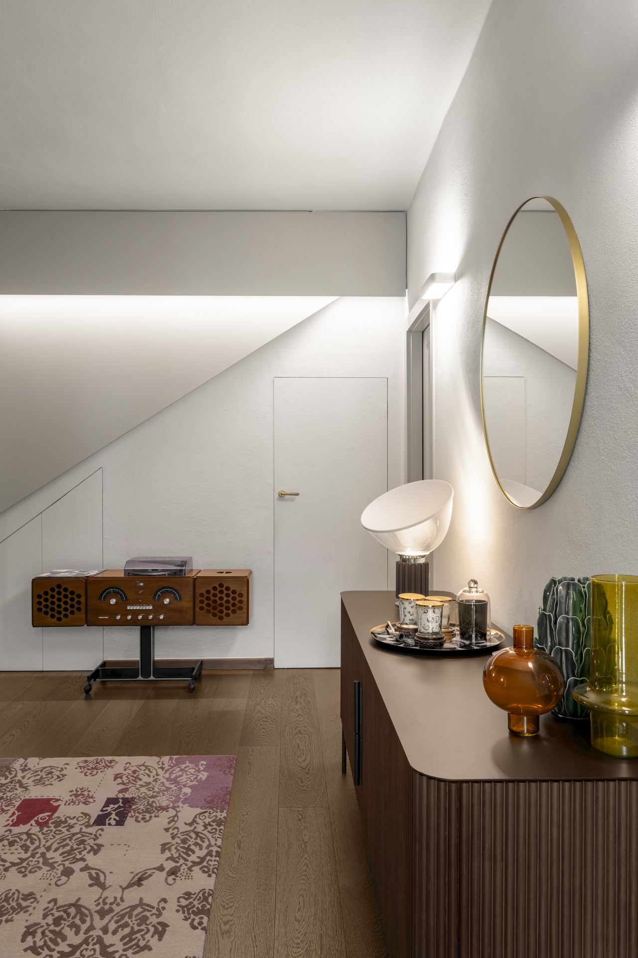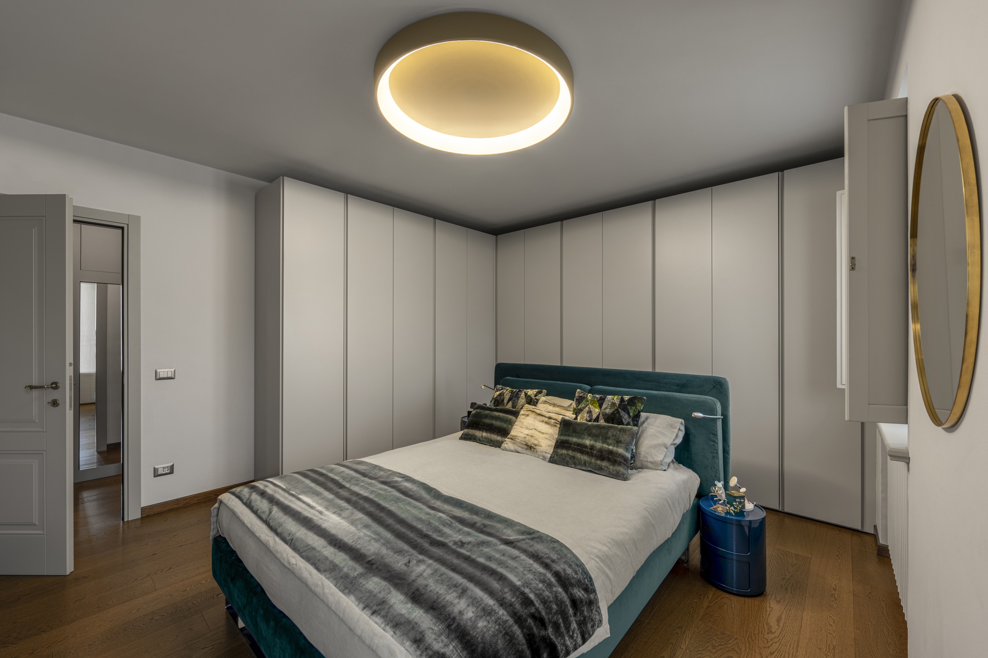 Restyling completo dell’abitazione. Nessuna modifica muraria. Fare un restyling di un’abitazione è forse più difficile di una ristrutturazione. Bisogna stravolgerne completamento l’aspetto, soddisfare le aspettative del cliente e spesso e volentieri si hanno tempi strettissimi. Bisogna dunque saper giocare su colori, luci e materiali. I materiali hanno giocato un ruolo fondamentale per la riuscita di questa scala realizzata su disegno da Cirifer design. La vecchia scala in muratura, con gradini in pietra di Luserna e parapetto anni 70’ in legno, è stata sostituita da una lamiera in metallo laccata RAL. I gradini sono stati interamente rivestiti dalla lamiera in metallo così come il parapetto, Questo è a tutta altezza al piano terra, dove, per nascondere elementi strutturali della casa, è stata realizzata una doppia lamiera dove è stato alloggiata una striscia led che permette di avere una luce indiretta. Al primo piano invece il parapetto diventa una lama sottilissima che fuoriesce dal pavimento enfatizzando il corridoio che porta alle camere. La lamierà è levigata in tutte le superfici e verniciata a polvere con successivo passaggio in forno a 220° (un trattamento ad altissima resistenza all’usura non ottenibile con le tradizionali verniciature)Il risultato ottenuto è una scala minimale di grande impatto estetico.Al piano terra, la presenza di un arco con rivestimento in mattoni, non riscontrava il gusto del committente da anni. Dopo alcune valutazioni di differenti rivestimenti, si è optato per una scelta molto semplice ma dal grande impatto. Una rasatura dei mattoni e successiva tinteggiatura come le pareti ha conferito a quest’arco un aspetto moderno valorizzandone i punti di vista principali (vista da cucina a soggiorno e viceversa).A concludere il restyling del piano terra, l’illuminazione e l’arredamento. Un grande divano bifacciale, il Reef di Flexteam valorizza il soggiorno dalle dimensioni generose.La caratteristica di questo divano è quello di modularlo a seconda dello spazio a disposizione e delle esigenze di chi lo vivrà. E’ stato infatti configurato secondo gusti e abitudini di questa famiglia che ama trascorrere del tempo guardando film. La possibilità di averlo bifacciale, in questo contesto, permette di sfruttare completamente l’ingresso non lasciando zone prettamente di passaggio ma inglobandolo con il soggiorno. Una consolle di Riflessi e la madia Rigadin di Alf daFrè completa l’arredamento del soggiorno. Illuminazione a parete applique Frame di Rotaliana. Completa il piano terra una bellissima cucina Lacanche.Salendo al primo piano troviamo due camere da letto e uno studio. La camera da letto padronale è stata progettata in funzione alla richiesta del committente che necessitava di un grande spazio contenitivo. Dopo numerose soluzioni, tra cui quella di realizzare una quinta in cartongesso per creare una cabina armadio, si è optato per spostare in letto in centro stanza (viste le generose dimensioni) e realizzare su disegno un armadio ad angolo (Tomasella) con profondità diverse. Lampadario plafone Affralux Band Diondi color sabbia. Letto Samoa Lift flux con luci per lettura. Comodini Kartell La camera da letto delle due gemelle doveva rispecchiare le loro esigenze, ossia due letti da una piazza e mezza (Me di Noctis, cuscini Romo) e due consolle con cassetto per realizzare una zona trucco ad entrambe. La posizione dei letti permette di muoversi comodamente nello spazio.La terza camera, è stata adibita ad uso studio. Molto spazio contenitivo e una grande scrivania per due. A completare l’arredamento libreria Charlotte di Bontempi e sedie Drop di Bontempi. Pavimentazione parquet vernice all’acqua, colorazione a campione color tabacco.
