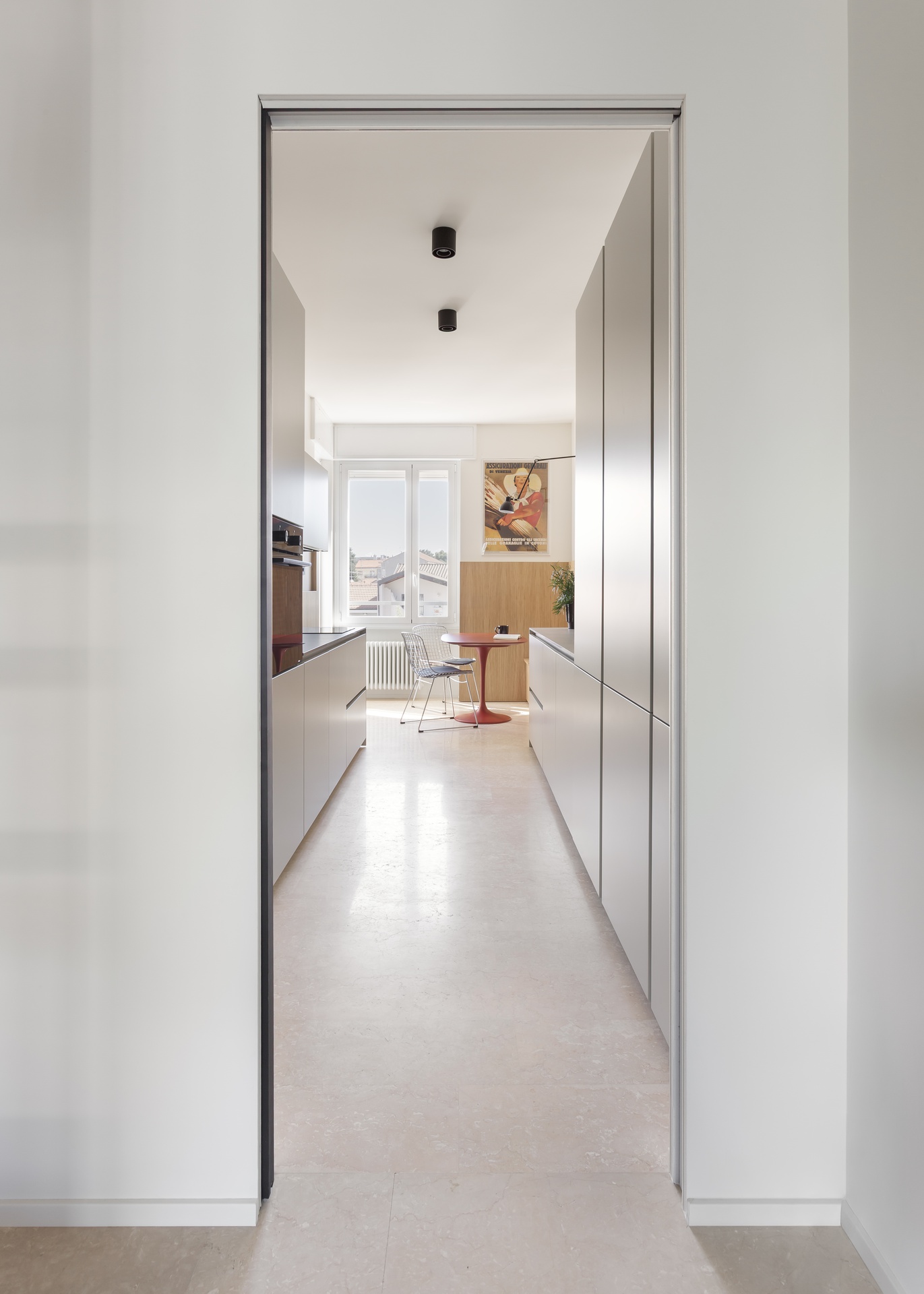 La ristrutturazione di questo appartamento anni ’70 è stata guidata dal desiderio di conservare la memoria del luogo, portandola però dentro un linguaggio contemporaneo. Il layout è stato solo leggermente modificato, così da rispettare la distribuzione originale degli spazi e mantenere quella riconoscibile impronta anni ’70 che lo caratterizzava. I vecchi marmi sono stati preservati e valorizzati, diventando protagonisti di un dialogo materico che collega passato e presente.Il colore del soffitto, cifra stilistica forte e identitaria, è stato ripreso come elemento guida nella scelta degli arredi e delle finiture, generando un mood coerente e raffinato. Gli arredi sono stati progettati su misura per adattarsi perfettamente agli spazi e alle esigenze attuali, in un equilibrio tra funzionalità ed estetica. Alcuni pezzi storici, come il tavolo da pranzo e il letto, sono stati recuperati e riverniciati, integrandosi armoniosamente con i nuovi inserimenti.Nei bagni, le piastrelle dal sapore anni ’70 sono state reinterpretate per conservare l’atmosfera originale, ma con un approccio più leggero e attuale. L’intero progetto racconta così una trasformazione rispettosa: un appartamento che non rinnega le proprie radici, ma che le reinterpreta con delicatezza, dando vita a un ambiente elegante, personale e senza tempo.