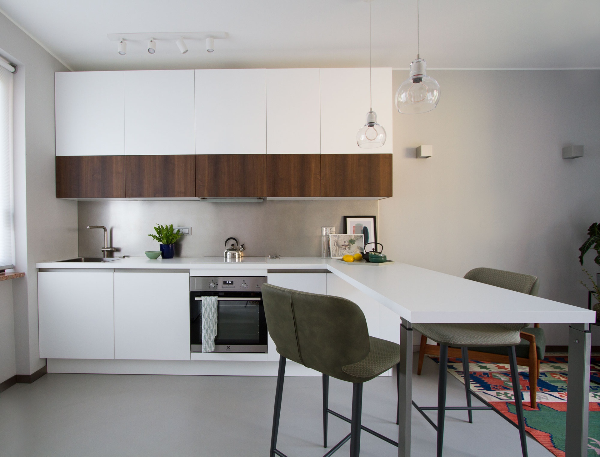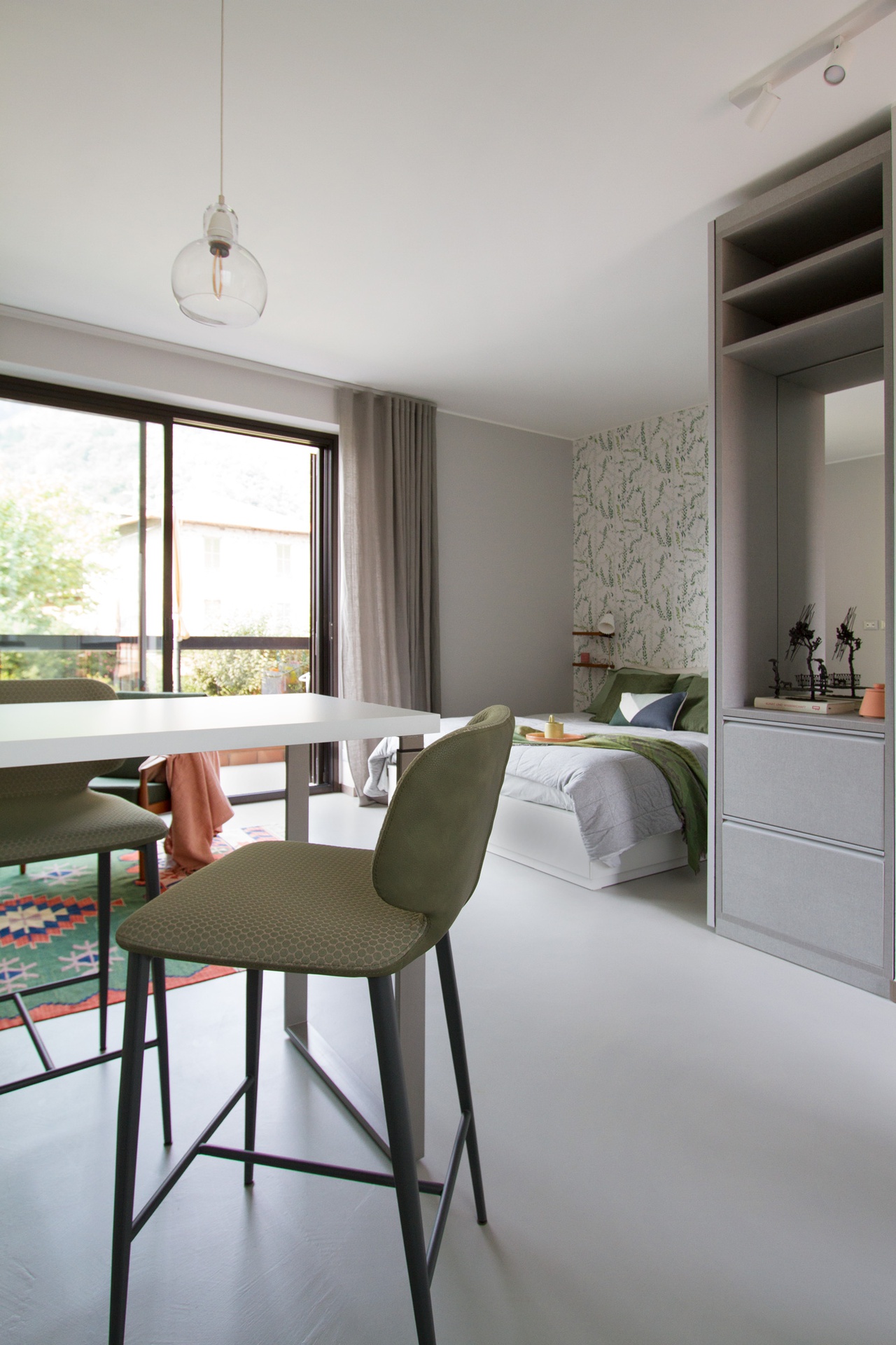 La casa vicino al lago è stata acquistata per trascorrere le vacanze. Nonostante le misure modeste contiene cucina, camera da letto, piccolo soggiorno e bagno.Il cliente aveva gia una idea chiara su interni – uno spazio moderno con tocco vintage. Infatti abbiamo partito dalle due poltrone acquistate dalla proprietaria e il loro colore verde che è replicato nella zona letto e bagno.La casa contiene tanti spazi contenitore sia in cucina, che nell’armadio fatto su misura con un fianco con lo specchio e le mensole.Appartamento moderno e luminoso ha tutte le funzioni necessarie grazie alla progettazione premurosa. La sua invitante atmosfera è creata con finiture calde e tessuti tattili e vivaci. Pavimento in resina è molto comodo per la vita quotidiana e bilancia i dettagli colorati dell’appartamento.