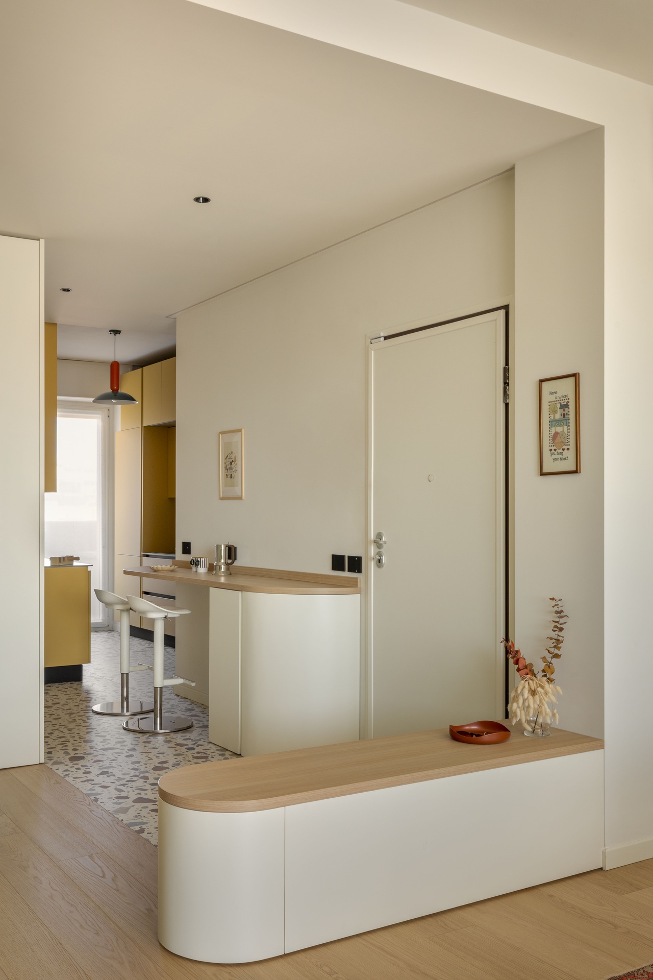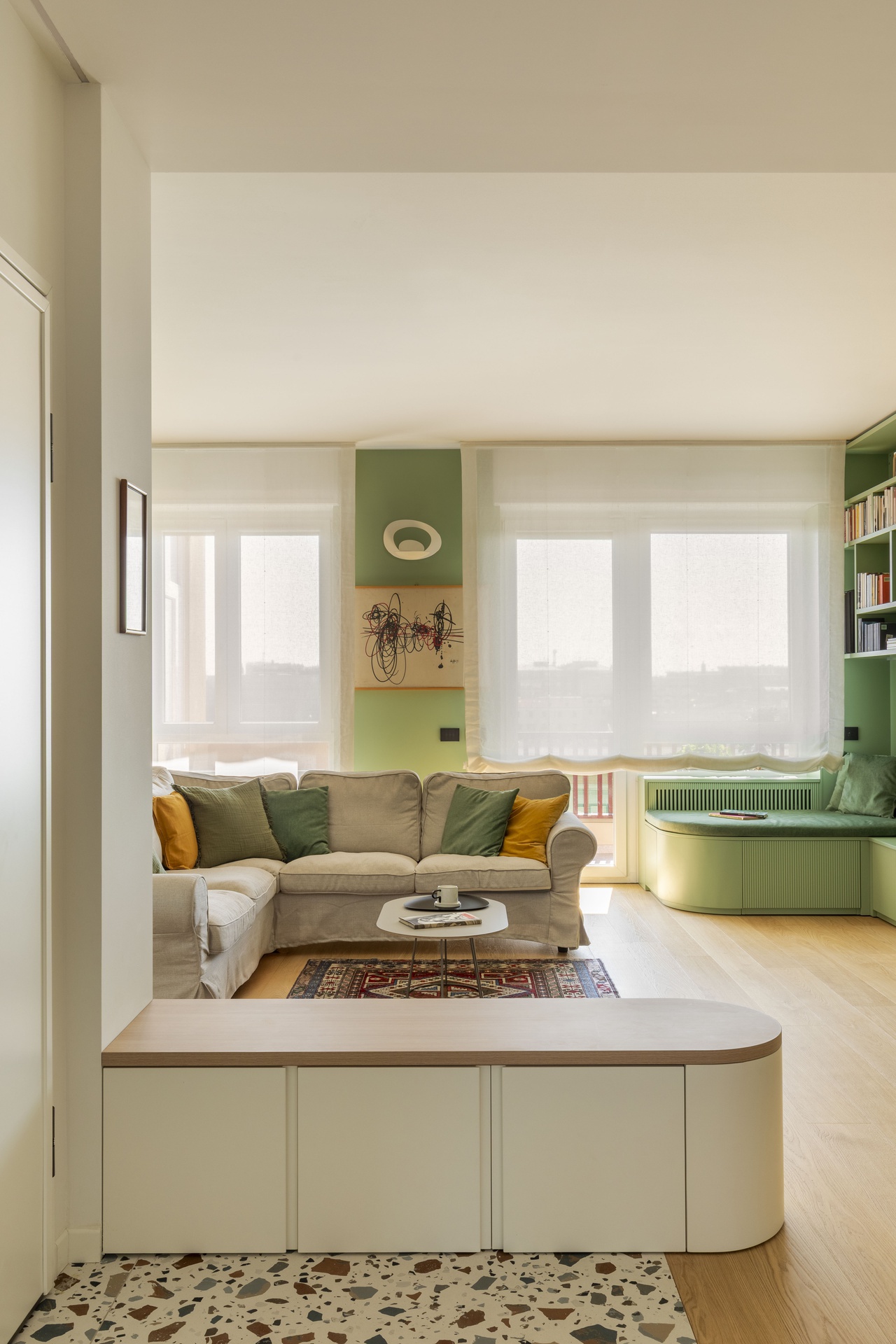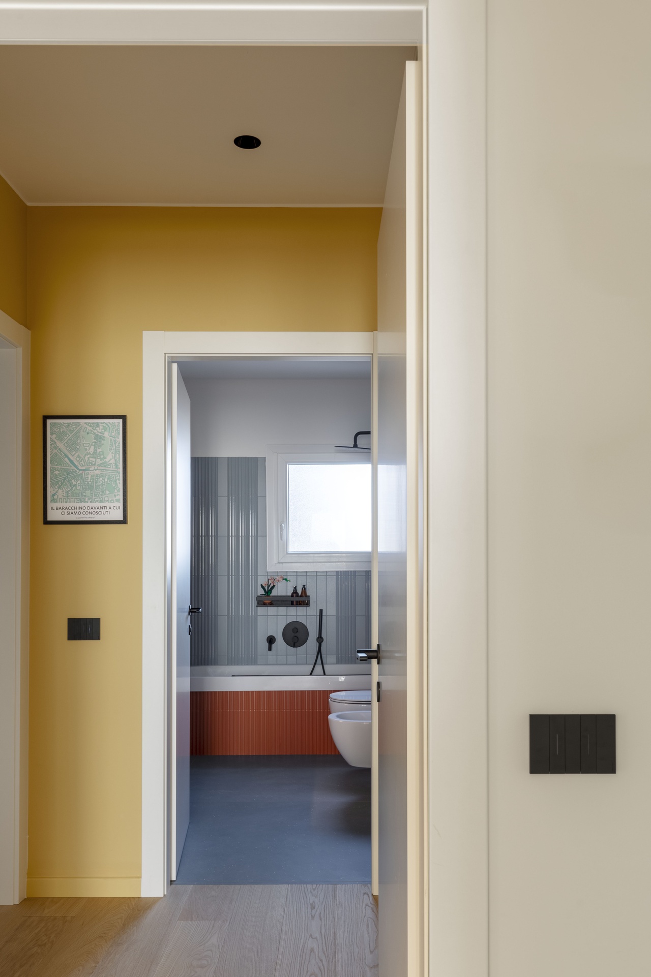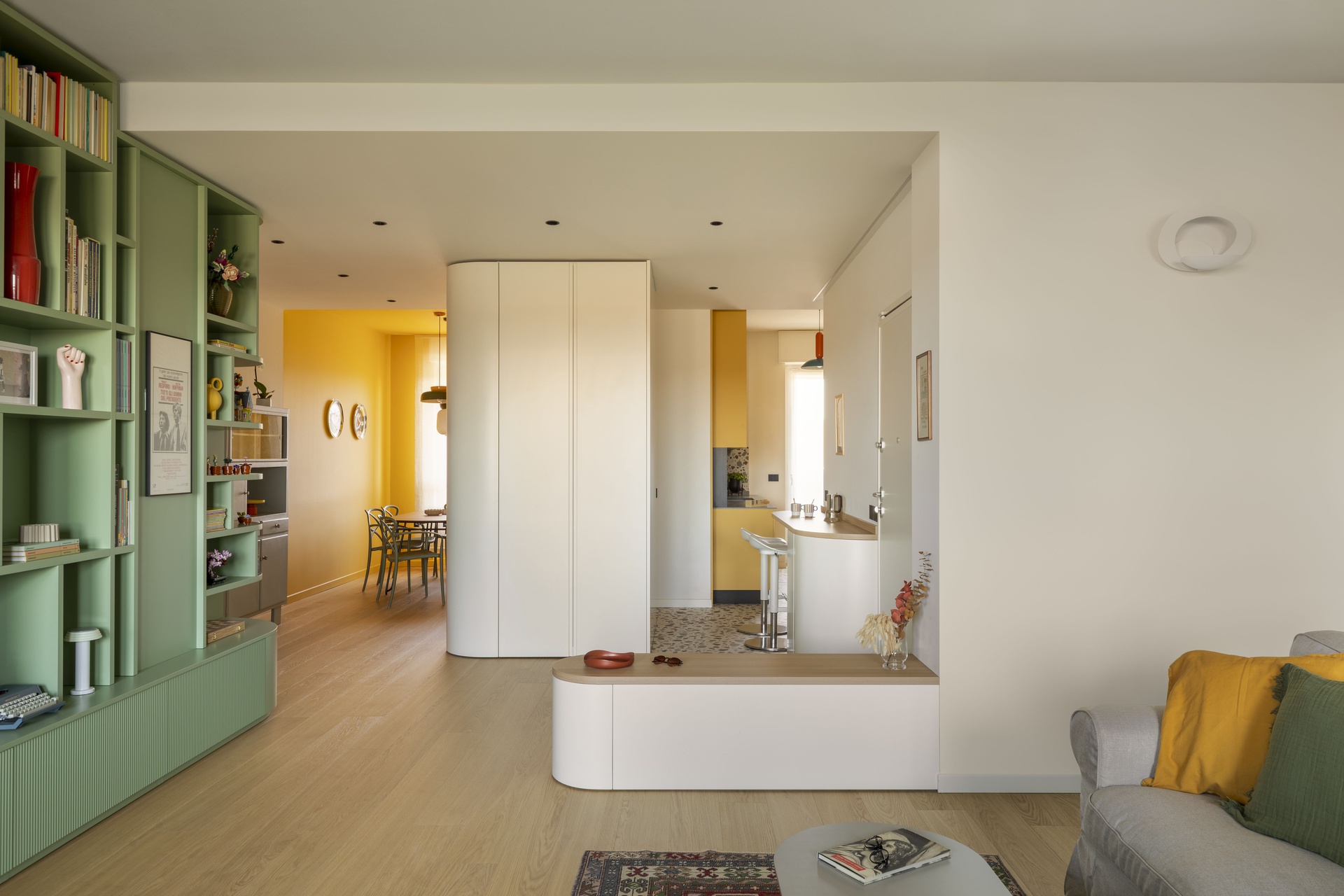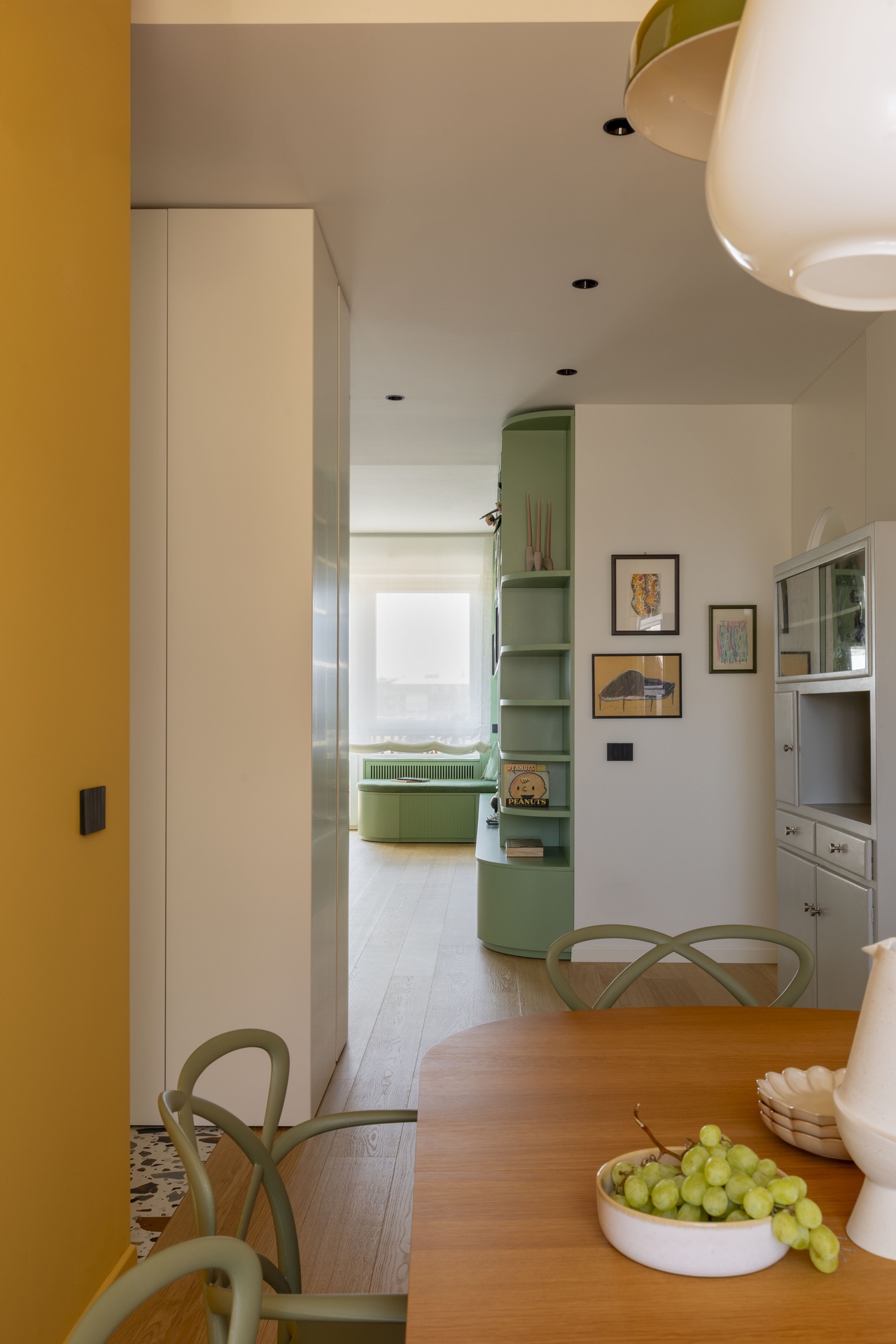 Progetto di Ristrutturazione Integrale: Fluidità, Design Sartoriale e Coerenza CromaticaL'intervento cardine di questa ristrutturazione integrale è stato il raggiungimento della massima connessione visiva e spaziale tra la cucina, la sala da pranzo e l'ampio e luminoso soggiorno.Open Space e Funzionalità Nascosta.L'obiettivo è stato conseguito attraverso la demolizione dello sgabuzzino e del corridoio preesistenti. Questo ha creato un ampio ingresso da cui si sviluppa un bancone da bar che funge da elemento guida, accompagnando il percorso fino alla cucina. Un armadio avvolgente dalle forme morbide è stato realizzato attorno a una colonna strutturale, creando un'unione fluida con la sala da pranzo.In questa zona, le pareti, i battiscopa e il soffitto sono stati tinteggiati con un giallo caldo per massimizzare la percezione di ampiezza e sfondare lo spazio. Nascosto dietro l'armadio, il vecchio bagnetto di servizio è stato trasformato in una lavanderia attrezzatissima, le cui pareti sono impreziosite dal ritmo delle piastrelle concave e convesse che richiamano i motivi curvilinei ricorrenti in tutta la casa.Il Soggiorno e il Design Sartoriale.L'ampio soggiorno è caratterizzato da un’importante parete libreria verde integrata, dotata di una morbida panca che genera un accogliente angolo lettura vicino alla finestra. Sulla parete opposta, un'altra parete armadiata, realizzata nel medesimo tono di verde, ospita il pianoforte e, celato all'interno delle ante, un ricco home office completo di scrivania principale e una secondaria estraibile con ruote.L'attenzione ai dettagli è stata una nostra prerogativa: tutti gli arredi sono stati disegnati in maniera sartoriale, con maniglie a gola realizzate su misura. Mensole ed elementi curvilinei definiscono movimenti fluidi tra gli spazi, un tema coerentemente ripreso dalla porta ad arco filo muro che segna il passaggio alla zona notte.La Zona Notte: Calma e Colore.Il corridoio attrezzato funge da pausa bianca e neutra, unendo le stanze vivaci e colorate.• Camere Bambine e Nursery: Le pareti sono tinteggiate con toni pastello e decorate con un motivo a "merlettatura" e ampi archi che incorniciano librerie e armadiature. Il bagno delle bambine prosegue con i colori pastello e piastrelle a pavimento che evocano l'effetto di pennellate dipinte a mano, per un tocco giocoso.• Suite Padronale: Un azzurro polvere pervade la stanza, infondendo un senso di calma. Qui, l'arco, dalle rimembranze quasi classiche, impreziosisce le ante dell'armadio con applicazioni a mezzo sigaro, mentre un intenso blu notte decora la parete di testata.Materiali e Dettagli di Finitura.L'intero progetto è unito da un pavimento in parquet di rovere naturale, riservato alle zone asciutte. Fanno eccezione l'ingresso e la cucina, dove spiccano le piastrelle modello Deconcrete di Sant'Agostino, e i bagni.Nel bagno padronale, le tonalità polvere e mattone, richiamate anche dalle vivaci lampade Decò di Ferroluce, vengono riprese. L'uso del motivo curvilineo è evidente sia nelle finiture dei mobili che nei rivestimenti ceramici (pareti modello Marea di Quintessenza e pavimento Primavera blu di Mutina). Fotografie: Marta D'Avenia