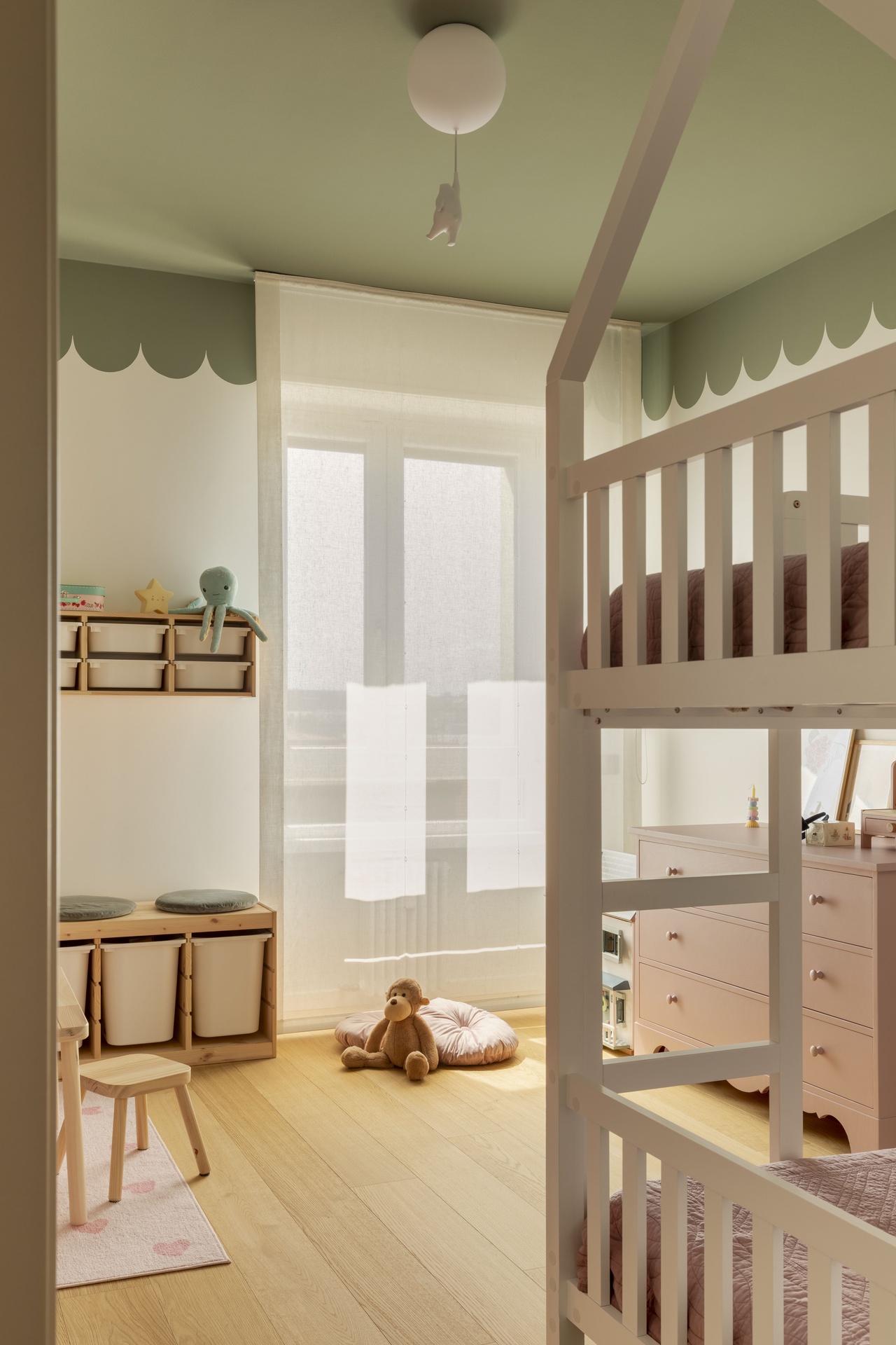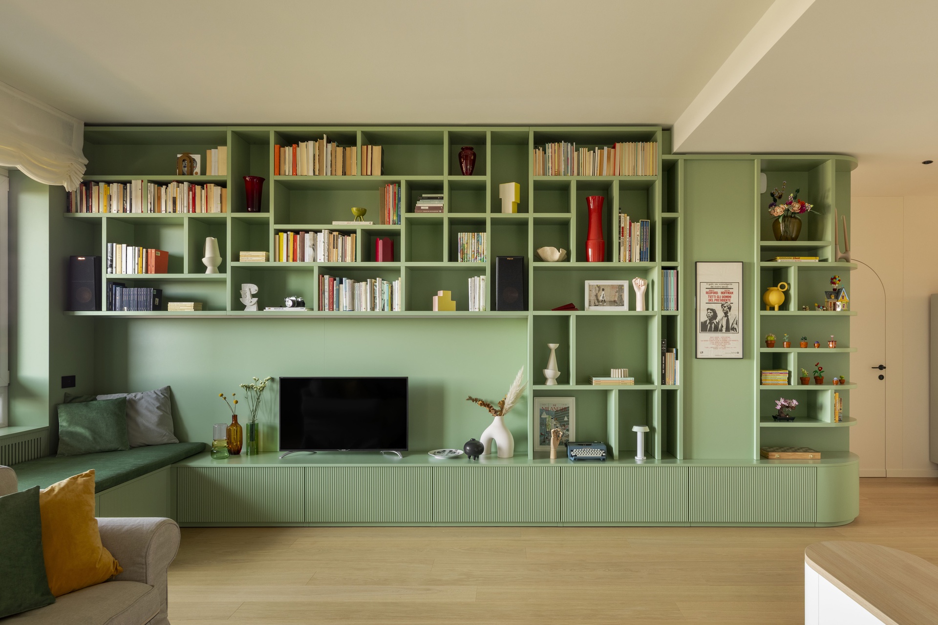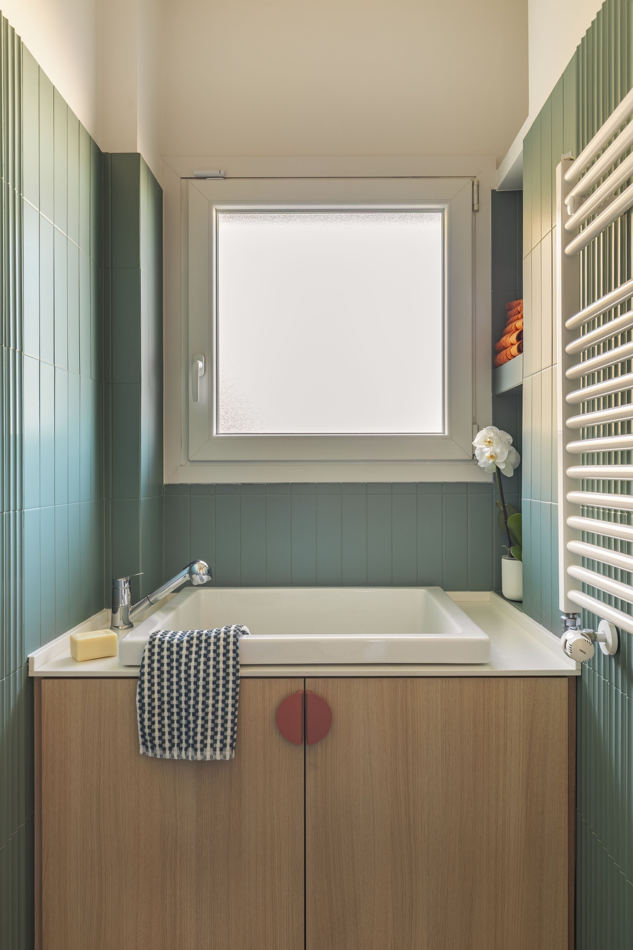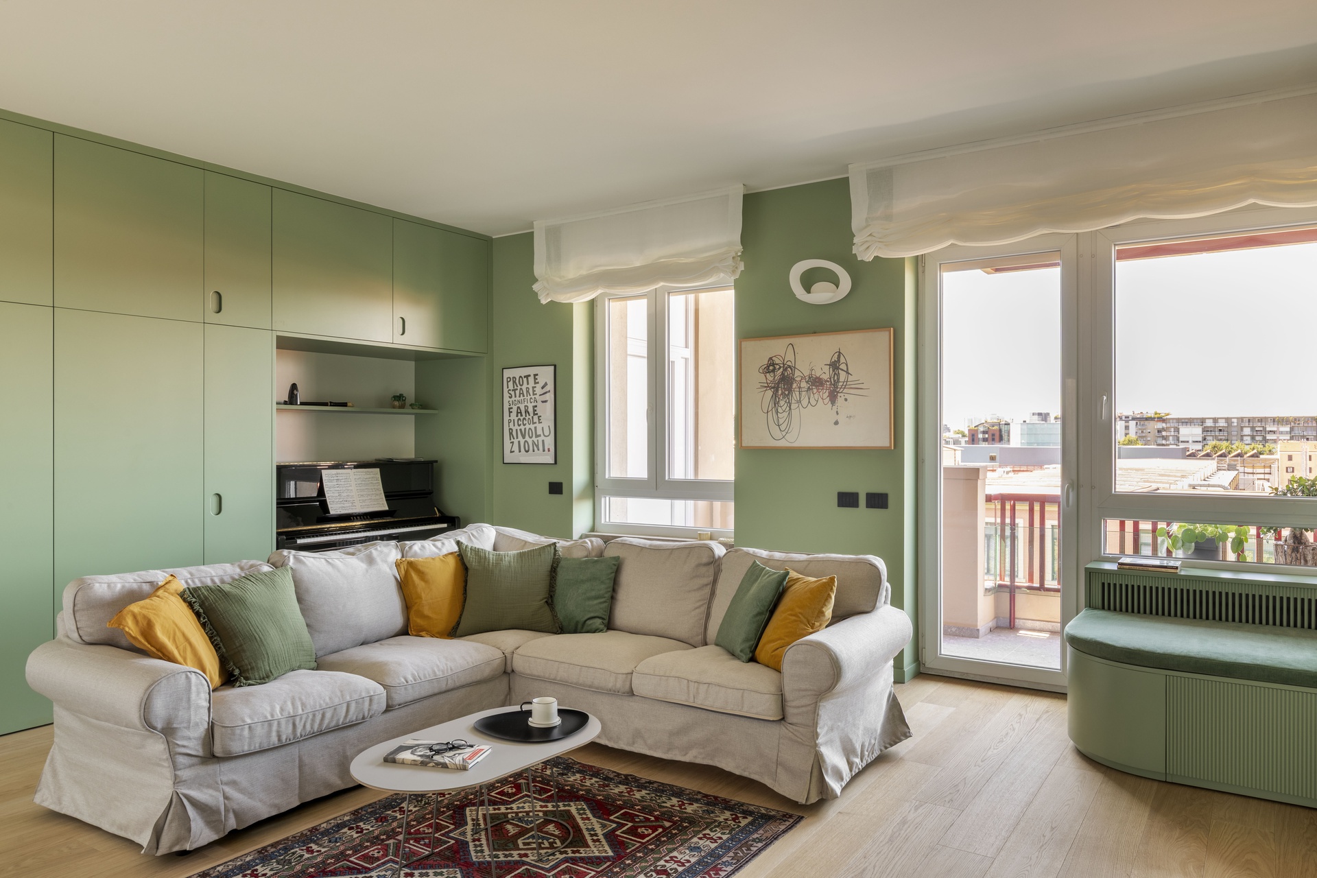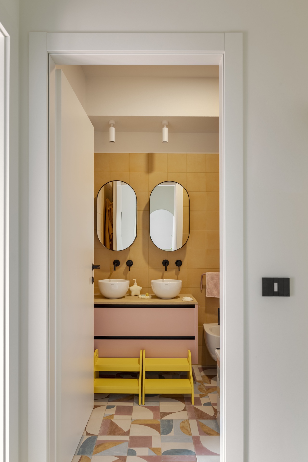 Progetto di Ristrutturazione Integrale: Fluidità, Design Sartoriale e Coerenza CromaticaL'intervento cardine di questa ristrutturazione integrale è stato il raggiungimento della massima connessione visiva e spaziale tra la cucina, la sala da pranzo e l'ampio e luminoso soggiorno.Open Space e Funzionalità Nascosta.L'obiettivo è stato conseguito attraverso la demolizione dello sgabuzzino e del corridoio preesistenti. Questo ha creato un ampio ingresso da cui si sviluppa un bancone da bar che funge da elemento guida, accompagnando il percorso fino alla cucina. Un armadio avvolgente dalle forme morbide è stato realizzato attorno a una colonna strutturale, creando un'unione fluida con la sala da pranzo.In questa zona, le pareti, i battiscopa e il soffitto sono stati tinteggiati con un giallo caldo per massimizzare la percezione di ampiezza e sfondare lo spazio. Nascosto dietro l'armadio, il vecchio bagnetto di servizio è stato trasformato in una lavanderia attrezzatissima, le cui pareti sono impreziosite dal ritmo delle piastrelle concave e convesse che richiamano i motivi curvilinei ricorrenti in tutta la casa.Il Soggiorno e il Design Sartoriale.L'ampio soggiorno è caratterizzato da un’importante parete libreria verde integrata, dotata di una morbida panca che genera un accogliente angolo lettura vicino alla finestra. Sulla parete opposta, un'altra parete armadiata, realizzata nel medesimo tono di verde, ospita il pianoforte e, celato all'interno delle ante, un ricco home office completo di scrivania principale e una secondaria estraibile con ruote.L'attenzione ai dettagli è stata una nostra prerogativa: tutti gli arredi sono stati disegnati in maniera sartoriale, con maniglie a gola realizzate su misura. Mensole ed elementi curvilinei definiscono movimenti fluidi tra gli spazi, un tema coerentemente ripreso dalla porta ad arco filo muro che segna il passaggio alla zona notte.La Zona Notte: Calma e Colore.Il corridoio attrezzato funge da pausa bianca e neutra, unendo le stanze vivaci e colorate.• Camere Bambine e Nursery: Le pareti sono tinteggiate con toni pastello e decorate con un motivo a "merlettatura" e ampi archi che incorniciano librerie e armadiature. Il bagno delle bambine prosegue con i colori pastello e piastrelle a pavimento che evocano l'effetto di pennellate dipinte a mano, per un tocco giocoso.• Suite Padronale: Un azzurro polvere pervade la stanza, infondendo un senso di calma. Qui, l'arco, dalle rimembranze quasi classiche, impreziosisce le ante dell'armadio con applicazioni a mezzo sigaro, mentre un intenso blu notte decora la parete di testata.Materiali e Dettagli di Finitura.L'intero progetto è unito da un pavimento in parquet di rovere naturale, riservato alle zone asciutte. Fanno eccezione l'ingresso e la cucina, dove spiccano le piastrelle modello Deconcrete di Sant'Agostino, e i bagni.Nel bagno padronale, le tonalità polvere e mattone, richiamate anche dalle vivaci lampade Decò di Ferroluce, vengono riprese. L'uso del motivo curvilineo è evidente sia nelle finiture dei mobili che nei rivestimenti ceramici (pareti modello Marea di Quintessenza e pavimento Primavera blu di Mutina). Fotografie: Marta D'Avenia