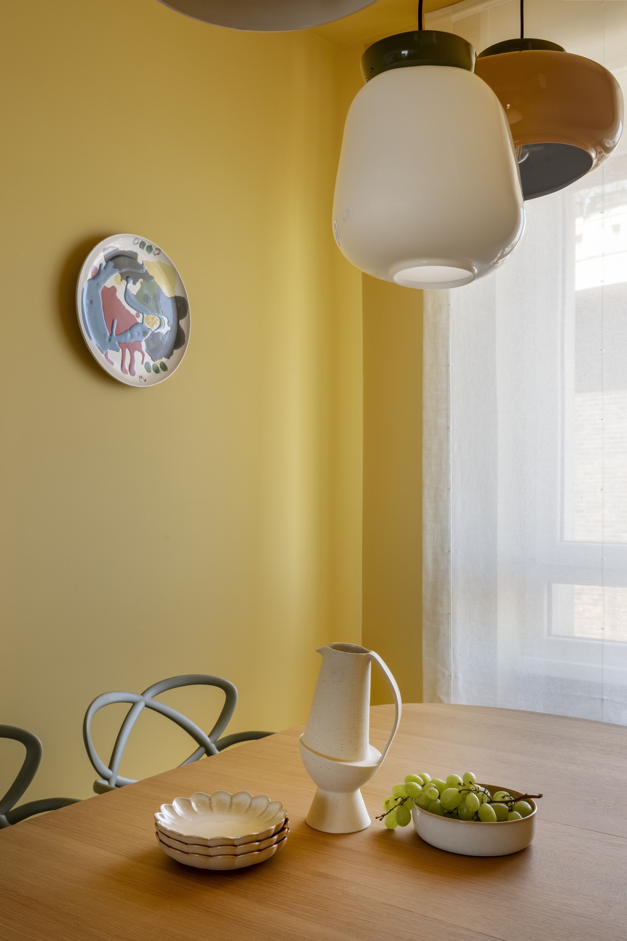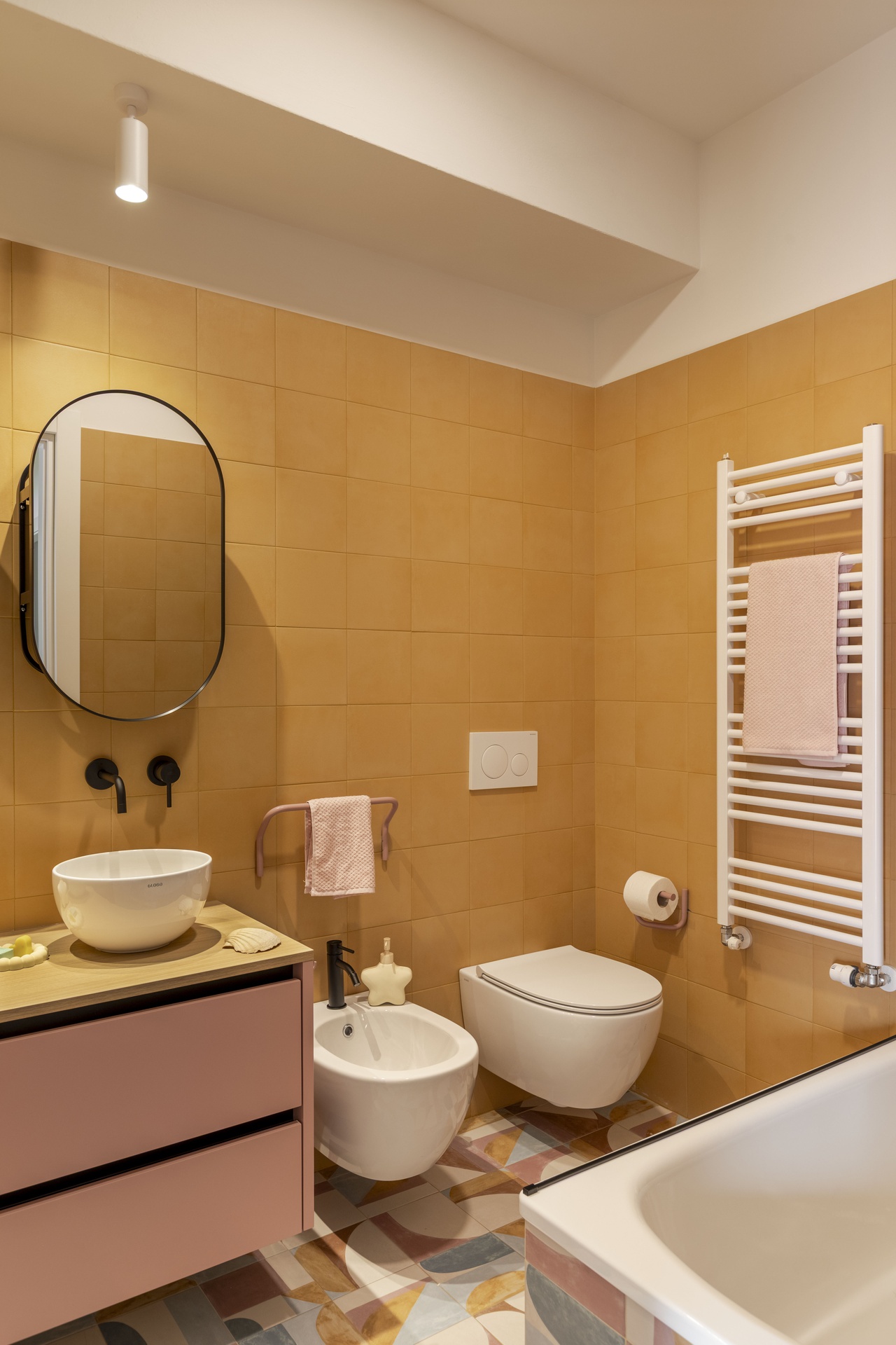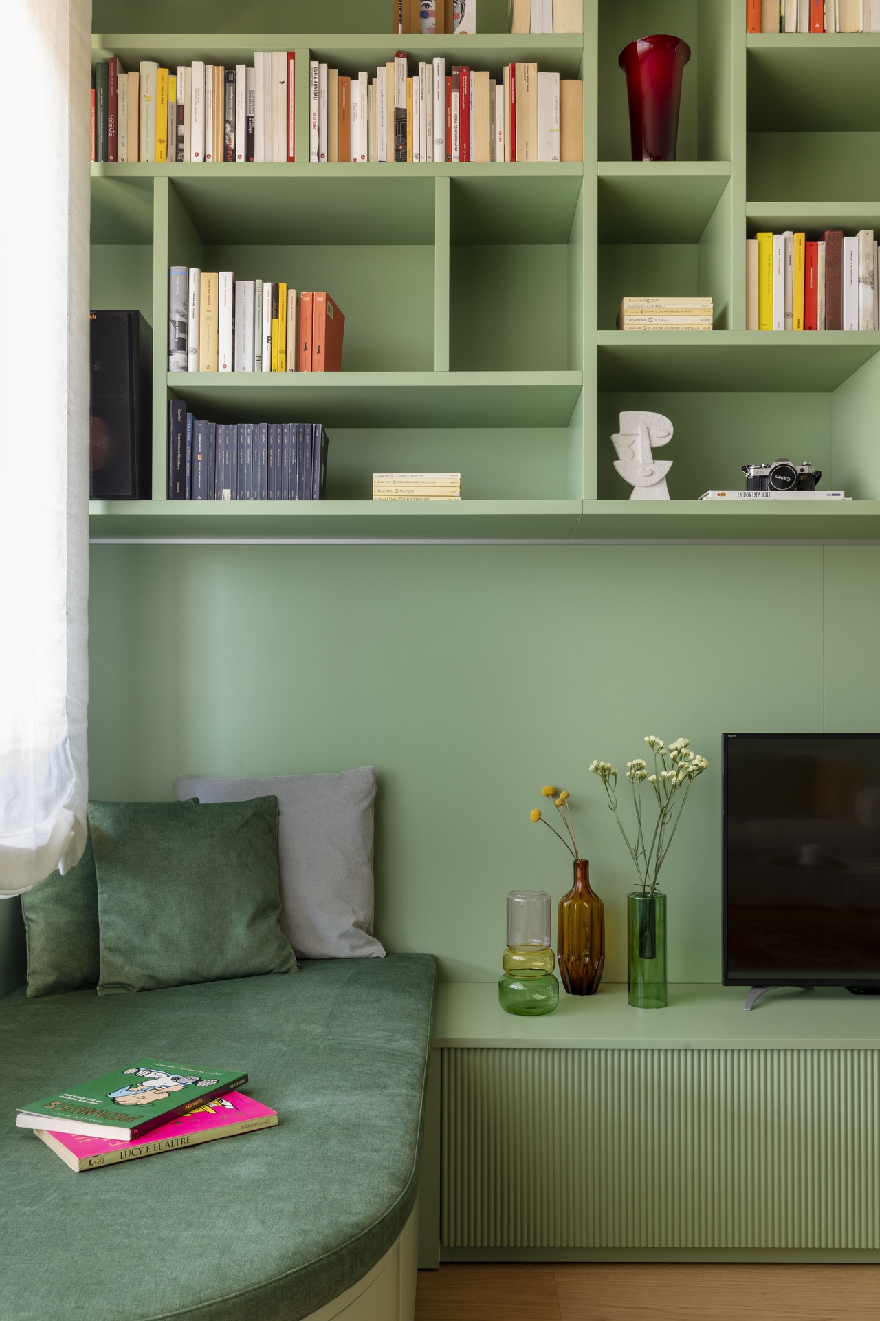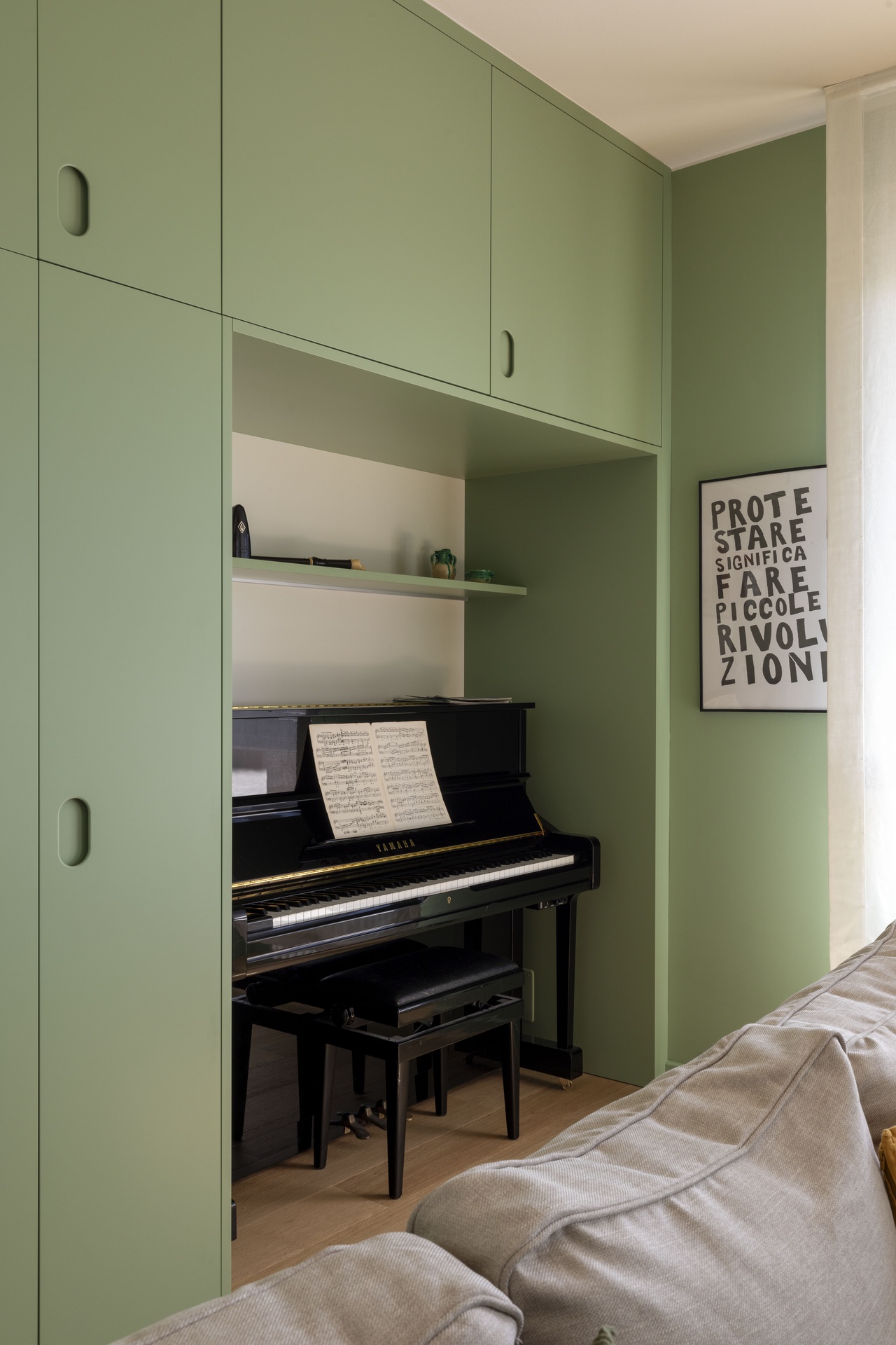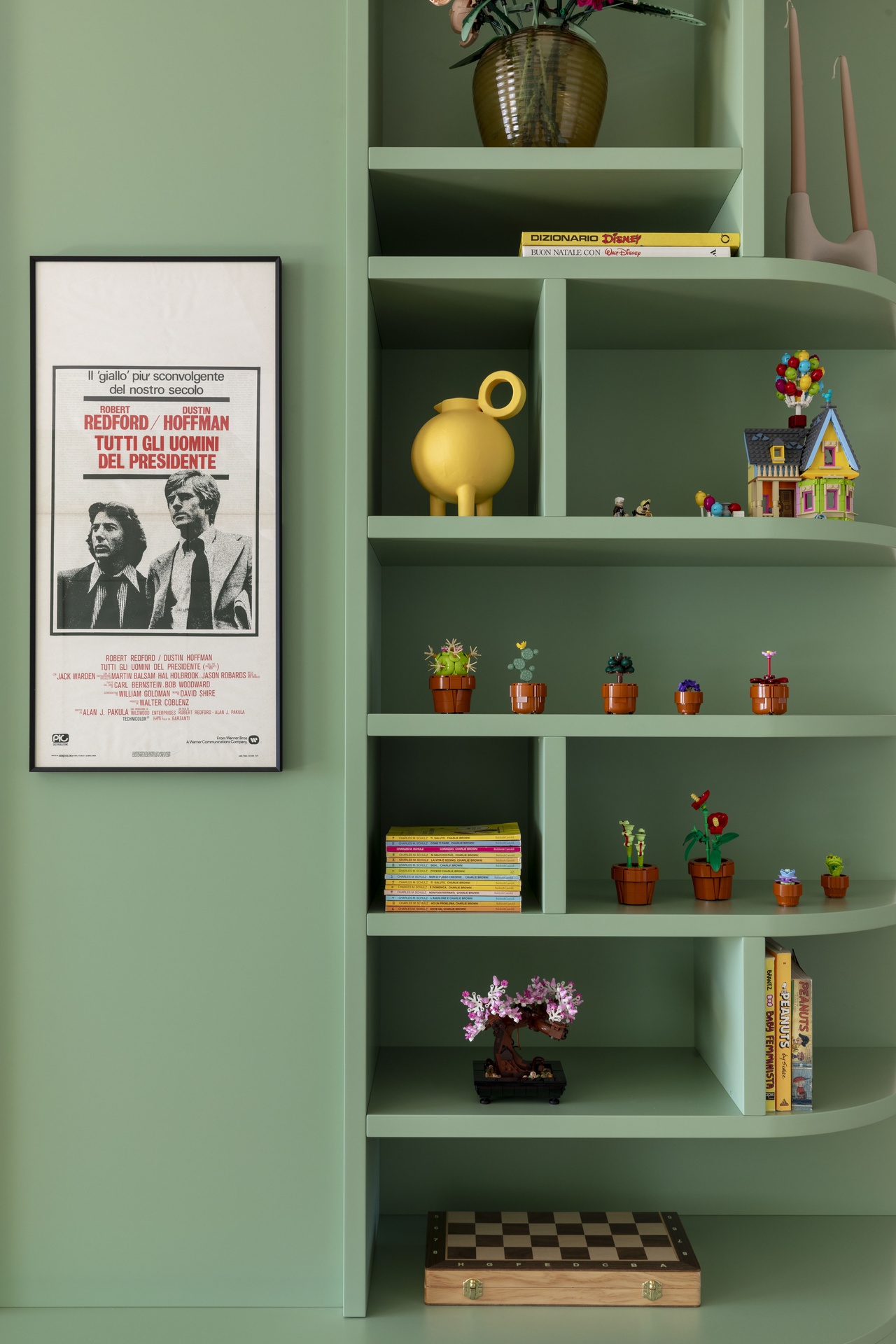Progetto di Ristrutturazione Integrale: Fluidità, Design Sartoriale e Coerenza CromaticaL'intervento cardine di questa ristrutturazione integrale è stato il raggiungimento della massima connessione visiva e spaziale tra la cucina, la sala da pranzo e l'ampio e luminoso soggiorno.Open Space e Funzionalità Nascosta.L'obiettivo è stato conseguito attraverso la demolizione dello sgabuzzino e del corridoio preesistenti. Questo ha creato un ampio ingresso da cui si sviluppa un bancone da bar che funge da elemento guida, accompagnando il percorso fino alla cucina. Un armadio avvolgente dalle forme morbide è stato realizzato attorno a una colonna strutturale, creando un'unione fluida con la sala da pranzo.In questa zona, le pareti, i battiscopa e il soffitto sono stati tinteggiati con un giallo caldo per massimizzare la percezione di ampiezza e sfondare lo spazio. Nascosto dietro l'armadio, il vecchio bagnetto di servizio è stato trasformato in una lavanderia attrezzatissima, le cui pareti sono impreziosite dal ritmo delle piastrelle concave e convesse che richiamano i motivi curvilinei ricorrenti in tutta la casa.Il Soggiorno e il Design Sartoriale.L'ampio soggiorno è caratterizzato da un’importante parete libreria verde integrata, dotata di una morbida panca che genera un accogliente angolo lettura vicino alla finestra. Sulla parete opposta, un'altra parete armadiata, realizzata nel medesimo tono di verde, ospita il pianoforte e, celato all'interno delle ante, un ricco home office completo di scrivania principale e una secondaria estraibile con ruote.L'attenzione ai dettagli è stata una nostra prerogativa: tutti gli arredi sono stati disegnati in maniera sartoriale, con maniglie a gola realizzate su misura. Mensole ed elementi curvilinei definiscono movimenti fluidi tra gli spazi, un tema coerentemente ripreso dalla porta ad arco filo muro che segna il passaggio alla zona notte.La Zona Notte: Calma e Colore.Il corridoio attrezzato funge da pausa bianca e neutra, unendo le stanze vivaci e colorate.• Camere Bambine e Nursery: Le pareti sono tinteggiate con toni pastello e decorate con un motivo a "merlettatura" e ampi archi che incorniciano librerie e armadiature. Il bagno delle bambine prosegue con i colori pastello e piastrelle a pavimento che evocano l'effetto di pennellate dipinte a mano, per un tocco giocoso.• Suite Padronale: Un azzurro polvere pervade la stanza, infondendo un senso di calma. Qui, l'arco, dalle rimembranze quasi classiche, impreziosisce le ante dell'armadio con applicazioni a mezzo sigaro, mentre un intenso blu notte decora la parete di testata.Materiali e Dettagli di Finitura.L'intero progetto è unito da un pavimento in parquet di rovere naturale, riservato alle zone asciutte. Fanno eccezione l'ingresso e la cucina, dove spiccano le piastrelle modello Deconcrete di Sant'Agostino, e i bagni.Nel bagno padronale, le tonalità polvere e mattone, richiamate anche dalle vivaci lampade Decò di Ferroluce, vengono riprese. L'uso del motivo curvilineo è evidente sia nelle finiture dei mobili che nei rivestimenti ceramici (pareti modello Marea di Quintessenza e pavimento Primavera blu di Mutina). Fotografie: Marta D'Avenia