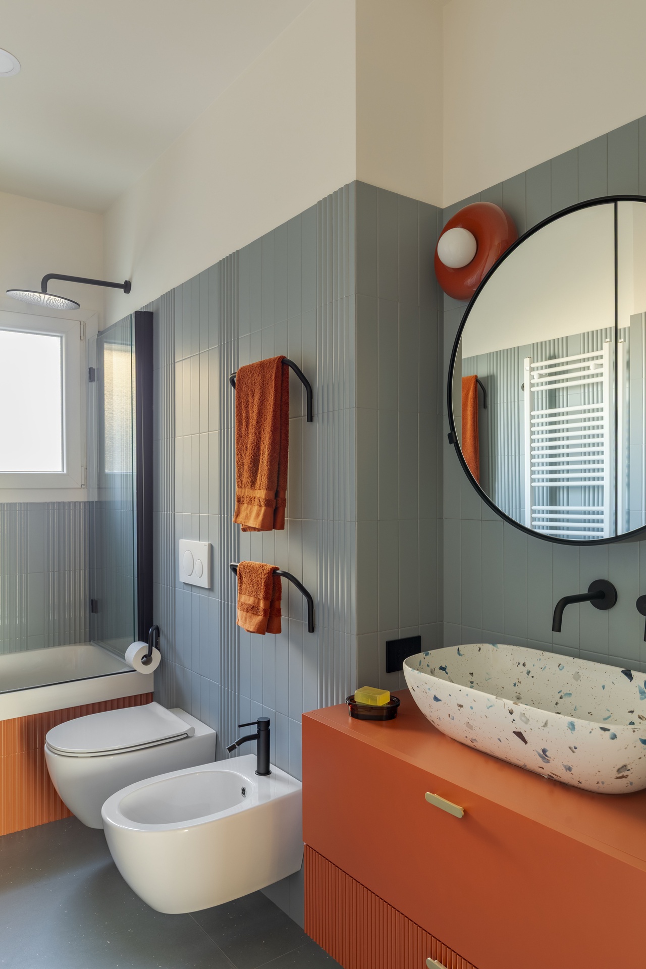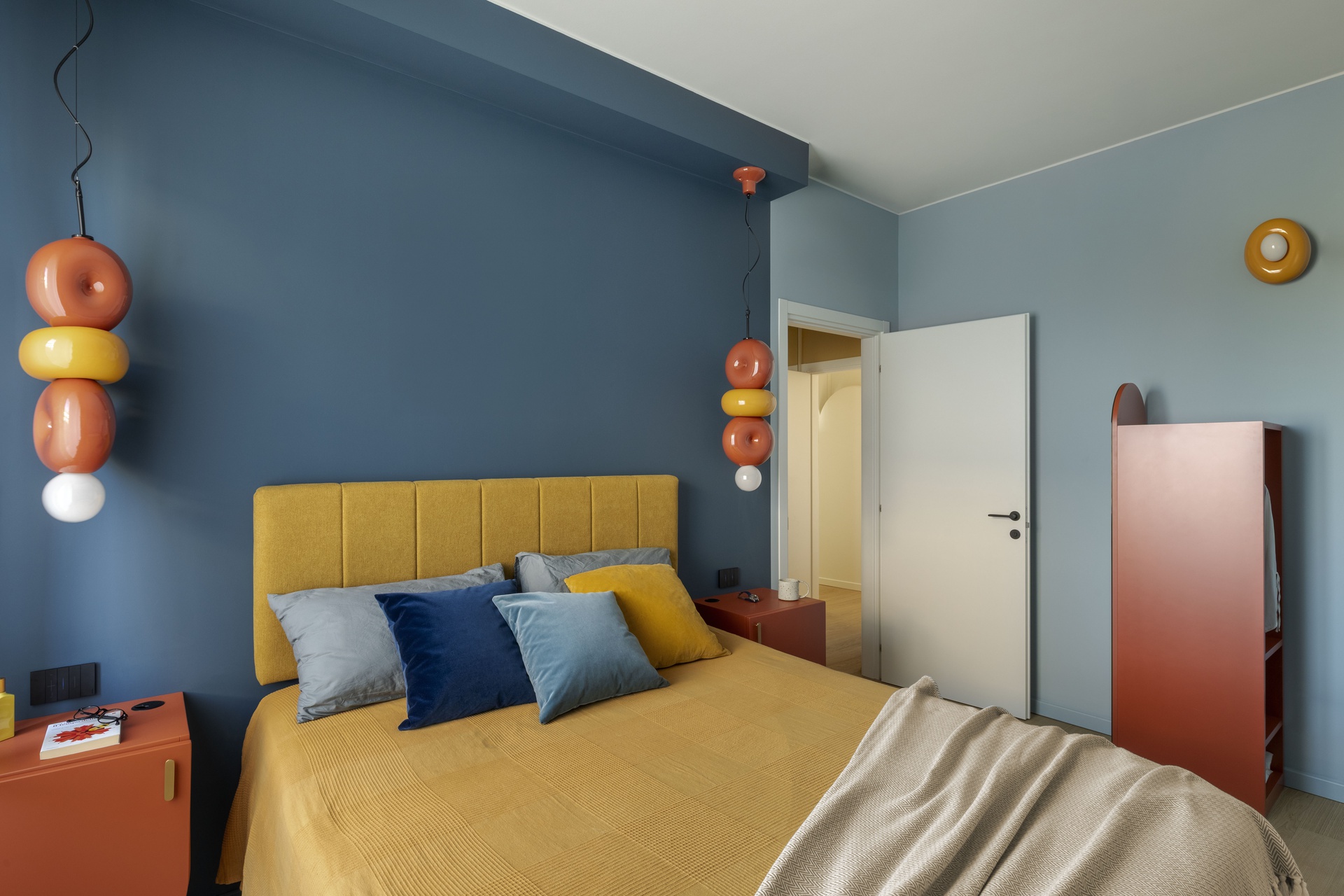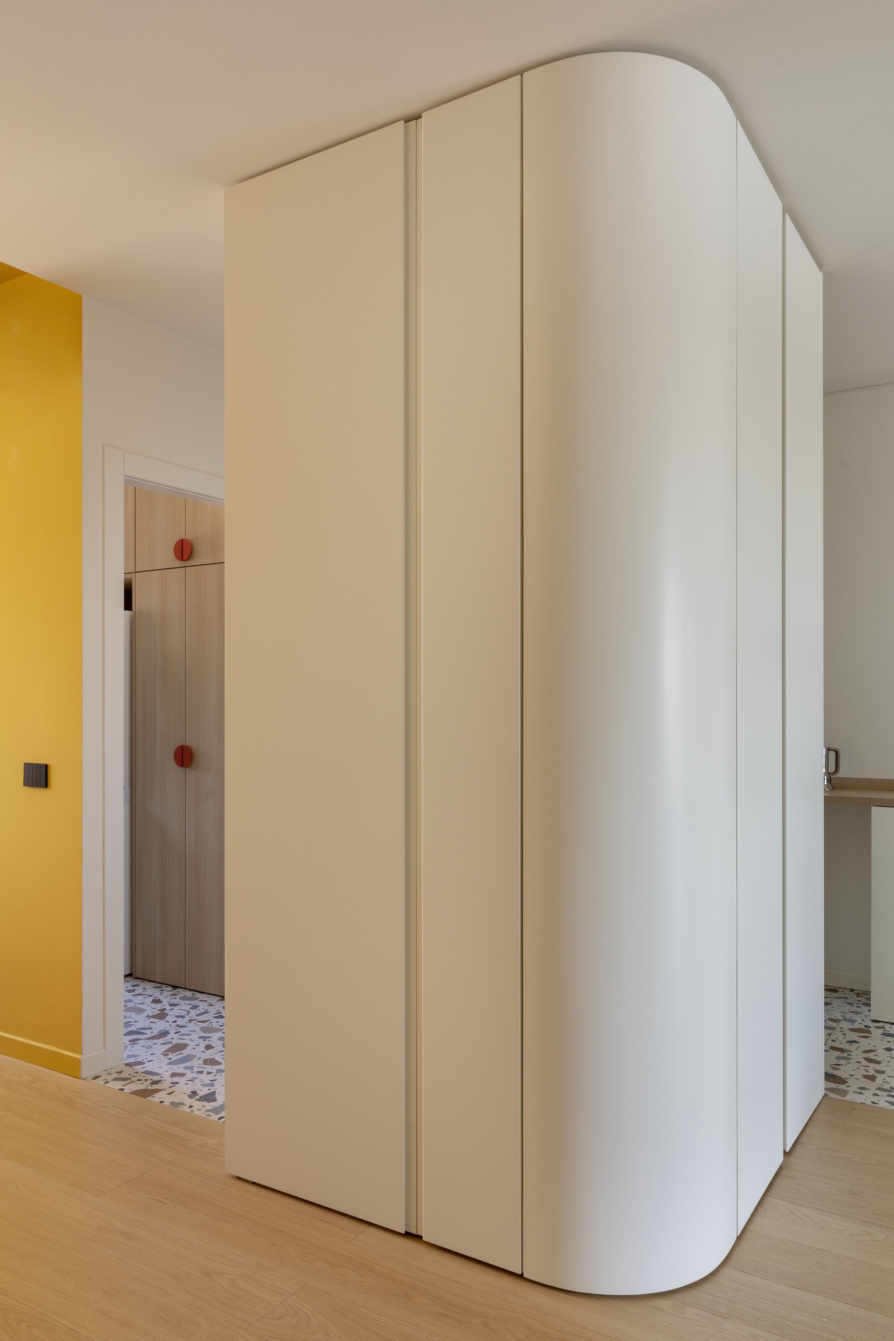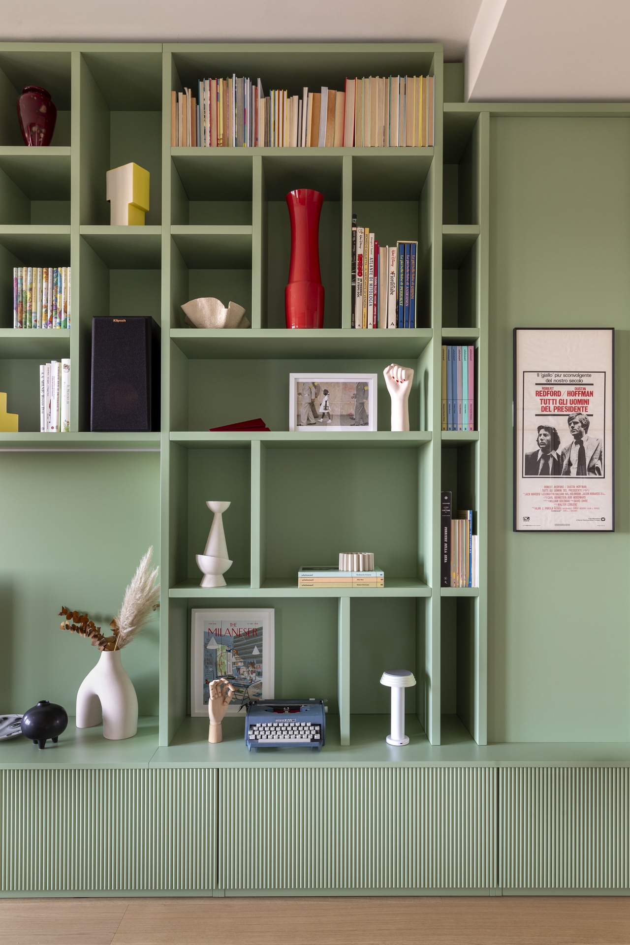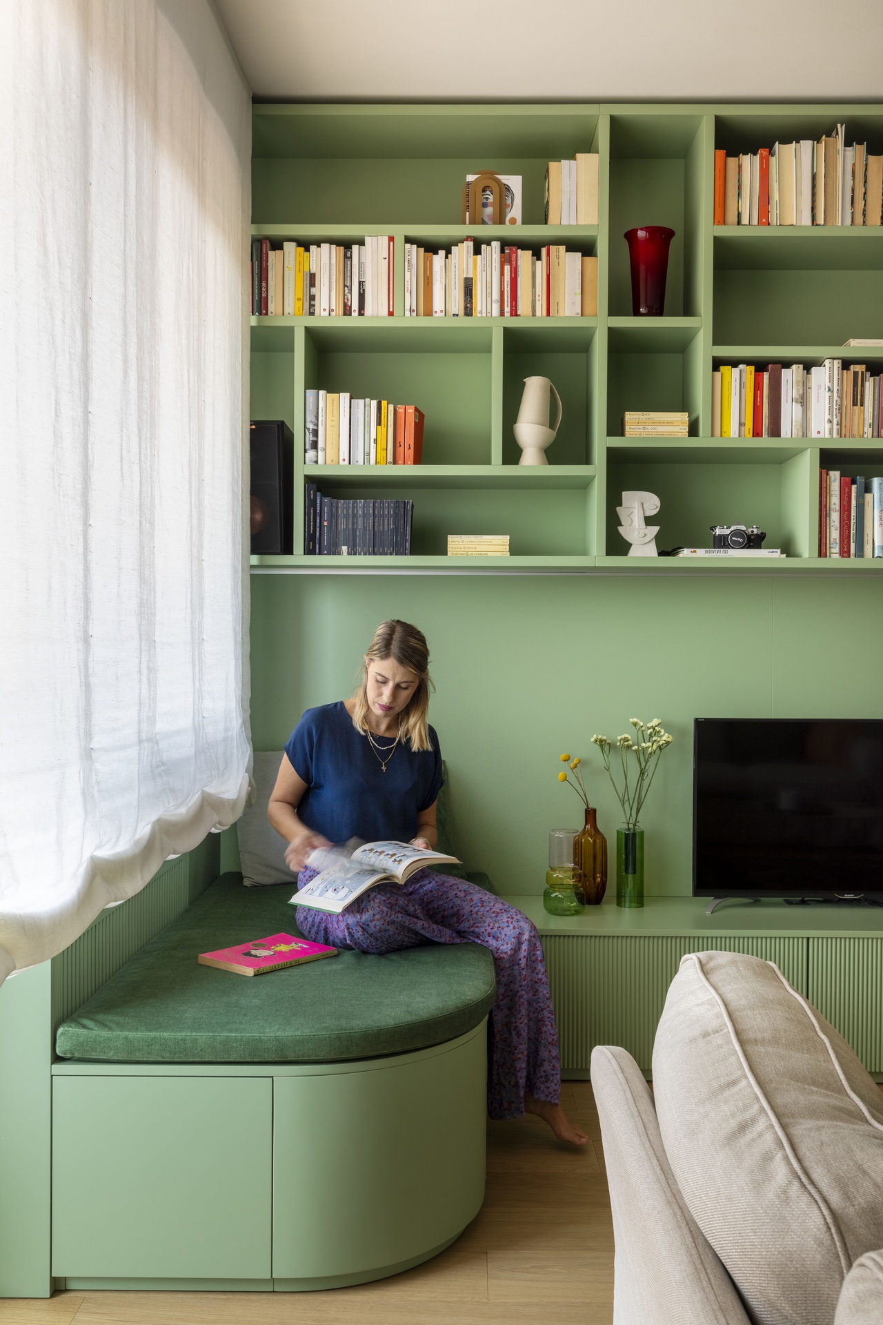 Progetto di Ristrutturazione Integrale: Fluidità, Design Sartoriale e Coerenza CromaticaL'intervento cardine di questa ristrutturazione integrale è stato il raggiungimento della massima connessione visiva e spaziale tra la cucina, la sala da pranzo e l'ampio e luminoso soggiorno.Open Space e Funzionalità Nascosta.L'obiettivo è stato conseguito attraverso la demolizione dello sgabuzzino e del corridoio preesistenti. Questo ha creato un ampio ingresso da cui si sviluppa un bancone da bar che funge da elemento guida, accompagnando il percorso fino alla cucina. Un armadio avvolgente dalle forme morbide è stato realizzato attorno a una colonna strutturale, creando un'unione fluida con la sala da pranzo.In questa zona, le pareti, i battiscopa e il soffitto sono stati tinteggiati con un giallo caldo per massimizzare la percezione di ampiezza e sfondare lo spazio. Nascosto dietro l'armadio, il vecchio bagnetto di servizio è stato trasformato in una lavanderia attrezzatissima, le cui pareti sono impreziosite dal ritmo delle piastrelle concave e convesse che richiamano i motivi curvilinei ricorrenti in tutta la casa.Il Soggiorno e il Design Sartoriale.L'ampio soggiorno è caratterizzato da un’importante parete libreria verde integrata, dotata di una morbida panca che genera un accogliente angolo lettura vicino alla finestra. Sulla parete opposta, un'altra parete armadiata, realizzata nel medesimo tono di verde, ospita il pianoforte e, celato all'interno delle ante, un ricco home office completo di scrivania principale e una secondaria estraibile con ruote.L'attenzione ai dettagli è stata una nostra prerogativa: tutti gli arredi sono stati disegnati in maniera sartoriale, con maniglie a gola realizzate su misura. Mensole ed elementi curvilinei definiscono movimenti fluidi tra gli spazi, un tema coerentemente ripreso dalla porta ad arco filo muro che segna il passaggio alla zona notte.La Zona Notte: Calma e Colore.Il corridoio attrezzato funge da pausa bianca e neutra, unendo le stanze vivaci e colorate.• Camere Bambine e Nursery: Le pareti sono tinteggiate con toni pastello e decorate con un motivo a "merlettatura" e ampi archi che incorniciano librerie e armadiature. Il bagno delle bambine prosegue con i colori pastello e piastrelle a pavimento che evocano l'effetto di pennellate dipinte a mano, per un tocco giocoso.• Suite Padronale: Un azzurro polvere pervade la stanza, infondendo un senso di calma. Qui, l'arco, dalle rimembranze quasi classiche, impreziosisce le ante dell'armadio con applicazioni a mezzo sigaro, mentre un intenso blu notte decora la parete di testata.Materiali e Dettagli di Finitura.L'intero progetto è unito da un pavimento in parquet di rovere naturale, riservato alle zone asciutte. Fanno eccezione l'ingresso e la cucina, dove spiccano le piastrelle modello Deconcrete di Sant'Agostino, e i bagni.Nel bagno padronale, le tonalità polvere e mattone, richiamate anche dalle vivaci lampade Decò di Ferroluce, vengono riprese. L'uso del motivo curvilineo è evidente sia nelle finiture dei mobili che nei rivestimenti ceramici (pareti modello Marea di Quintessenza e pavimento Primavera blu di Mutina). Fotografie: Marta D'Avenia