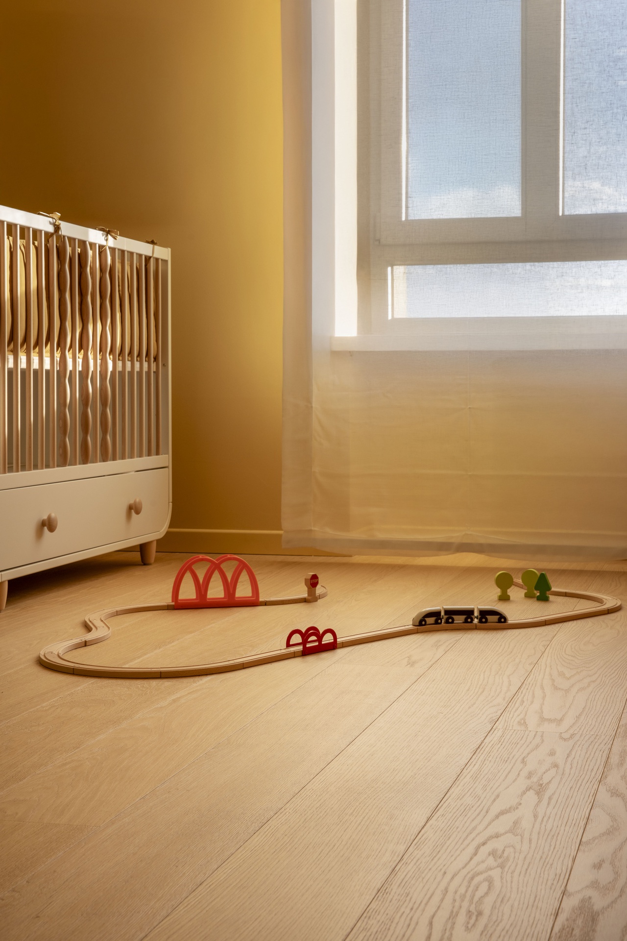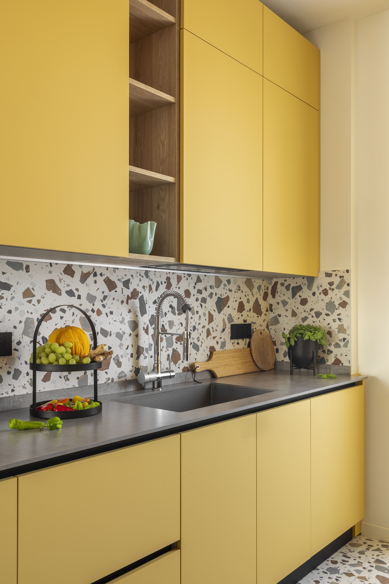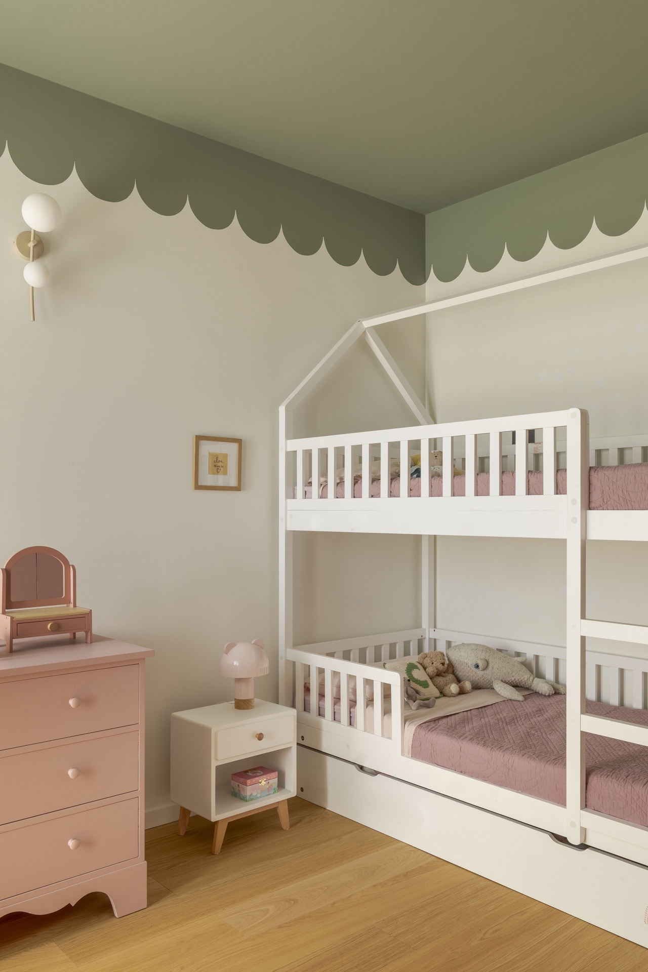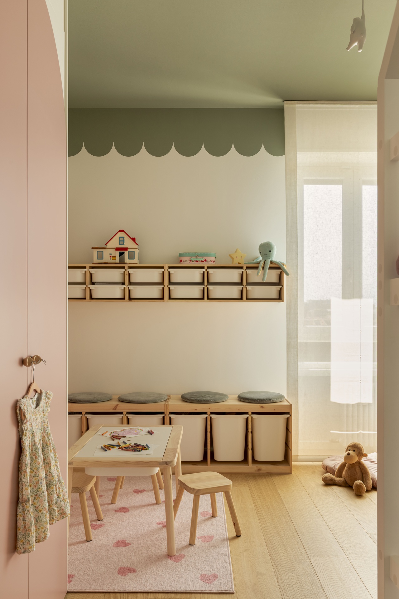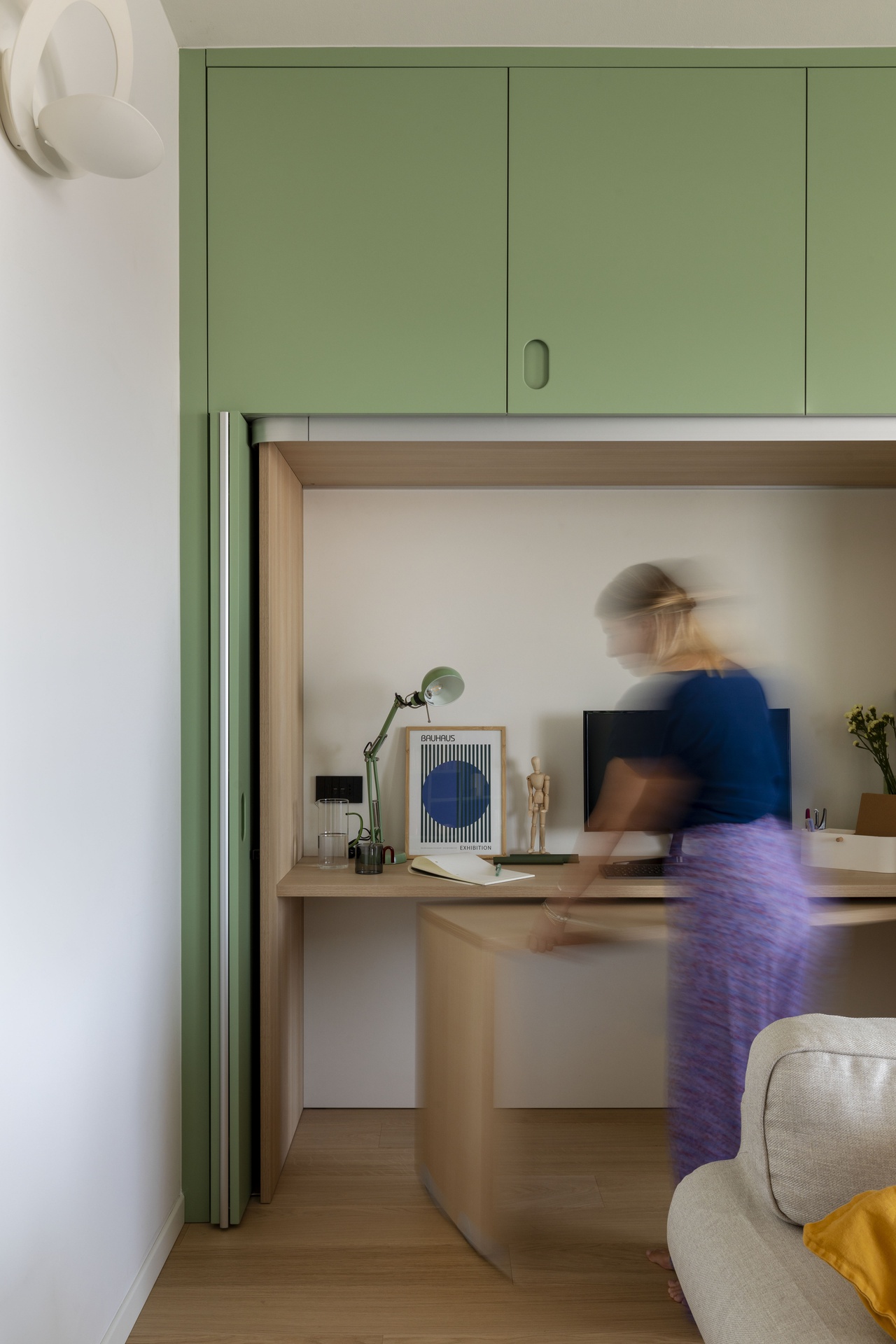 Progetto di Ristrutturazione Integrale: Fluidità, Design Sartoriale e Coerenza CromaticaL'intervento cardine di questa ristrutturazione integrale è stato il raggiungimento della massima connessione visiva e spaziale tra la cucina, la sala da pranzo e l'ampio e luminoso soggiorno.Open Space e Funzionalità Nascosta.L'obiettivo è stato conseguito attraverso la demolizione dello sgabuzzino e del corridoio preesistenti. Questo ha creato un ampio ingresso da cui si sviluppa un bancone da bar che funge da elemento guida, accompagnando il percorso fino alla cucina. Un armadio avvolgente dalle forme morbide è stato realizzato attorno a una colonna strutturale, creando un'unione fluida con la sala da pranzo.In questa zona, le pareti, i battiscopa e il soffitto sono stati tinteggiati con un giallo caldo per massimizzare la percezione di ampiezza e sfondare lo spazio. Nascosto dietro l'armadio, il vecchio bagnetto di servizio è stato trasformato in una lavanderia attrezzatissima, le cui pareti sono impreziosite dal ritmo delle piastrelle concave e convesse che richiamano i motivi curvilinei ricorrenti in tutta la casa.Il Soggiorno e il Design Sartoriale.L'ampio soggiorno è caratterizzato da un’importante parete libreria verde integrata, dotata di una morbida panca che genera un accogliente angolo lettura vicino alla finestra. Sulla parete opposta, un'altra parete armadiata, realizzata nel medesimo tono di verde, ospita il pianoforte e, celato all'interno delle ante, un ricco home office completo di scrivania principale e una secondaria estraibile con ruote.L'attenzione ai dettagli è stata una nostra prerogativa: tutti gli arredi sono stati disegnati in maniera sartoriale, con maniglie a gola realizzate su misura. Mensole ed elementi curvilinei definiscono movimenti fluidi tra gli spazi, un tema coerentemente ripreso dalla porta ad arco filo muro che segna il passaggio alla zona notte.La Zona Notte: Calma e Colore.Il corridoio attrezzato funge da pausa bianca e neutra, unendo le stanze vivaci e colorate.• Camere Bambine e Nursery: Le pareti sono tinteggiate con toni pastello e decorate con un motivo a "merlettatura" e ampi archi che incorniciano librerie e armadiature. Il bagno delle bambine prosegue con i colori pastello e piastrelle a pavimento che evocano l'effetto di pennellate dipinte a mano, per un tocco giocoso.• Suite Padronale: Un azzurro polvere pervade la stanza, infondendo un senso di calma. Qui, l'arco, dalle rimembranze quasi classiche, impreziosisce le ante dell'armadio con applicazioni a mezzo sigaro, mentre un intenso blu notte decora la parete di testata.Materiali e Dettagli di Finitura.L'intero progetto è unito da un pavimento in parquet di rovere naturale, riservato alle zone asciutte. Fanno eccezione l'ingresso e la cucina, dove spiccano le piastrelle modello Deconcrete di Sant'Agostino, e i bagni.Nel bagno padronale, le tonalità polvere e mattone, richiamate anche dalle vivaci lampade Decò di Ferroluce, vengono riprese. L'uso del motivo curvilineo è evidente sia nelle finiture dei mobili che nei rivestimenti ceramici (pareti modello Marea di Quintessenza e pavimento Primavera blu di Mutina). Fotografie: Marta D'Avenia