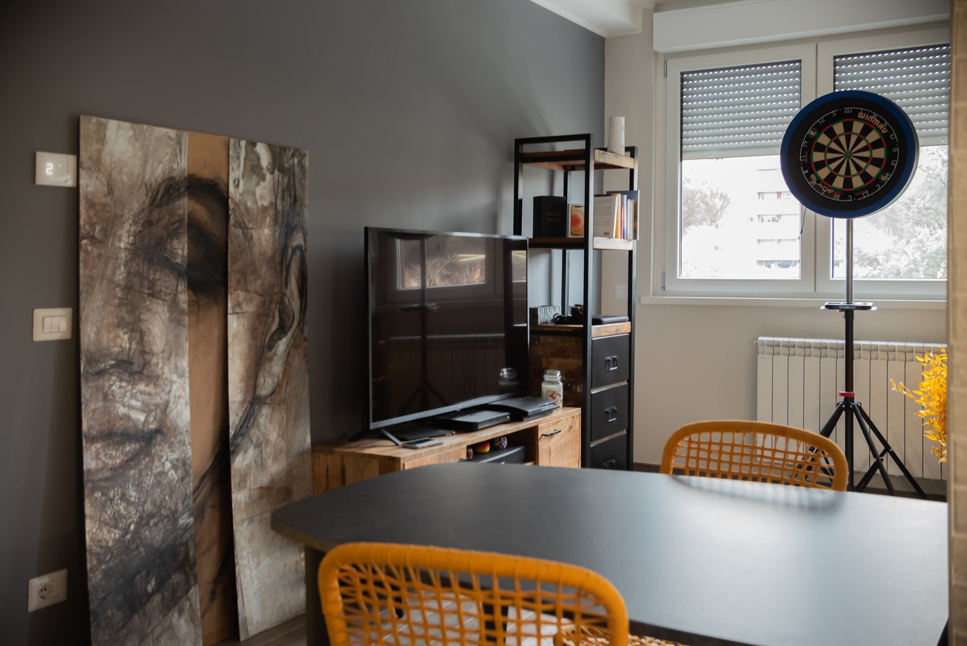 il committente ci aveva richiesto uno spazio più moderno e funzionale, adatto alle sue passioni e alle sue esigenze.inizialmente l'appartamento presentava scarsa areazione naturale e dimensioni molto ridotte della cucina ( inizialmente chiusa).Con la ristrutturazione, la luce e l'aria sono state implementate, inoltre modificando l'apertura di una porta è stato possibile ricavare un vano in più in bagno.l'appartamento presentava 4 colonne portanti a vista, successivamente alla ristrutturazione solo 1 delle 4 colonne è rimasta esterna.Giocando con gli spazi abbiamo portato in evidenza la colonna invece di nasconderla, in questo modo abbiamo sfruttato la colonna stessa e l'illuminazione per accentuare otticamente l'area pranzo.