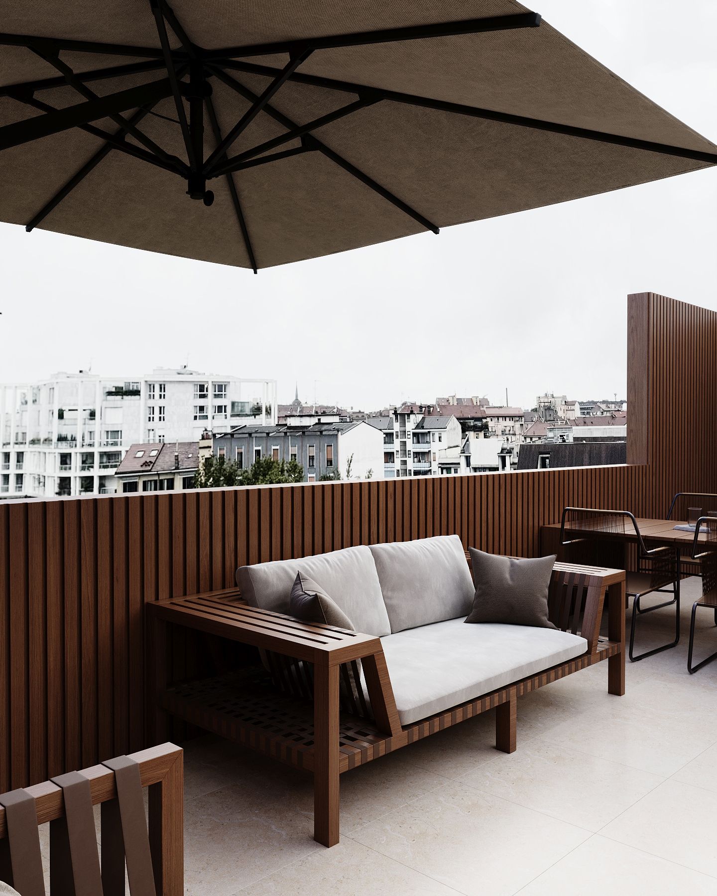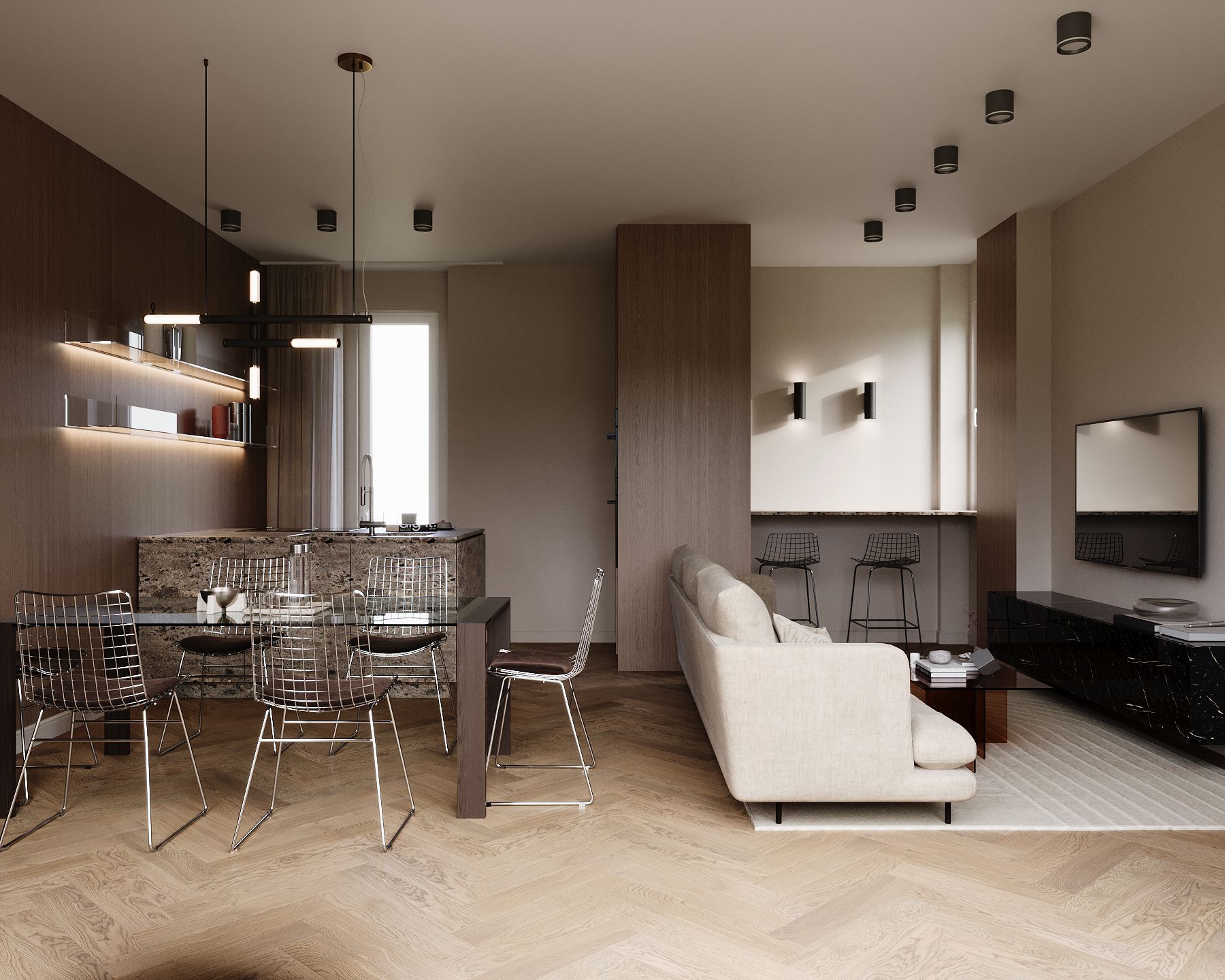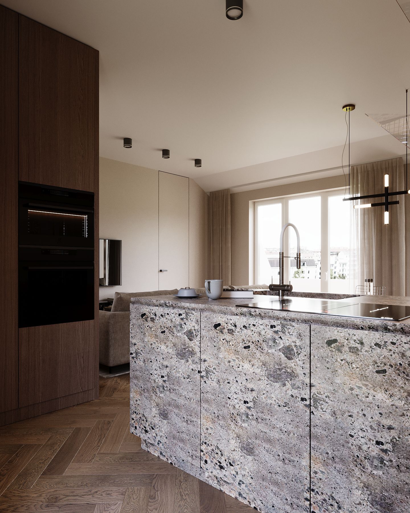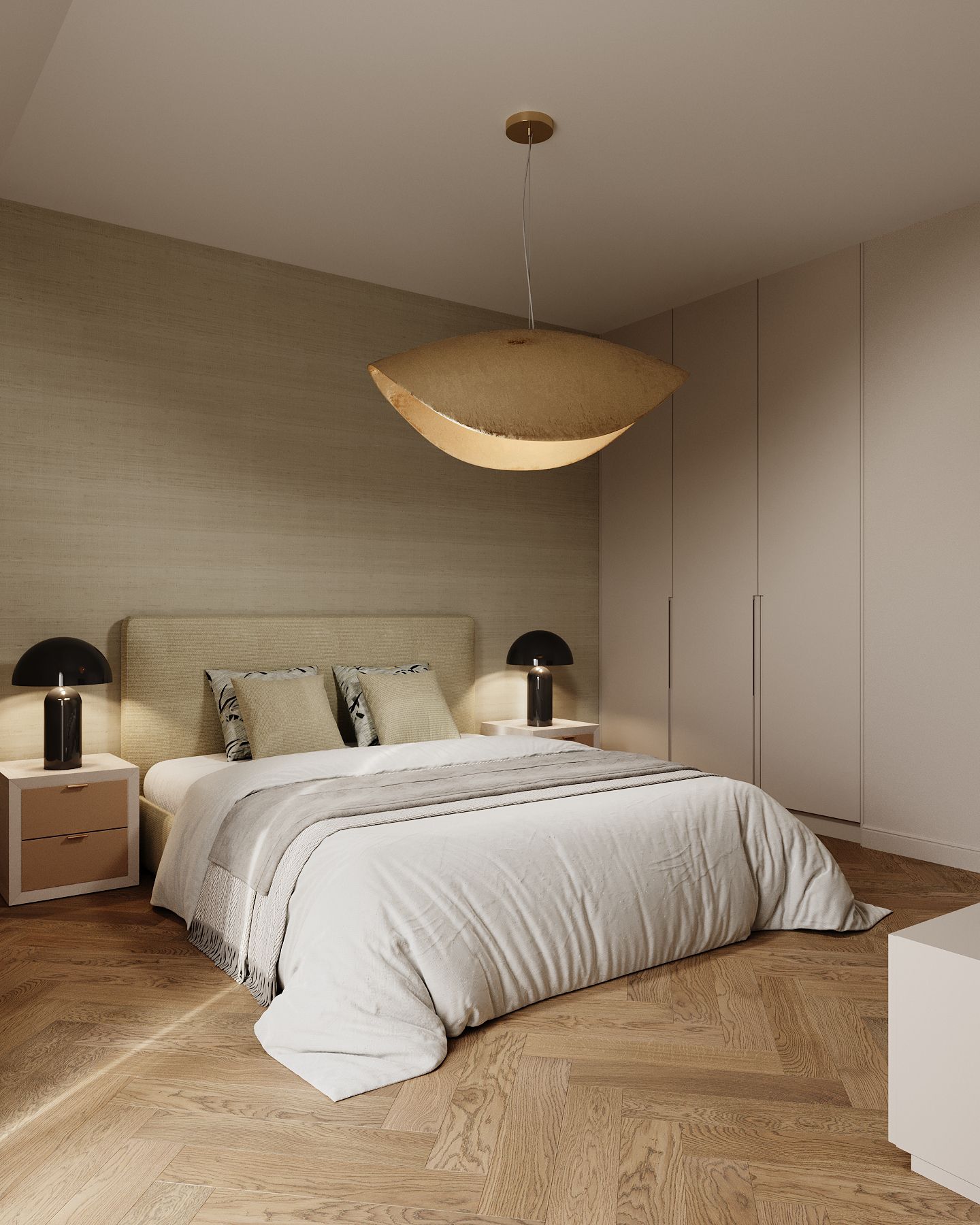 Questo progetto, costruito attorno a toni caldi e materiali naturali, restituisce un’immediata sensazione di calma e protezione. Nel grande open space abbiamo inserito un’isola cucina rivestita in pietra, pensata come fulcro conviviale dell’ambiente. La zona living accoglie anche un piccolo bancone dedicato agli aperitivi, un gesto informale che aggiunge atmosfera e invita alla convivialità.La camera da letto riprende la palette neutra del resto della casa, ma introduce un elemento di carattere: un lampadario scultoreo. Le lampade da comodino, coordinate con tende e cuscini, aggiungono un ulteriore livello di armonia e dettaglio.Il bagno è rivestito completamente in gres porcellanato di grande formato e dispone di una cabina doccia e di un doppio lavabo.L’appartamento gode anche di un ampio terrazzo completamente arredato.
