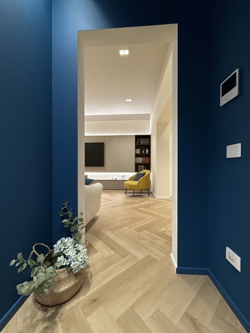 Per questo appartamento nuovo, i clienti mi hanno contattata per una consulenza di stile arredo. Partivamo da ambienti vuoti e neutri, che abbiamo trasformato insieme in uno spazio accogliente e raffinato in uno stile contemporaneo dai toni naturali.Il salotto è il cuore della casa: parete attrezzata con boiserie in legno, mobili sospesi dalle linee pulite, colori naturali e materiali morbidi. Il tappeto e il divano curvo danno ritmo e movimento, mentre le piante e gli oggetti decorativi completano l’atmosfera con equilibrio.Per la cucina a vista ho scelto frontali chiari opachi, venature effetto legno, piano snack in rovere e schienale in gres effetto marmo. Il risultato è uno spazio equilibrato e accogliente, dove ogni dettaglio è pensato per unire estetica e praticità. La semplicità delle linee, il contrasto dei materiali e la palette calda donano carattere senza appesantire.