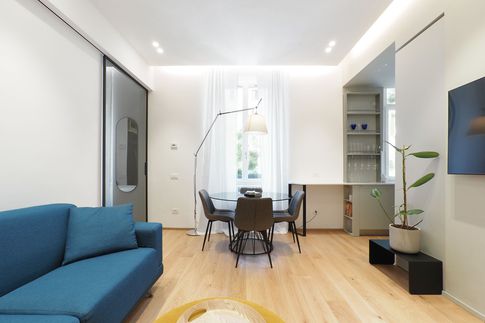 Unione di due appartamenti per creare maggiore spazio, rinnovo completo delle finiture. Cucina open space, grande sala da pranzo e nuova scala per accedere al primo piano. Una grande armadiatura lega i vari ambienti che risultano caldi e accoglienti.