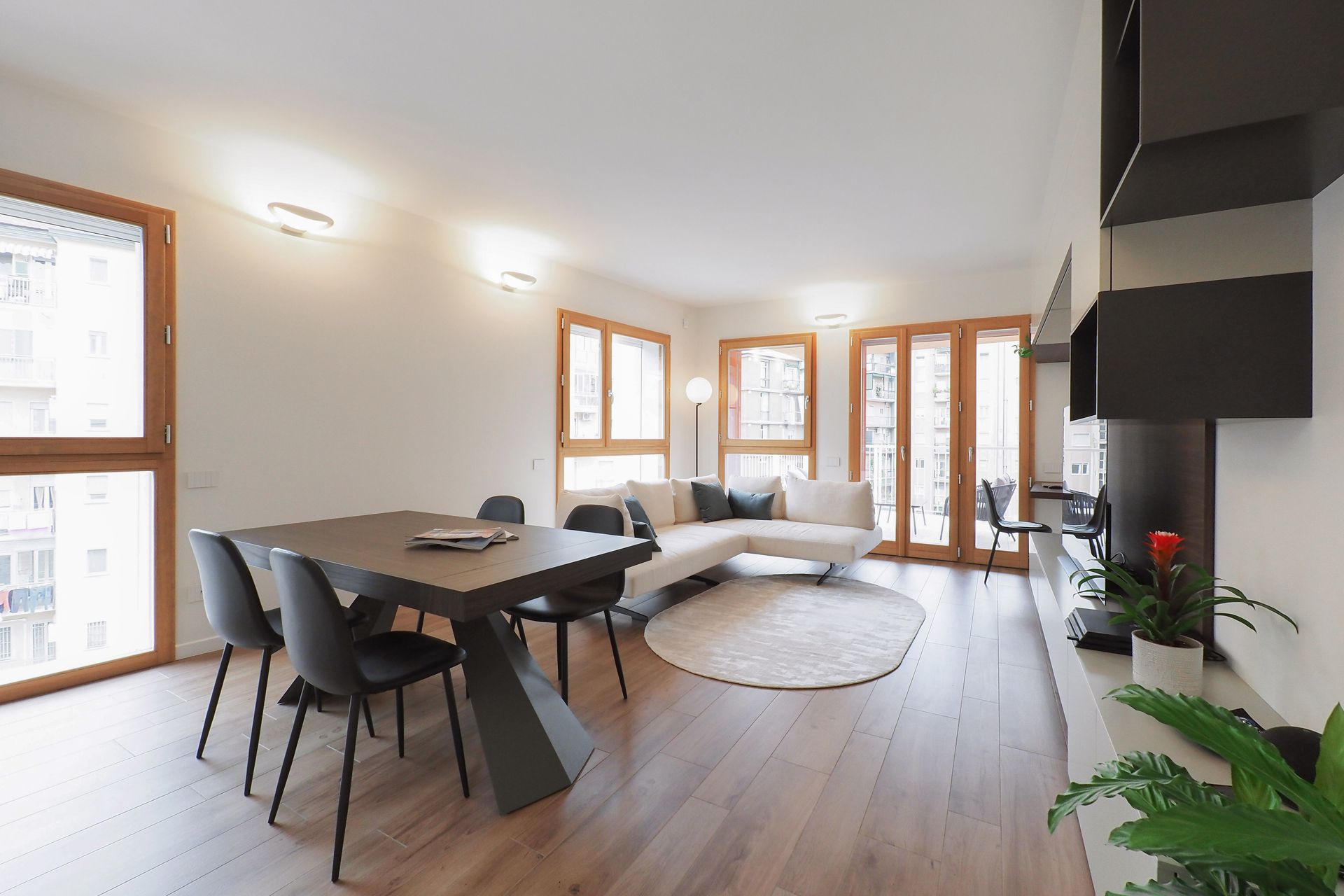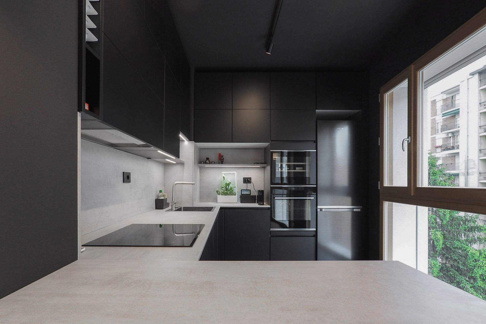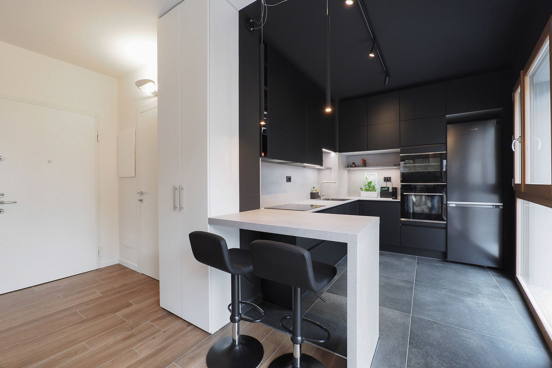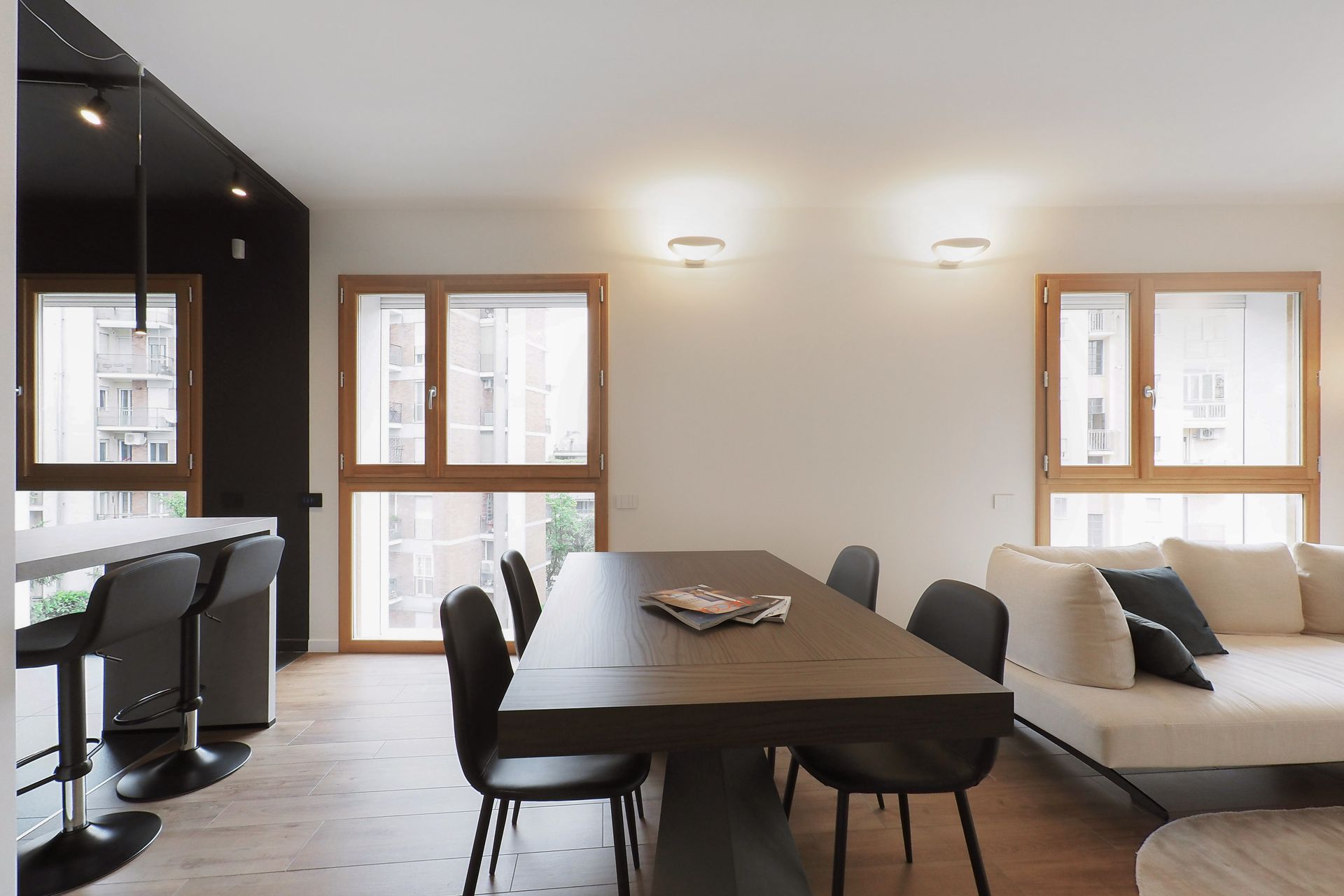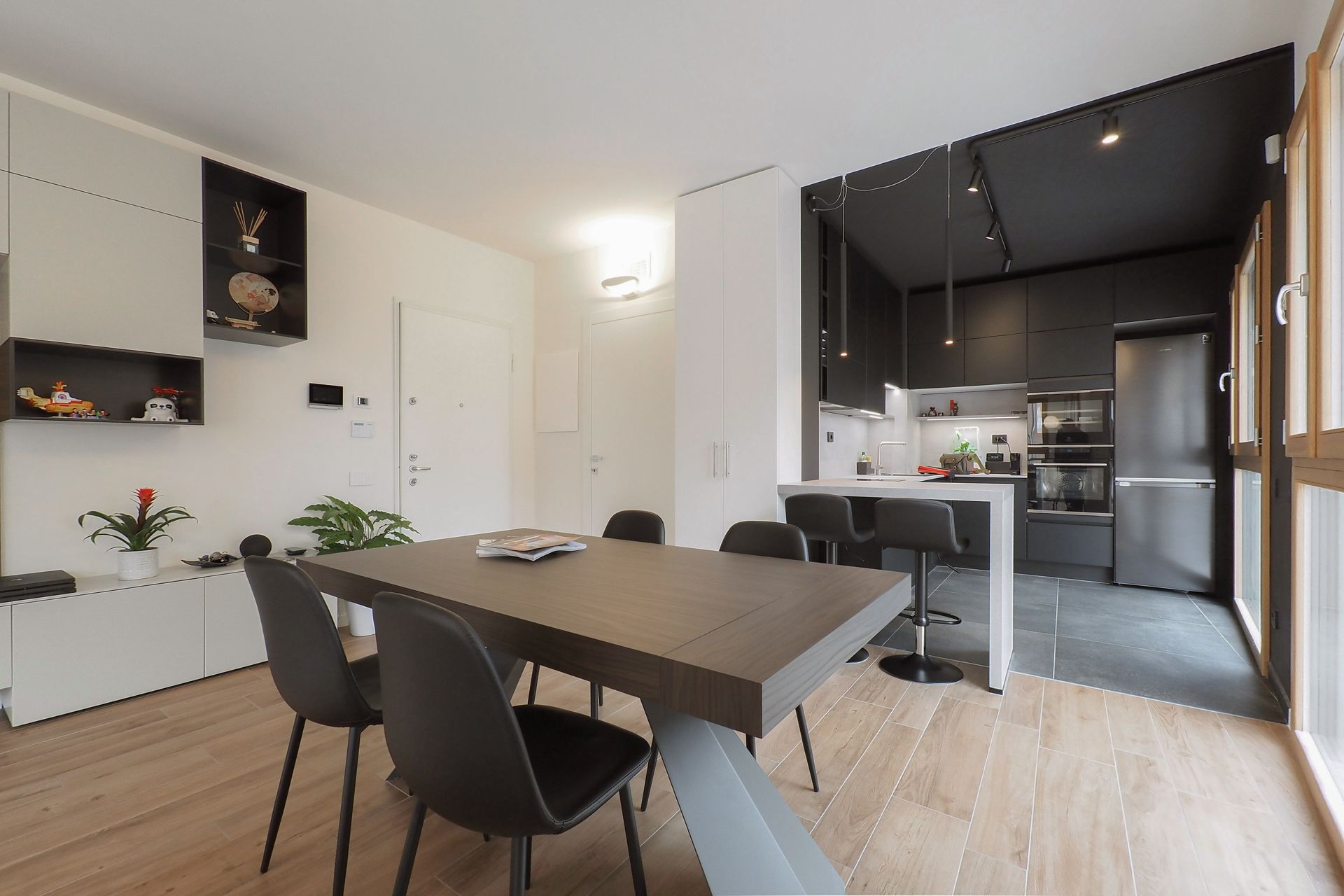 Un appartamento di nuova costruzione, apparentemente già definito in ogni sua parte, diventa il punto di partenza per un progetto di interior capace di riscrivere — con misura e intenzione — il modo di abitare dei suoi nuovi proprietari. Una giovane coppia affida allo spazio il compito di raccontare la propria identità, superando la neutralità tipica delle realizzazioni contemporanee per costruire un ambiente riconoscibile, stratificato e profondamente personale.La prima sfida non è stata progettuale in senso stretto, ma percettiva. Rendere leggibili gli spazi, farli immaginare e vivere prima ancora della loro realizzazione: è qui che il progetto prende forma, attraverso un processo di rappresentazione accurato e immersivo. Le immagini fotorealistiche diventano strumento di costruzione del dialogo, permettendo ai committenti di comprendere volumi, proporzioni e relazioni, trasformando l’astrazione del disegno in esperienza concreta.L’intervento si innesta con rispetto sull’impianto distributivo esistente, senza alterarne la struttura, ma lavorando per sottrazione e precisione, con l’obiettivo di amplificarne le potenzialità latenti. Non si tratta di una rivoluzione formale, ma di una riscrittura silenziosa, capace di ridefinire gerarchie e centralità attraverso pochi, calibrati gesti.Il segno più deciso si manifesta nella zona cucina. Originariamente marginale, quasi nascosta nella planimetria del costruttore, viene trasformata in elemento generatore dell’intero progetto. Un volume compatto, un cubo nero, emerge nello spazio con forza plastica, diventando fulcro visivo e funzionale della casa. La scelta cromatica, in continuità con le inclinazioni dei proprietari, accentua il carattere monolitico dell’elemento, che si impone come presenza scultorea e ordinatrice, capace di riorganizzare le relazioni tra gli ambienti.Intorno a questo nucleo, il soggiorno si apre e si distende verso il terrazzo, instaurando un dialogo diretto con la luce naturale e con l’esterno. La parete TV, disegnata su misura, non è solo un elemento contenitivo ma un dispositivo multifunzionale, che integra una postazione di lavoro domestico in modo discreto e coerente. In questo contesto, il divano con schienali freestanding introduce una dimensione dinamica: lo spazio si trasforma, si adatta, si riconfigura secondo le necessità quotidiane, riflettendo un’idea fluida dell’abitare contemporaneo.Il corridoio che conduce alla zona notte diventa occasione per un intervento puntuale e intelligente: una lavanderia completamente integrata, nascosta in una soluzione su misura, restituisce ordine e funzionalità senza interrompere la continuità visiva. Ancora una volta, è il dettaglio a costruire la qualità complessiva dello spazio.Il tema del volume puro ritorna nel bagno principale, dove il concetto del “cubo” viene reinterpretato per definire l’area vasca. Qui, la geometria diventa strumento di organizzazione e allo stesso tempo elemento espressivo, contribuendo a creare un ambiente intimo e coerente con il linguaggio dell’intero progetto.A unificare gli spazi è la scelta della pavimentazione in gres effetto legno, una superficie continua che introduce calore e matericità, contrapponendosi alla nettezza dei volumi.Questo registro materico si ritrova nei dettagli d’arredo — nel pannello retro TV, nel piano del tavolo — generando una trama sottile di richiami che attraversa l’intero appartamento.Il risultato è un interno che lavora per equilibri: tra pieni e vuoti, tra segni forti e interventi discreti, tra funzione e narrazione. Un progetto che dimostra come anche all’interno di un involucro apparentemente rigido sia possibile costruire un’identità precisa, dove ogni scelta — dal gesto più evidente al dettaglio più silenzioso — contribuisce a definire un nuovo modo di abitare.