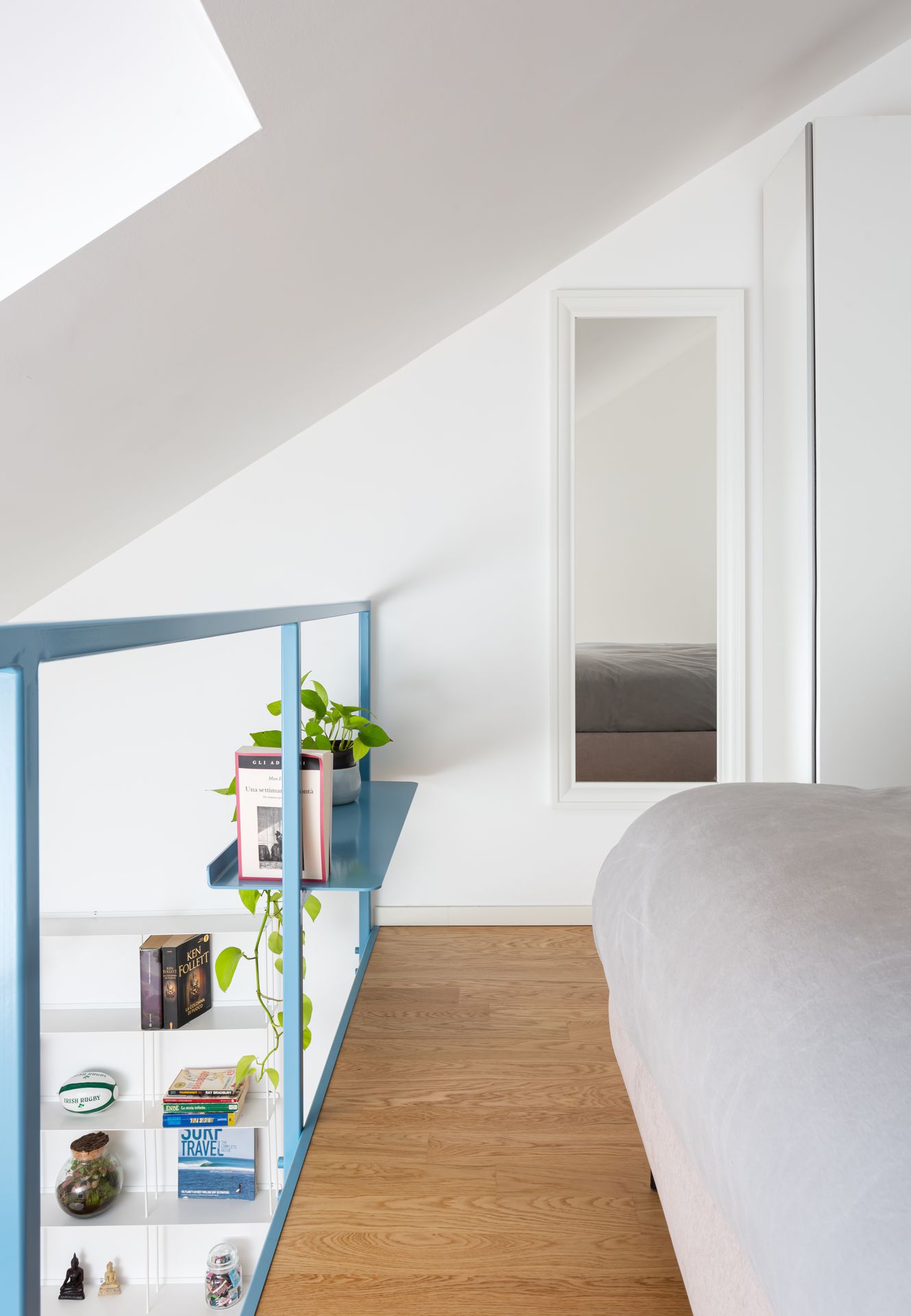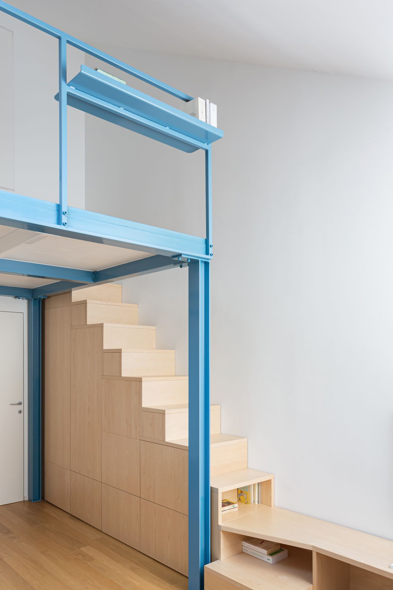 Appartamento MB è un monolocale ricavato dalla riqualificazione di un complesso industriale. Il progetto prende forma dall'innesto di un soppalco metallico che, sfruttando l'altezza dell'ambiente, aumenta la superficie per avere uno spazio notte alla quota superiore.La scala contenitiva incornicia l'ambiente facendo da sistema di risalita, armadiatura e mobile TV.
