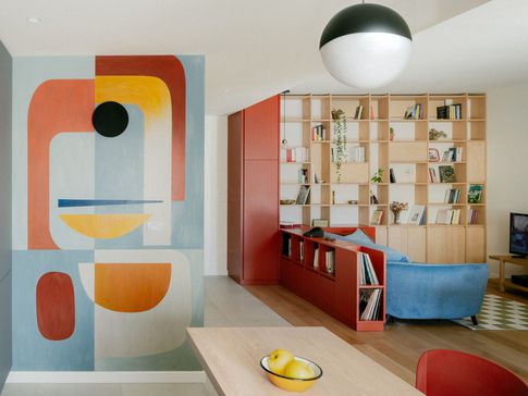 La sala da Pranzo con cucina è stata ricavata all'ingresso dell'appartamento, zona buia che con i suoi colori chiari e con la grande portafinestra della camera confinante diventa una stanza accogliente. Inoltre i colori dei dettagli aiutano ad essere fotogenica per lo scopo dell'appartamento.