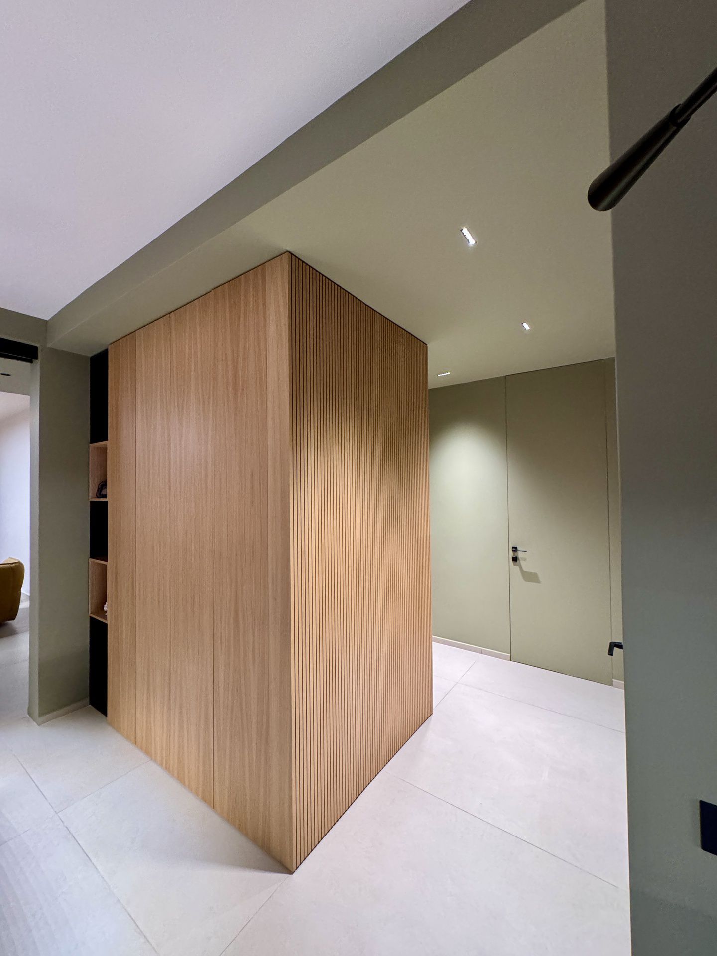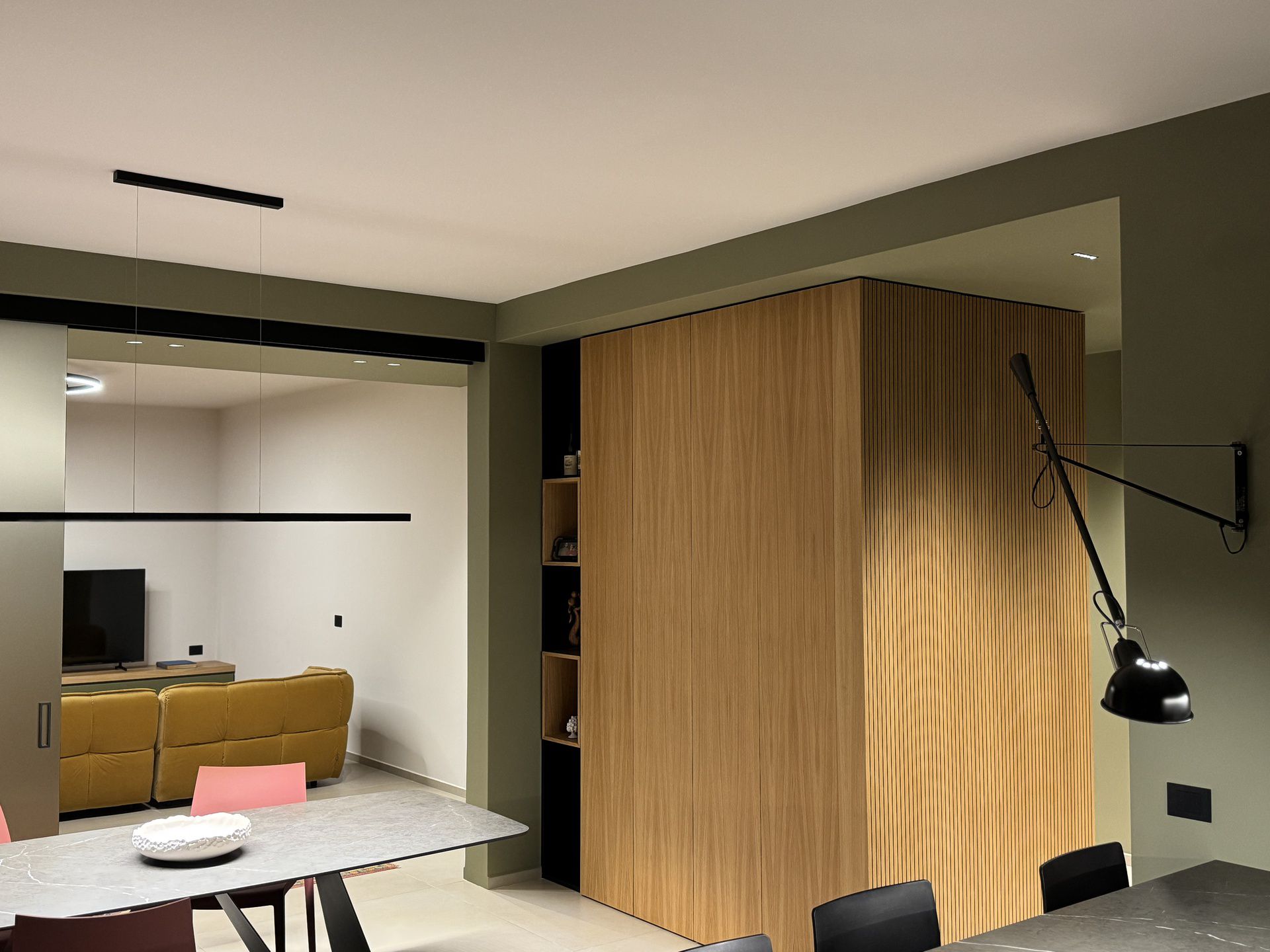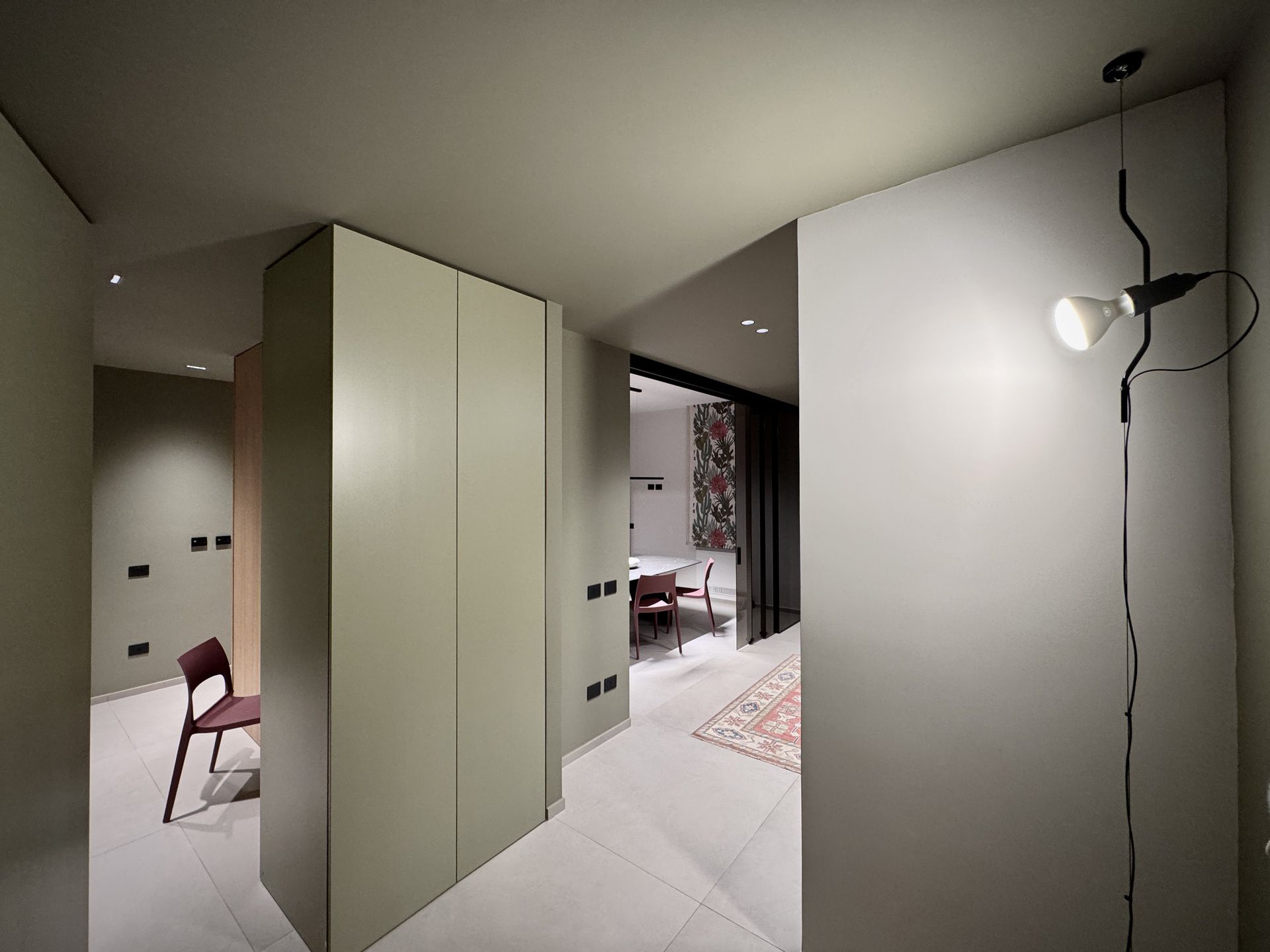Il progetto ha ribaltato l’impianto originario dell’appartamento, invertendo zona notte e zona giorno per un maggiore comfort. L’open-space iniziale si è trasformato in uno spazio definito da un complesso sistema di arredi artigianali, progettati per mutare e distribuire gli ambienti.