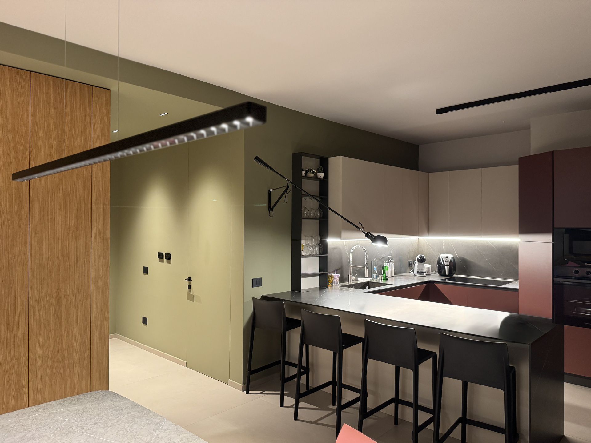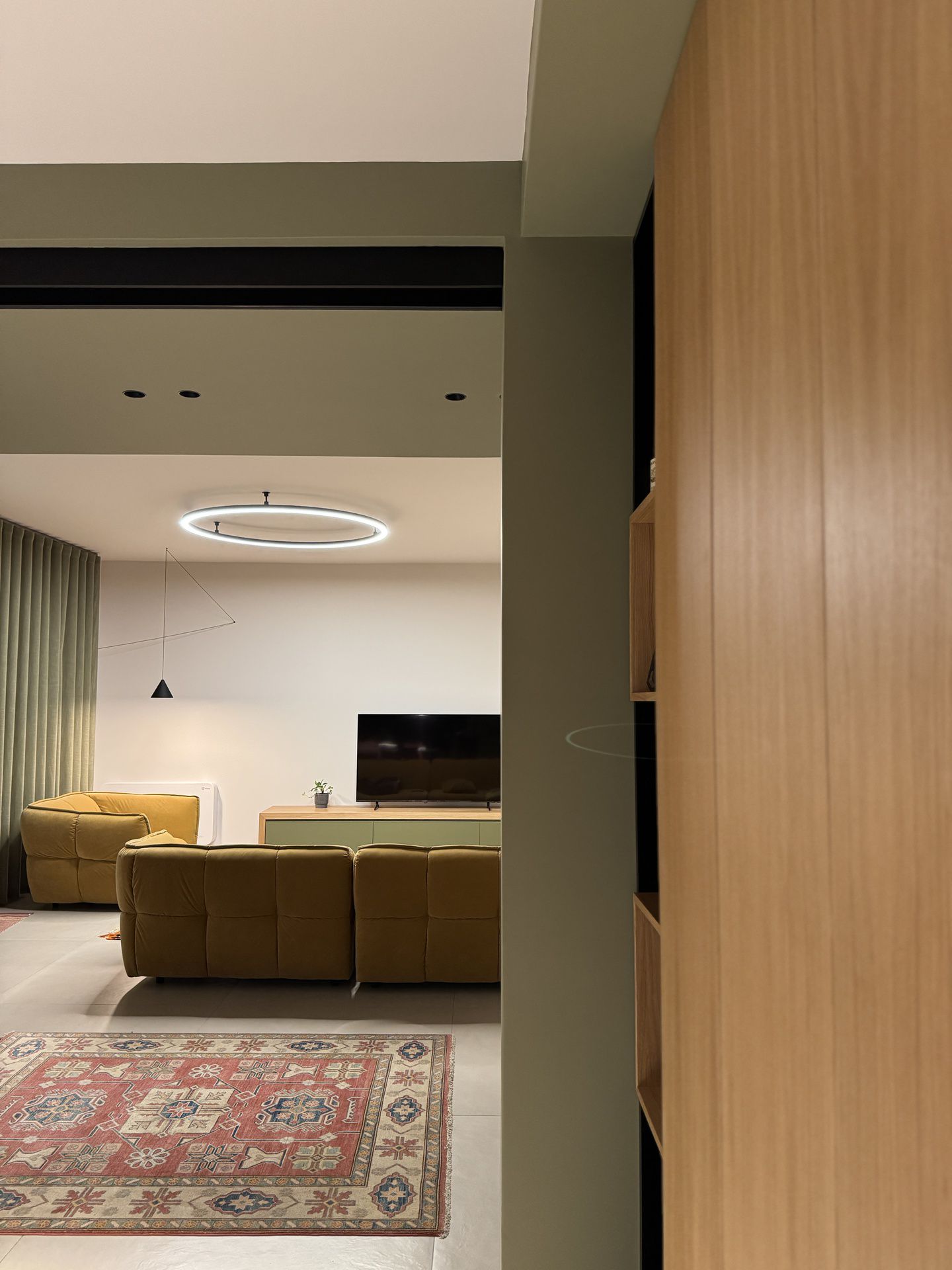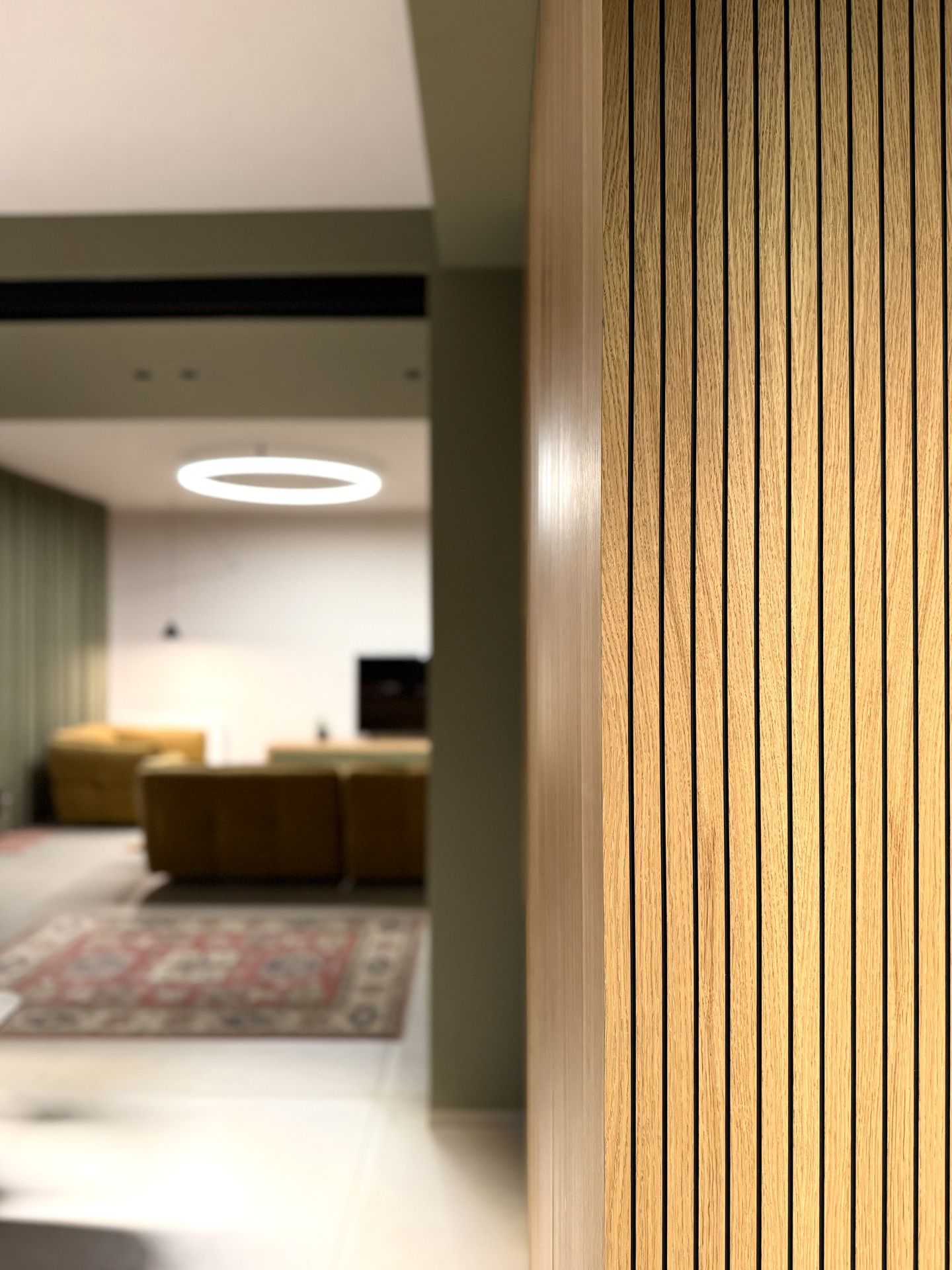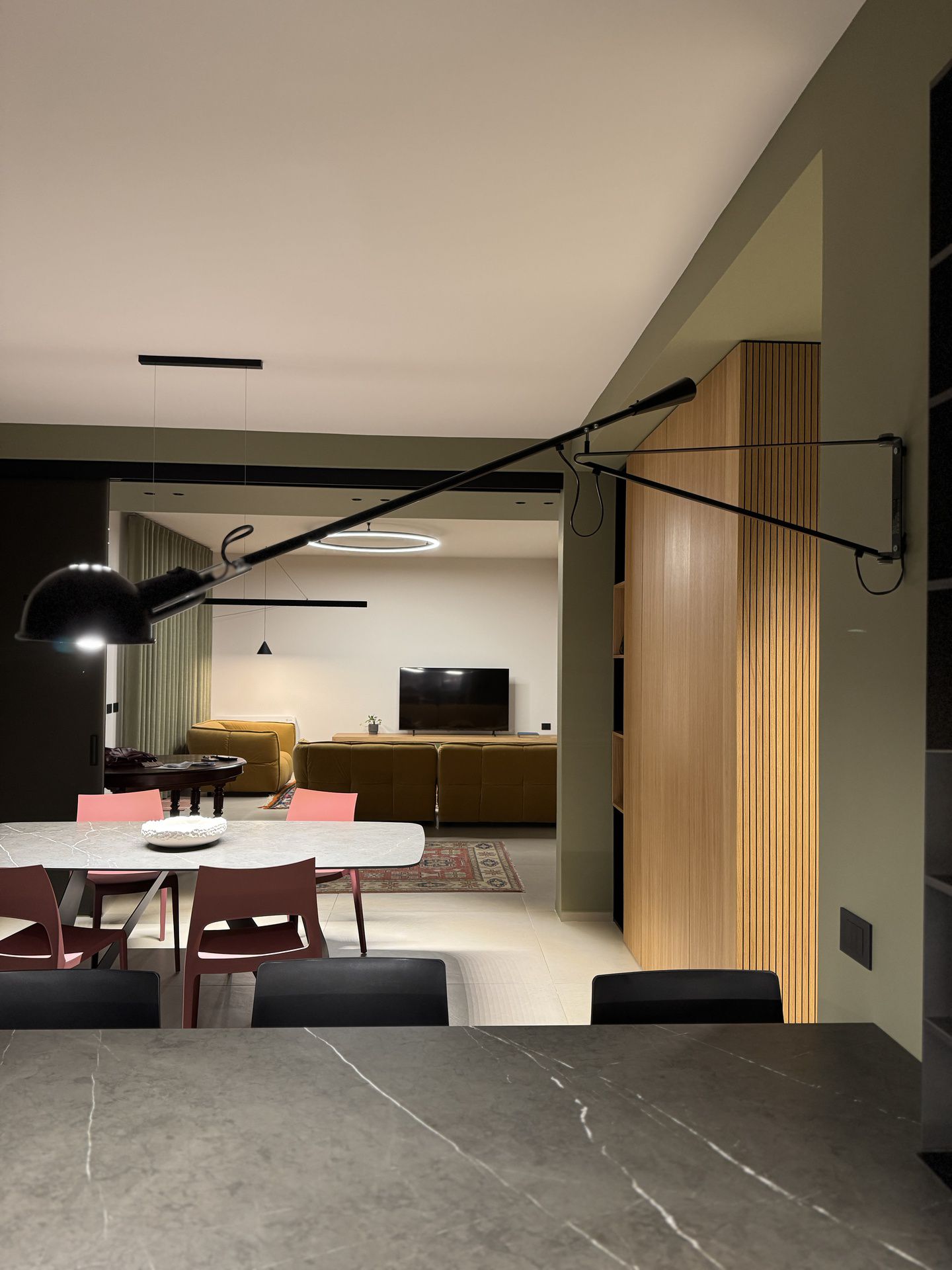 Il progetto ha ribaltato l’impianto originario dell’appartamento, invertendo zona notte e zona giorno per un maggiore comfort. L’open-space iniziale si è trasformato in uno spazio definito da un complesso sistema di arredi artigianali, progettati per mutare e distribuire gli ambienti.