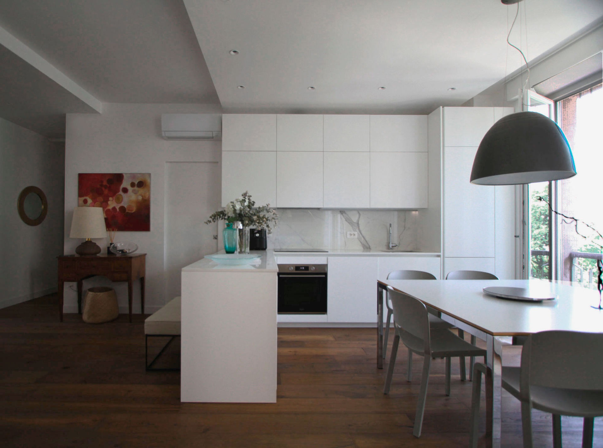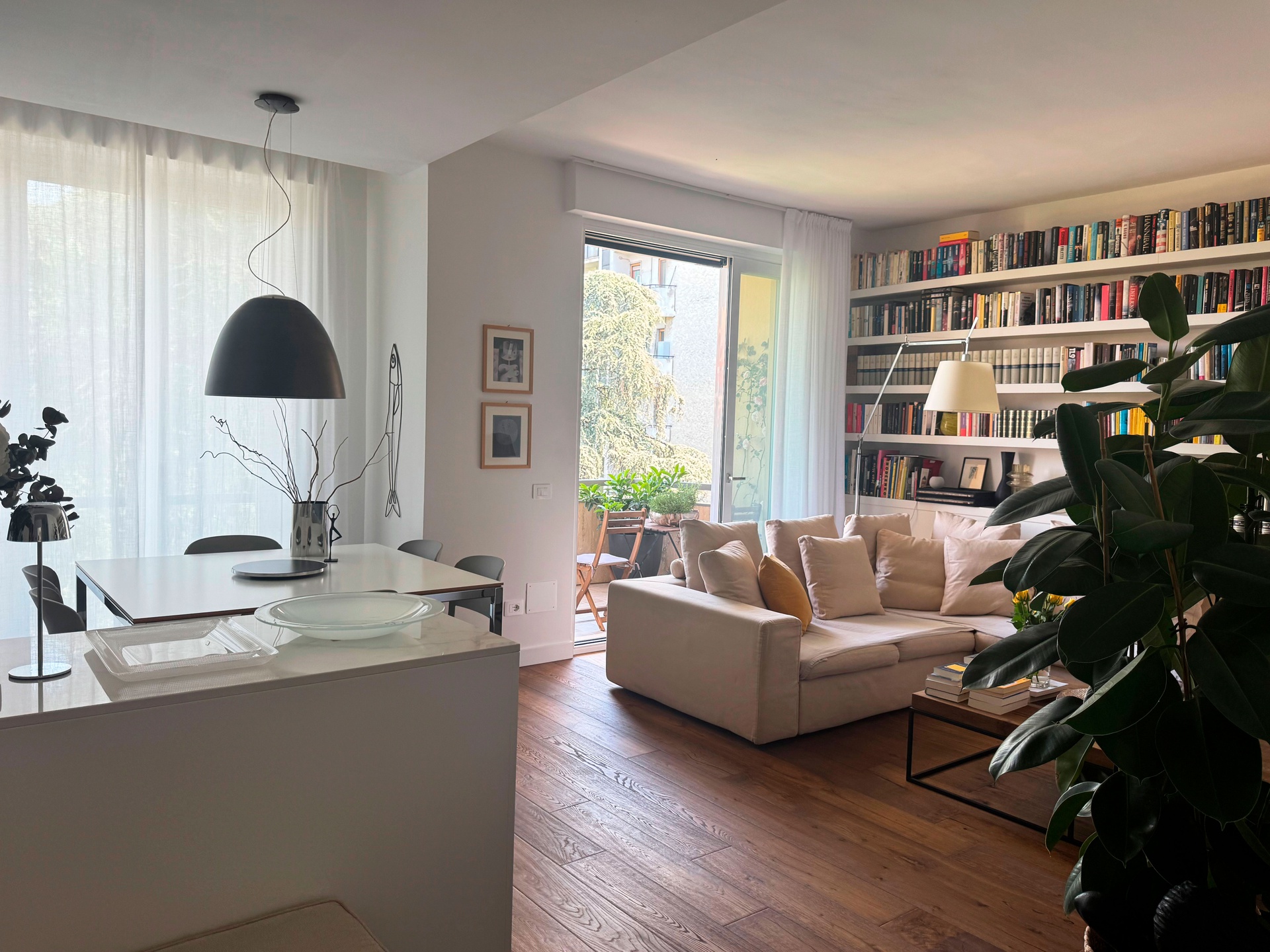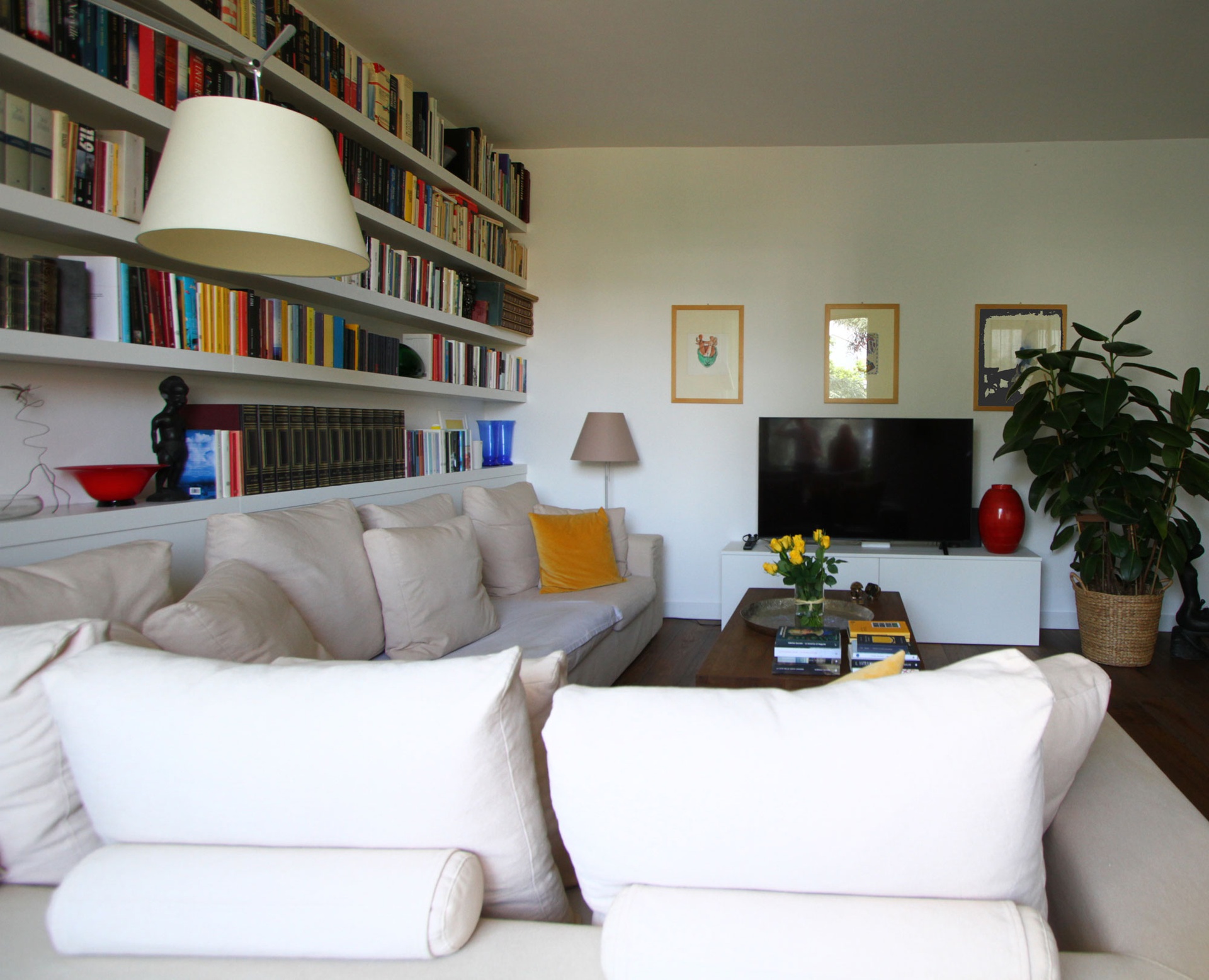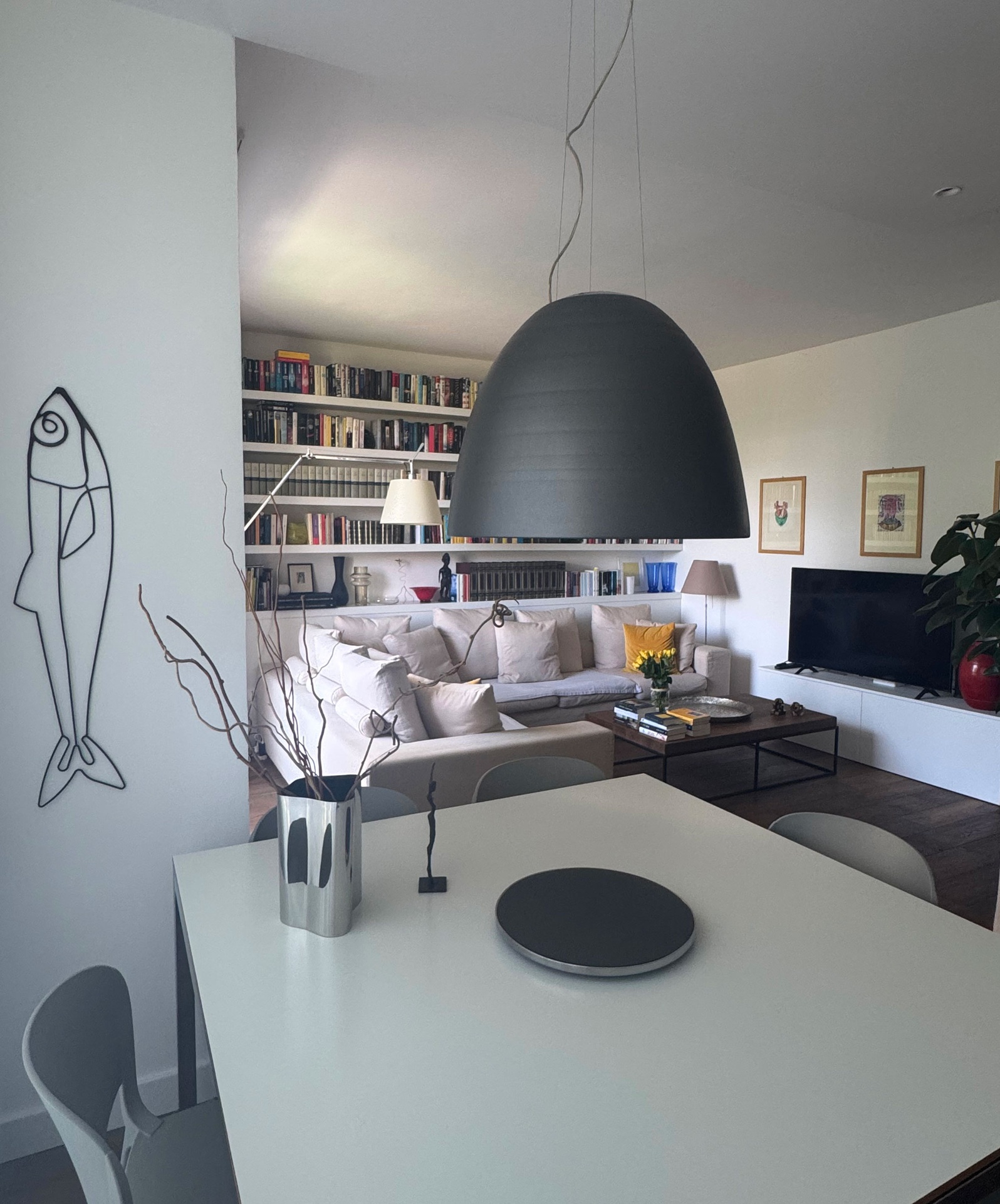 Mi ha contattato una coppia che aveva venduto la loro casa precedente: ora che i figli sono cresciuti, hanno preferito acquistare un’abitazione pensata solo per loro due. L’obiettivo principale era seguire i lavori di ristrutturazione, integrare alcuni arredi provenienti dalla vecchia casa e creare molti spazi contenitori. Abbiamo inserito in modo molto armonioso il tavolo e il divano della loro precedente abitazione, abbinandoli alla nuova cucina, e abbiamo realizzato una libreria su misura ispirata a quella che avevano prima. Il risultato è un soggiorno che riflette pienamente la personalità dei proprietari: la loro passione per i viaggi e per la lettura, il loro gusto e la loro sensibilità per i dettagli. Tutti gli armadi della casa sono stati realizzati su misura seguendo i nostri disegni. Nella camera da letto, il muro verde richiama la tonalità di verde della carta da parati del bagno. Per il bagno degli ospiti è stato scelto un pattern floreale. La casa accoglie anche alcuni mobili antichi, che abbiamo armonizzato con il nuovo design contemporaneo, unendo la storia della famiglia alla loro nuova abitazione.