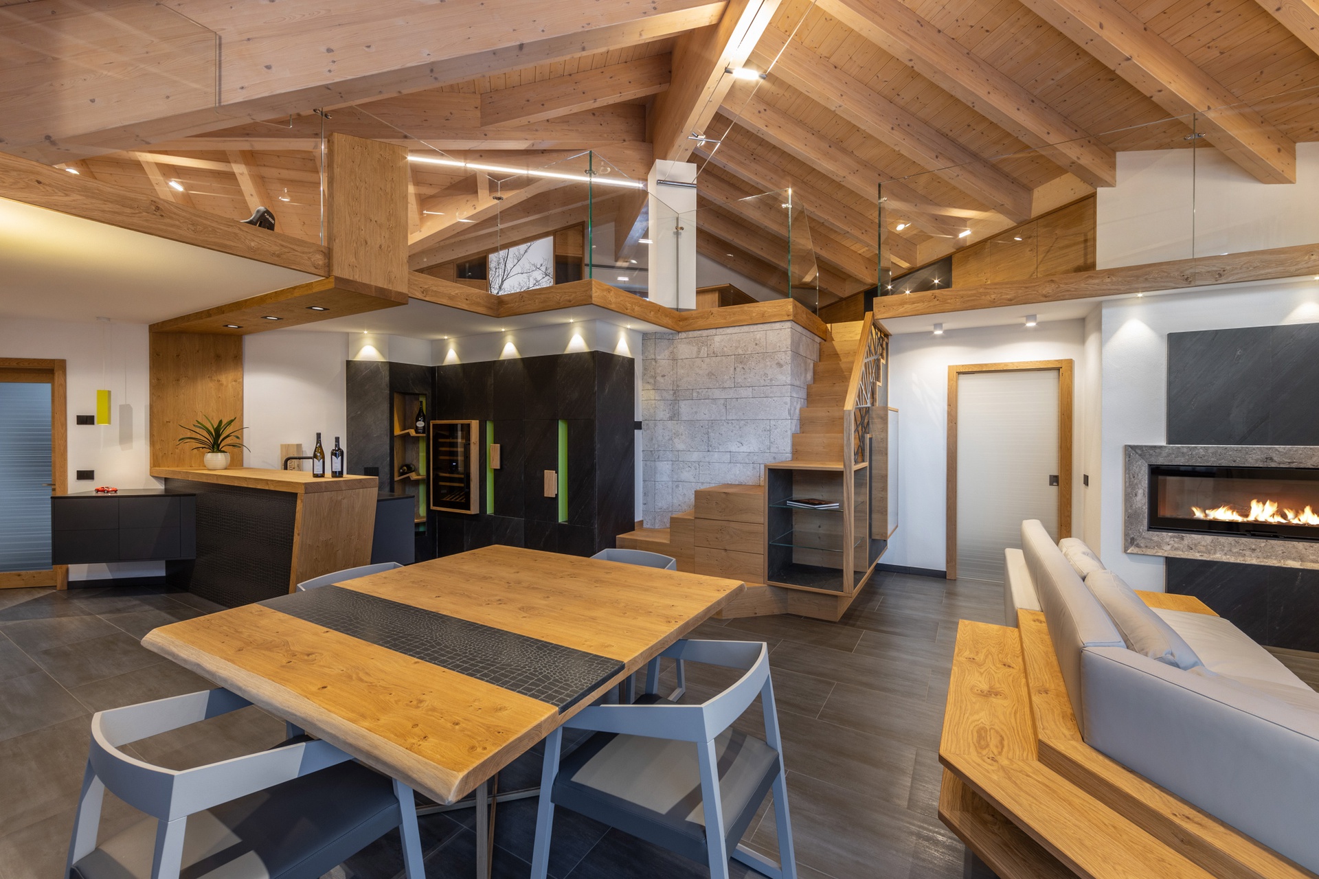 Ardesia Home è un progetto tailor made per una casa glamour e piena di carattere. I materiali utilizzati sono tutt'altro che comuni: Ardesia e Pietra Dolomia che accompagnano il legno di rovere, inserti in pelle e laccature opache. Divano su misura, scala con cassetti e libreria, angolo bar con cantina vini, armadio rivestito di carta da parati, letto sospeso e bagni dalle linee geometriche sono solo alcune delle peculiarità di questo progetto! Progetto Design: Arredamenti AndaloRealizzazione: Arredamenti Andalo