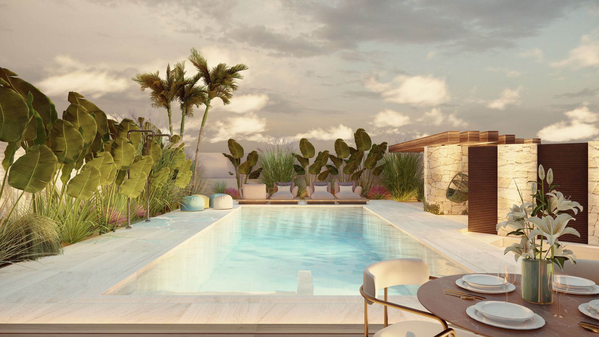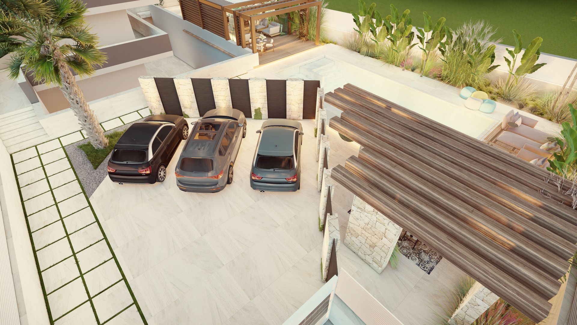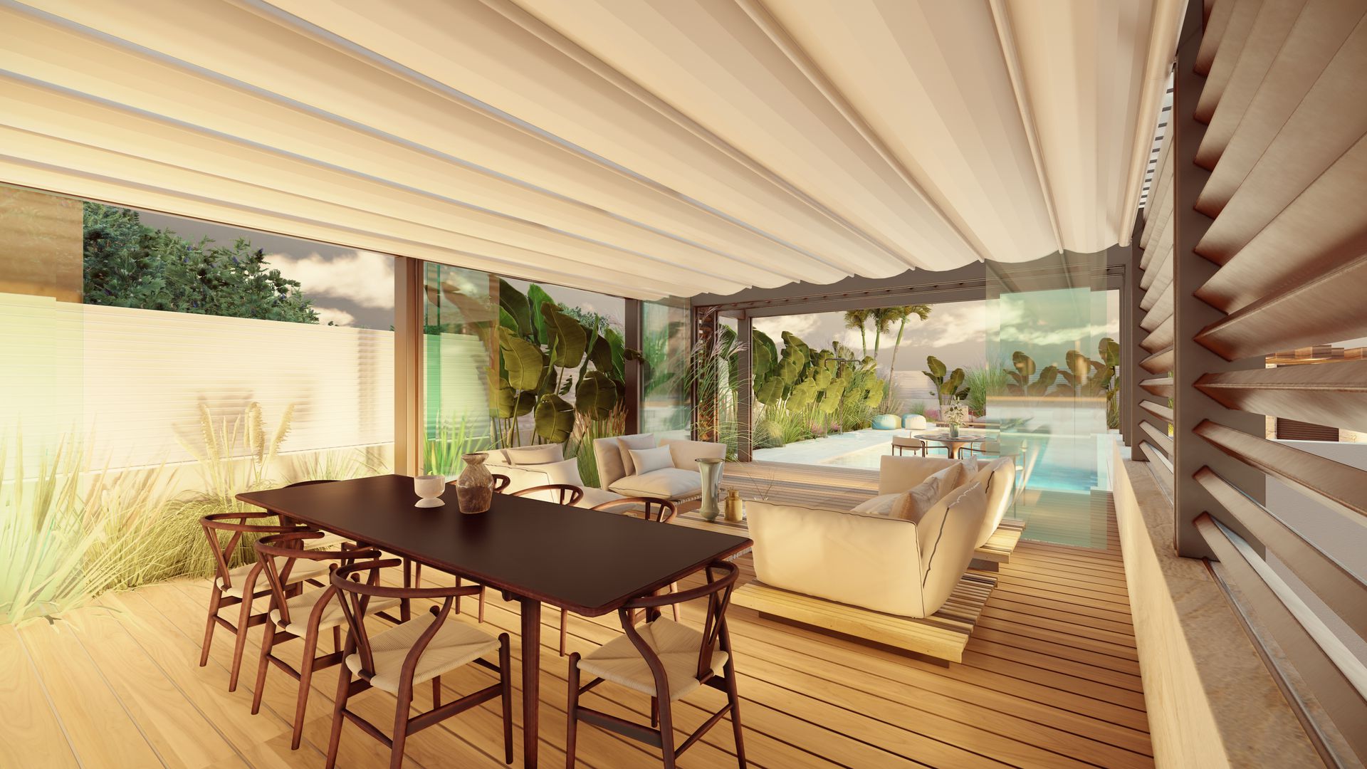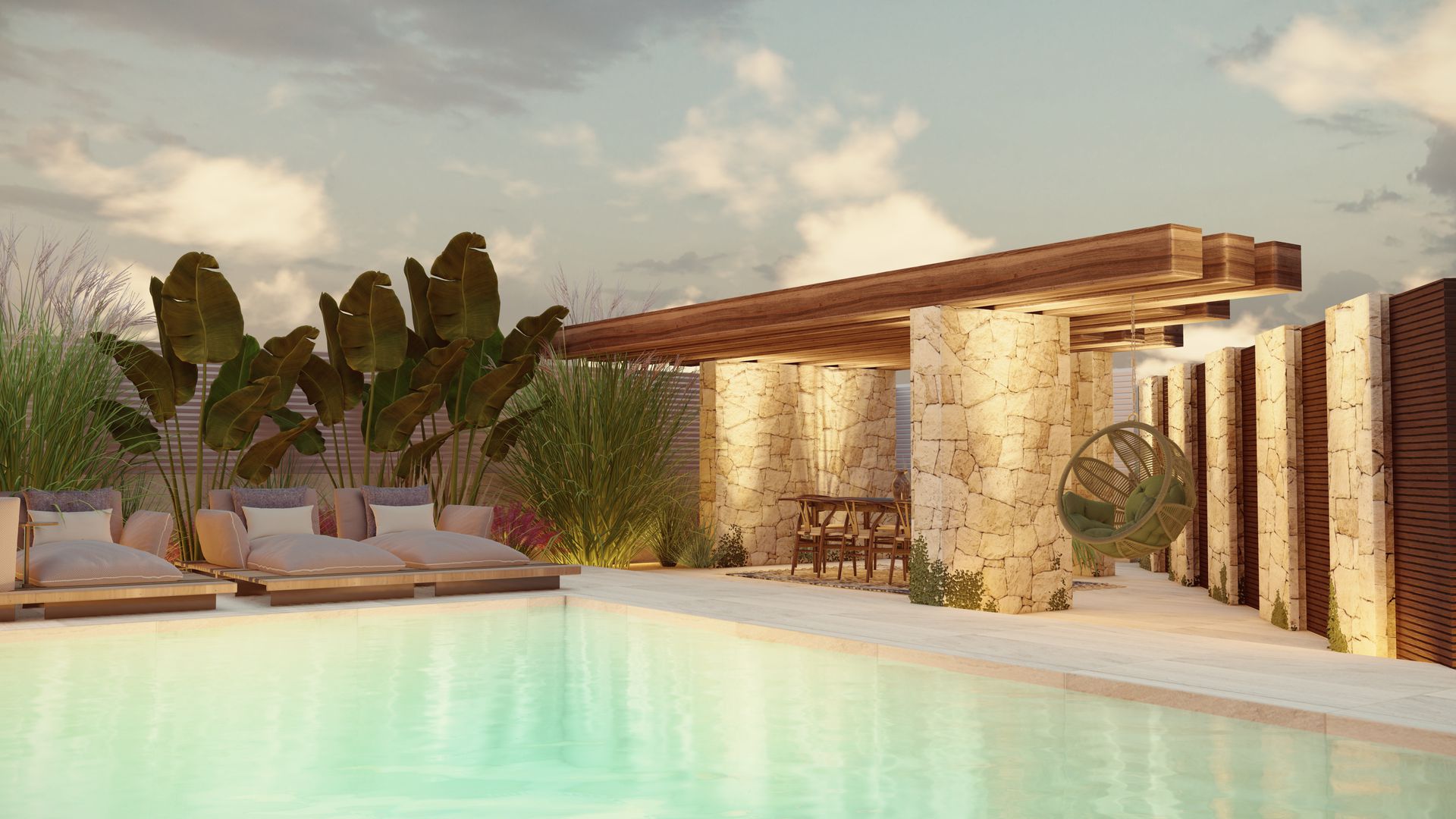 Pilastri in pietra spaccata a vista si alternano a louver in legno scuro, creando un gioco ritmico di luci e ombre lungo il bordo piscina.