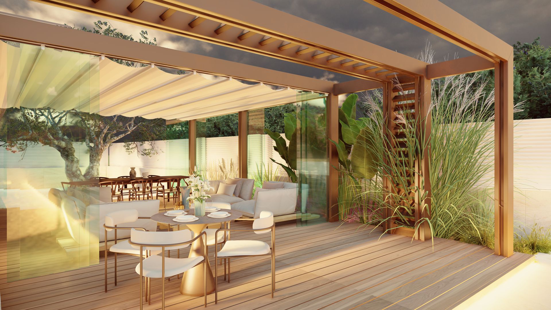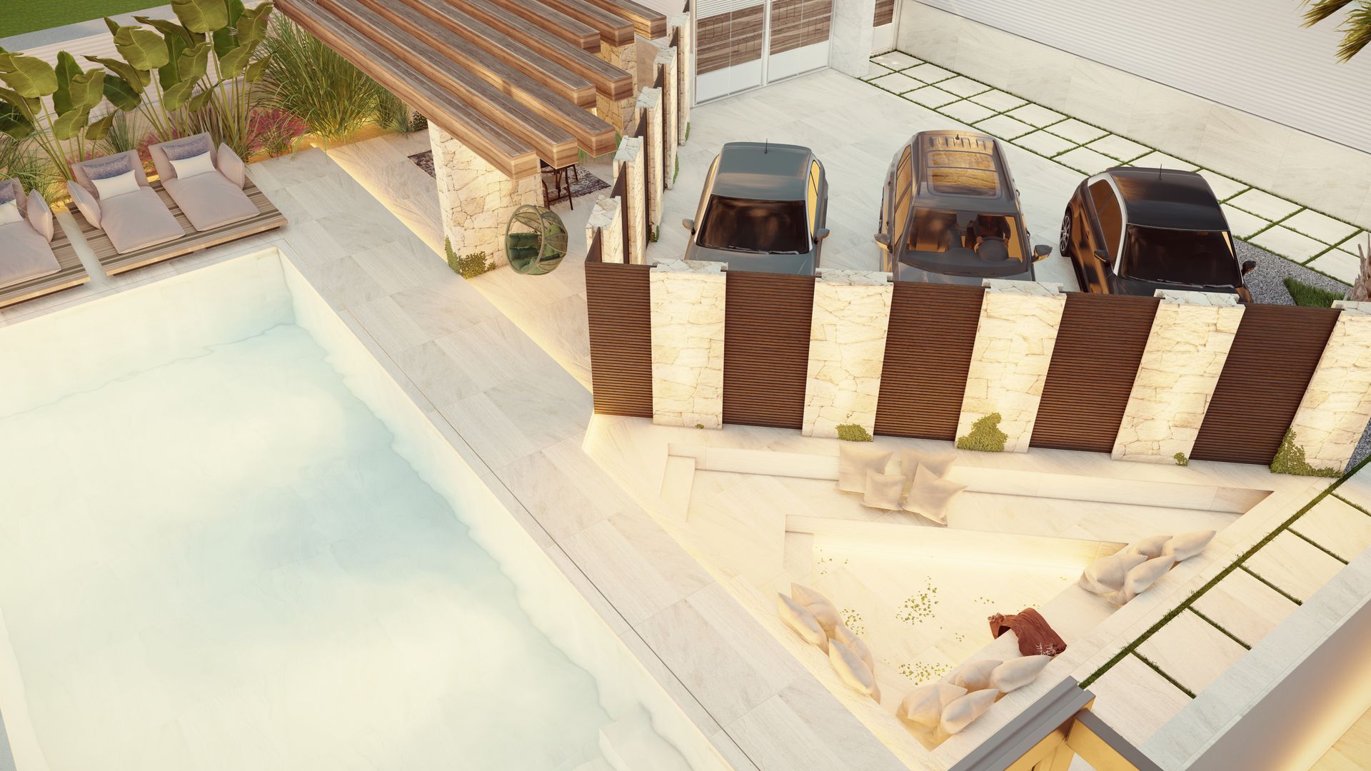 La sunken lounge (area seduta ribassata) incassata nel deck in travertino offre un rifugio intimo e scenografico, illuminato dal basso.
