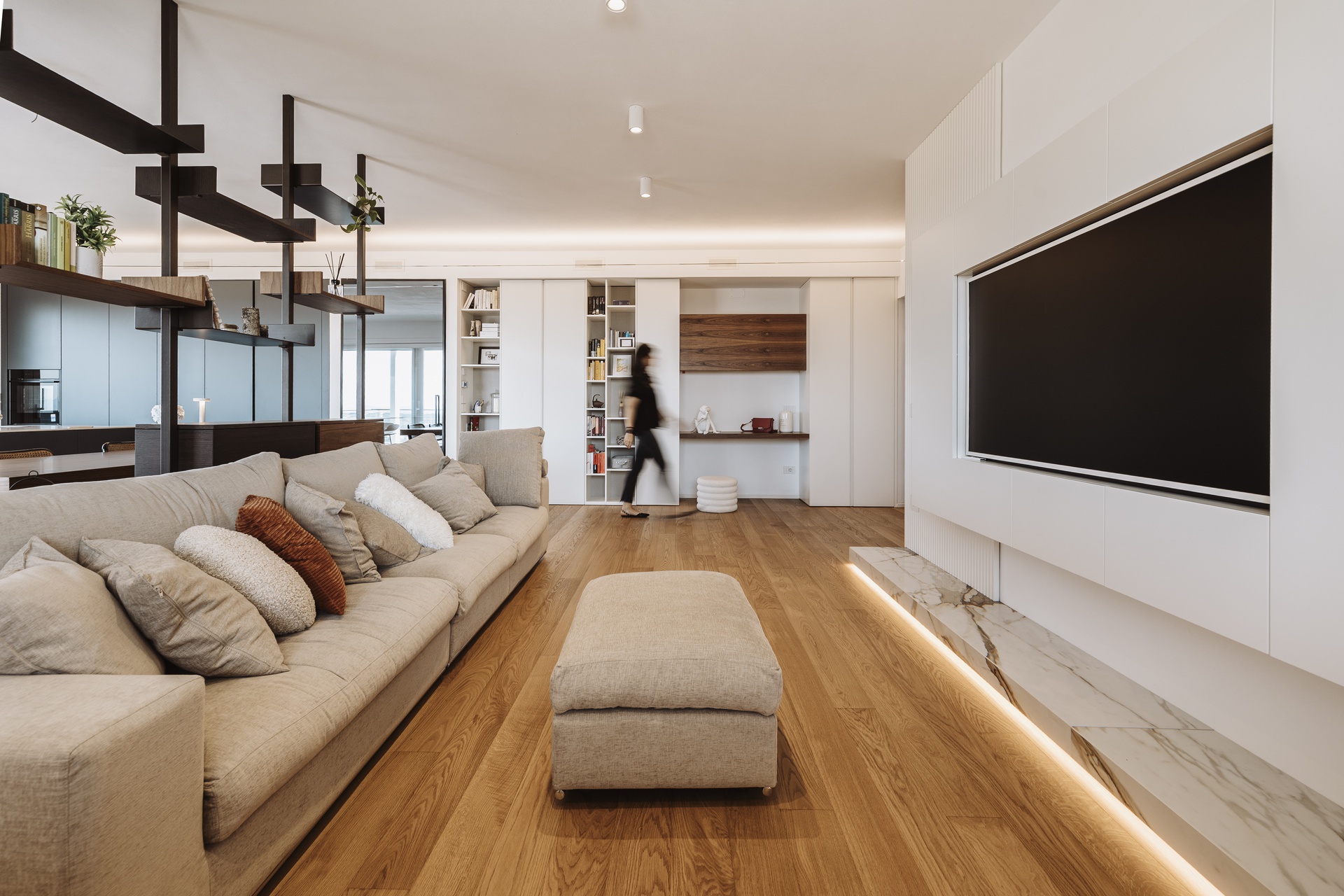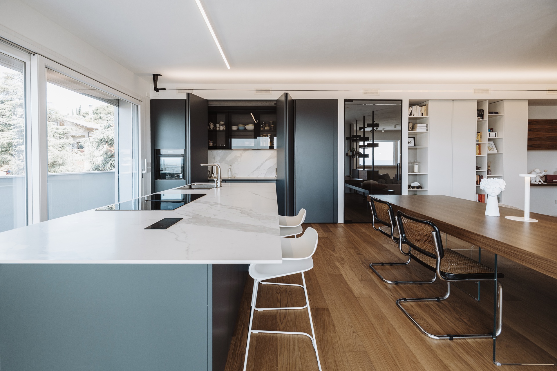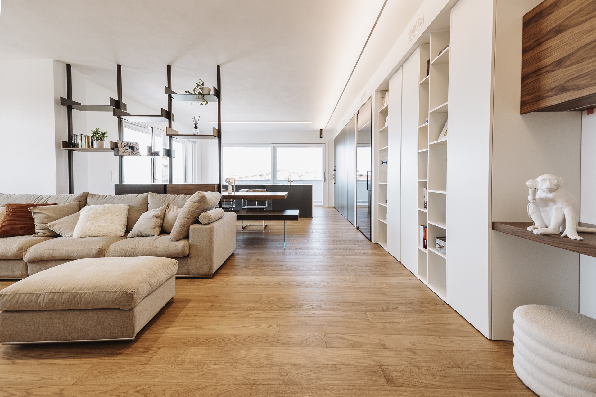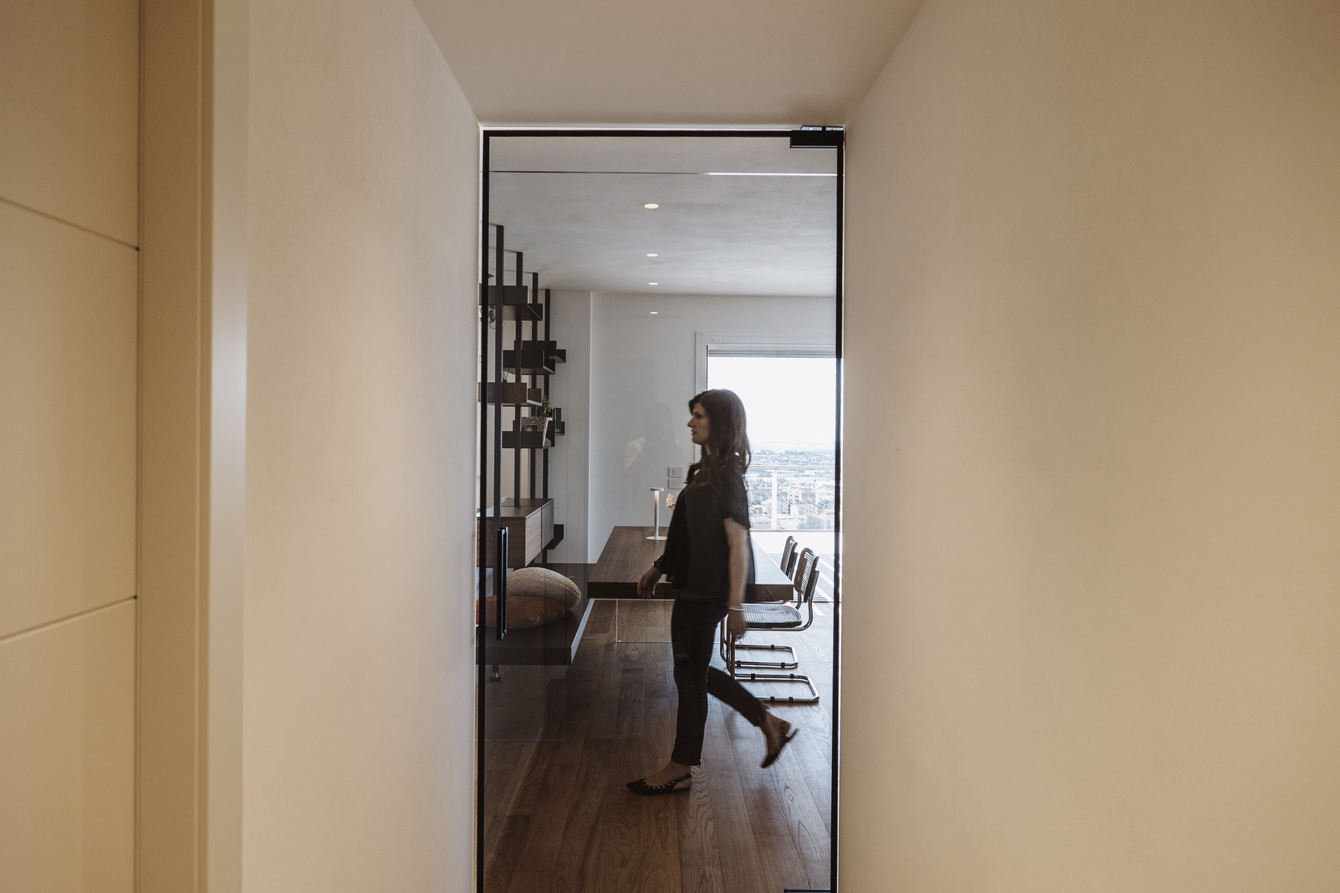 Un attico e superattico con piscina privata e vista panoramica su Perugia diventano il fulcro di un progetto di interior design pensato per valorizzare luce, comfort e convivialità. L’appartamento, estremamente luminoso, è caratterizzato da un grande open con un raffinato parquet resinato che dona continuità materica e calore agli ambienti.L’ingresso è definito da un armadio guardaroba su misura che integra un desk illuminato, creando uno spazio funzionale ed elegante. Elemento scenografico del living è il cubo TV rivestito in boiserie di legno, un volume architettonico che nasconde una porta a scomparsa per l’accesso al bagno ospiti e alla lavanderia, mantenendo pulizia visiva e ordine formale.La cucina, in una sofisticata tonalità grigio Londra, è progettata come cuore operativo e conviviale della casa: una grande isola centrale dialoga con le colonne attrezzate dotate di ante a scomparsa, che celano un pratico piano di lavoro e garantiscono massima funzionalità senza rinunciare all’estetica.L’intero progetto è guidato da una palette di colori caldi e naturali, studiata per creare un’atmosfera accogliente e armoniosa, ideale per la vita quotidiana e per la condivisione.La zona notte ospita due camere singole e una master bedroom concepita come una vera suite privata. Qui, una cabina armadio pass-through dialoga con una cabina armadio vetrata dedicata a borse e scarpe, mentre la zona letto è impreziosita da una boiserie retroilluminata e da un angolo trucco dedicato. Il bagno padronale si articola con un antibagno dotato di doppio mobile lavabo e una grande doccia walk-in, arricchita da una nicchia porta-saponi illuminata.Un progetto che coniuga estetica contemporanea, soluzioni su misura e una forte attenzione al benessere abitativo, trasformando l’attico in un ambiente esclusivo, confortevole e senza tempo.Salendo la scala interna si accede alla zona superattico, concepita come naturale estensione della casa e completamente al servizio della splendida terrazza panoramica. Qui, la piscina privata e il giardino pensile attrezzato dialogano con un’area polivalente pensata per il tempo libero e la convivialità: un ambiente dedicato all’accoglienza, dotato di angolo bar e barbecue, ideale per organizzare eventi, feste e momenti di condivisione con amici, il tutto incorniciato da una vista esclusiva sulla città di Perugia.