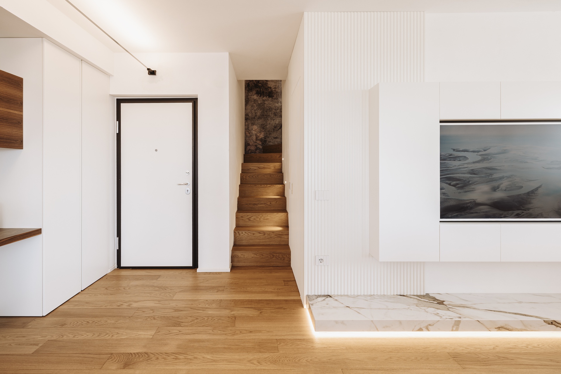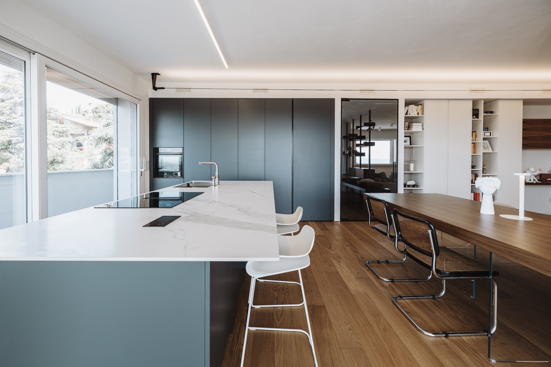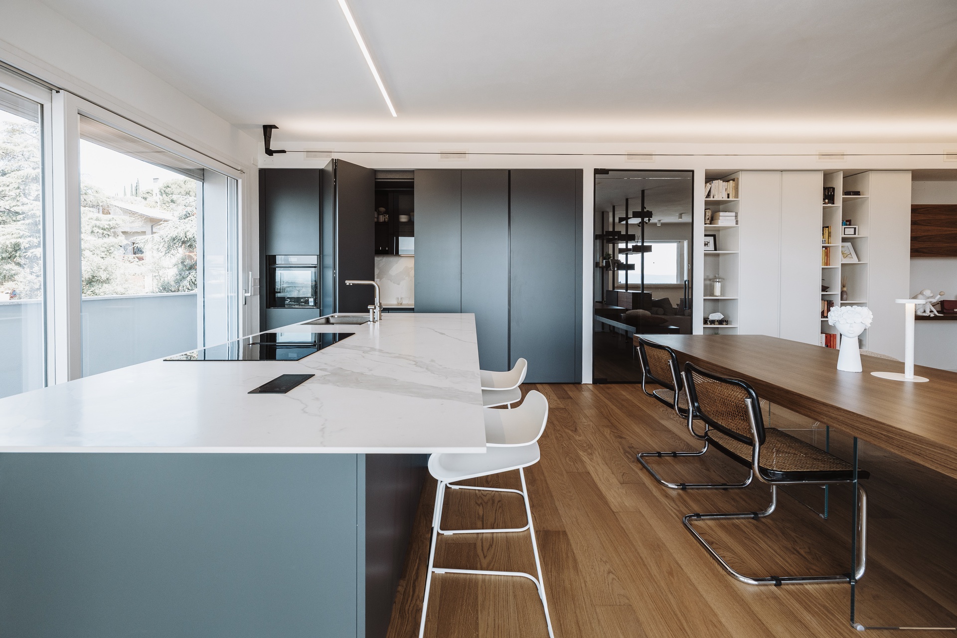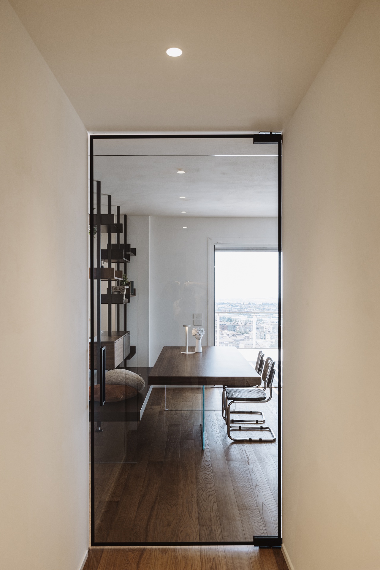 Un attico e superattico con piscina privata e vista panoramica su Perugia diventano il fulcro di un progetto di interior design pensato per valorizzare luce, comfort e convivialità. L’appartamento, estremamente luminoso, è caratterizzato da un grande open con un raffinato parquet resinato che dona continuità materica e calore agli ambienti.L’ingresso è definito da un armadio guardaroba su misura che integra un desk illuminato, creando uno spazio funzionale ed elegante. Elemento scenografico del living è il cubo TV rivestito in boiserie di legno, un volume architettonico che nasconde una porta a scomparsa per l’accesso al bagno ospiti e alla lavanderia, mantenendo pulizia visiva e ordine formale.La cucina, in una sofisticata tonalità grigio Londra, è progettata come cuore operativo e conviviale della casa: una grande isola centrale dialoga con le colonne attrezzate dotate di ante a scomparsa, che celano un pratico piano di lavoro e garantiscono massima funzionalità senza rinunciare all’estetica.L’intero progetto è guidato da una palette di colori caldi e naturali, studiata per creare un’atmosfera accogliente e armoniosa, ideale per la vita quotidiana e per la condivisione.La zona notte ospita due camere singole e una master bedroom concepita come una vera suite privata. Qui, una cabina armadio pass-through dialoga con una cabina armadio vetrata dedicata a borse e scarpe, mentre la zona letto è impreziosita da una boiserie retroilluminata e da un angolo trucco dedicato. Il bagno padronale si articola con un antibagno dotato di doppio mobile lavabo e una grande doccia walk-in, arricchita da una nicchia porta-saponi illuminata.Un progetto che coniuga estetica contemporanea, soluzioni su misura e una forte attenzione al benessere abitativo, trasformando l’attico in un ambiente esclusivo, confortevole e senza tempo.Salendo la scala interna si accede alla zona superattico, concepita come naturale estensione della casa e completamente al servizio della splendida terrazza panoramica. Qui, la piscina privata e il giardino pensile attrezzato dialogano con un’area polivalente pensata per il tempo libero e la convivialità: un ambiente dedicato all’accoglienza, dotato di angolo bar e barbecue, ideale per organizzare eventi, feste e momenti di condivisione con amici, il tutto incorniciato da una vista esclusiva sulla città di Perugia.
