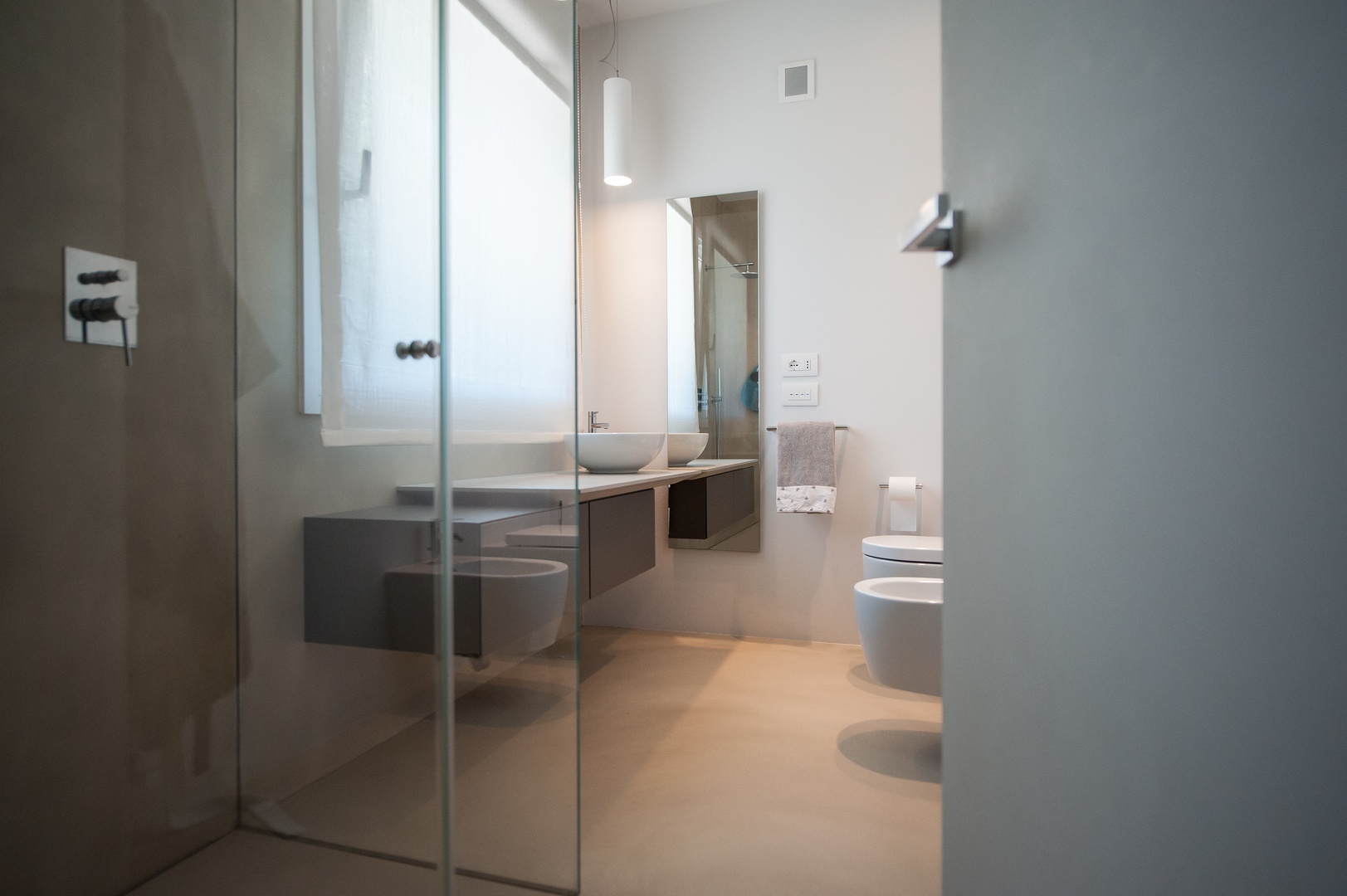Ristrutturazione all’ultimo piano di una residenza che affaccia sulle colline marchigiane. Sul lato ovest, dove si trovava un grande balcone sono state aperte due grandi finestre per godere della vista. “Svuotando” il solaio è stata valorizzata la zona soggiorno-pranzo arricchendola con l’installazione di un moderno camino intagliato sulla parete; un’infilata di contenitori tra zona giorno e zona notte, simula una vera e propria spina dorsale, che è l’origine della distribuzione interna. Il pavimento in resina si fonde con quello esterno del lungo balcone in versione drenante. Un impianto fotovoltaico da 6kw alimentato da pompa di calore e piano cottura a induzione completano l’intervento.