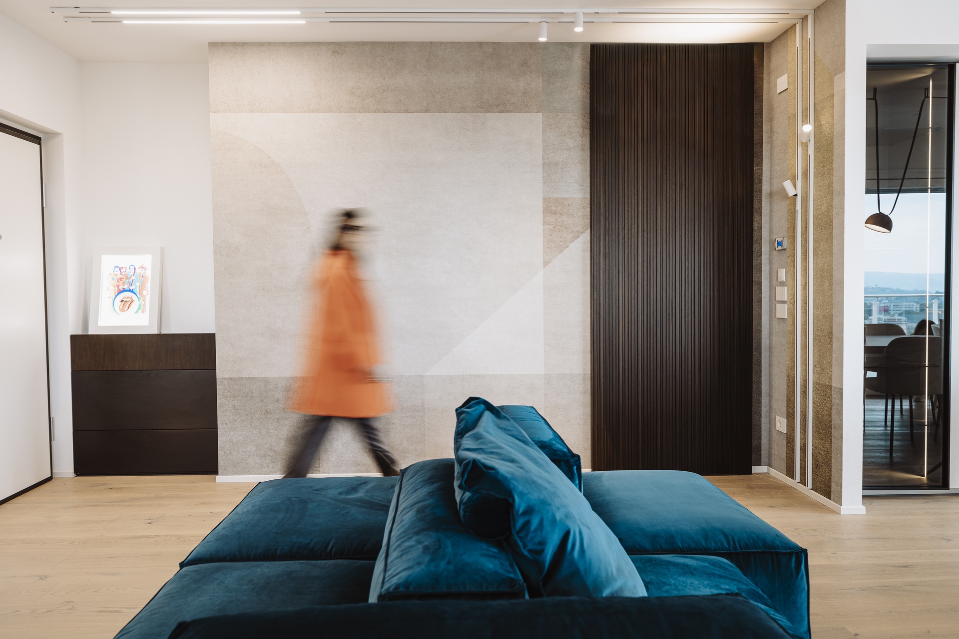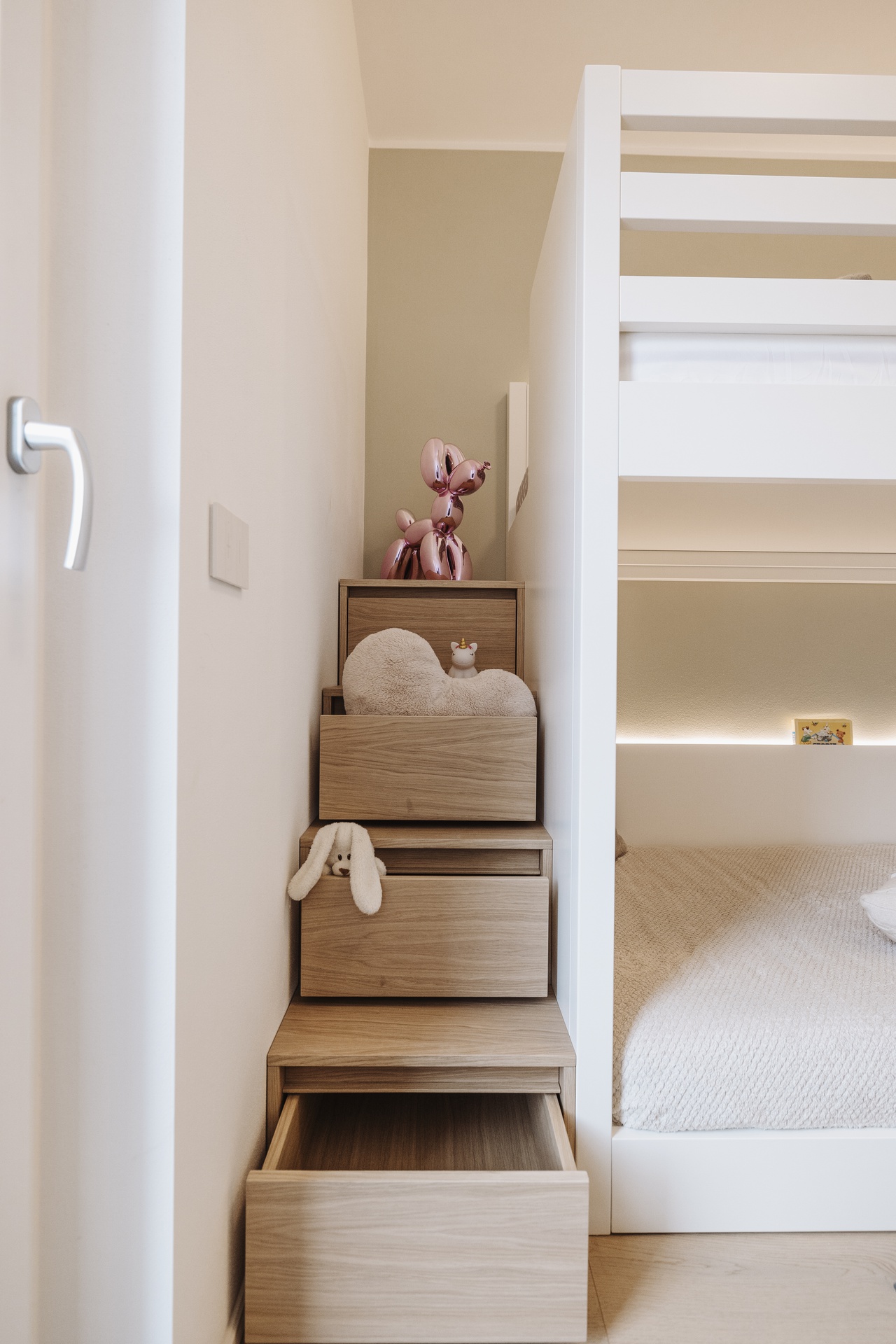 In un elegante palazzo di nuova costruzione, prende vita un progetto d’interior che abbraccia la luce e celebra lo spazio: attico e superattico con piscina privata, pensato in ogni dettaglio per offrire un’esperienza abitativa su misura.La zona giorno si apre in un ampio open-space luminoso e accogliente, dove il parquet resinato incontra arredi realizzati ad hoc, disegnando ambienti funzionali ma ricchi di personalità. La cucina è un vero e proprio cuore pulsante della casa: una grande isola centrale con tavolo integrato domina la scena, con un piano cottura a induzione che cela una cappa integrata, lasciando libera la vista sul panorama. L’isola, contenitiva su entrambi i lati, dialoga con una colonna dispensa in vetro retroilluminato e pensili con taglio orizzontale che dinamizzano lo spazio rendendo la cucina sofisticata e contemporanea.Il living si sviluppa attorno a un importante divano dal tessuto blu cangiante, protagonista fluido dello spazio: ruota idealmente nella stanza offrendo molteplici prospettive, sia verso l’esterno con la vista panoramica, sia verso l’interno, dove una libreria a cubi e una zona lettura con panca creano un angolo raccolto e ispirato. A impreziosire l’ingresso, una carta da parati geometrica dai toni pastello fa da sfondo a una nicchia contenitiva svuota-tasche e a una porta scorrevole fresata che conduce, con discrezione, alla zona notte.Superata la porta, troviamo un pratico armadio guardaroba con illuminazione integrata e il primo bagno, funzionale anche per gli ospiti. Qui, piastrelle dai toni chiari si estendono fino al soffitto, mentre la doccia è arricchita da una raffinata carta da parati in fibra di vetro a tema floreale, nicchia portasapone e profilo led verticale.La zona notte prosegue con una camera da favola per due piccole principesse: un castello, una cabina armadio, cassetti segreti nascosti nelle scale e tante soluzioni contenitive intelligenti, tutte su misura, con luci integrate e scaffali per ospitare libri e sogni.La master bedroom accoglie con eleganza: una cabina armadio in rovere scuro all’ingresso, pareti decorate con boiserie colorate, angolo beauty e un bagno privato dai toni rosso mattone, intimo e ricercato.Dal living, una scala a tappetto in legno e primo gradino in resina introduce al piano superiore, accompagnata da pannelli su misura in rovere fresato e bianco, che celano un pratico vano lavanderia. Salendo, si apre il superattico: il tetto in legno avvolge un secondo soggiorno con libreria e desk su misura, perfettamente integrati con la seconda cucina, pensata per vivere appieno i momenti conviviali.E infine, il gioiello della casa: la terrazza con piscina privata e vista mozzafiato, perfetta per rilassarsi, festeggiare e godere appieno dell’incanto di un progetto dove ogni dettaglio racconta una storia di stile, funzionalità e bellezza su misura.
