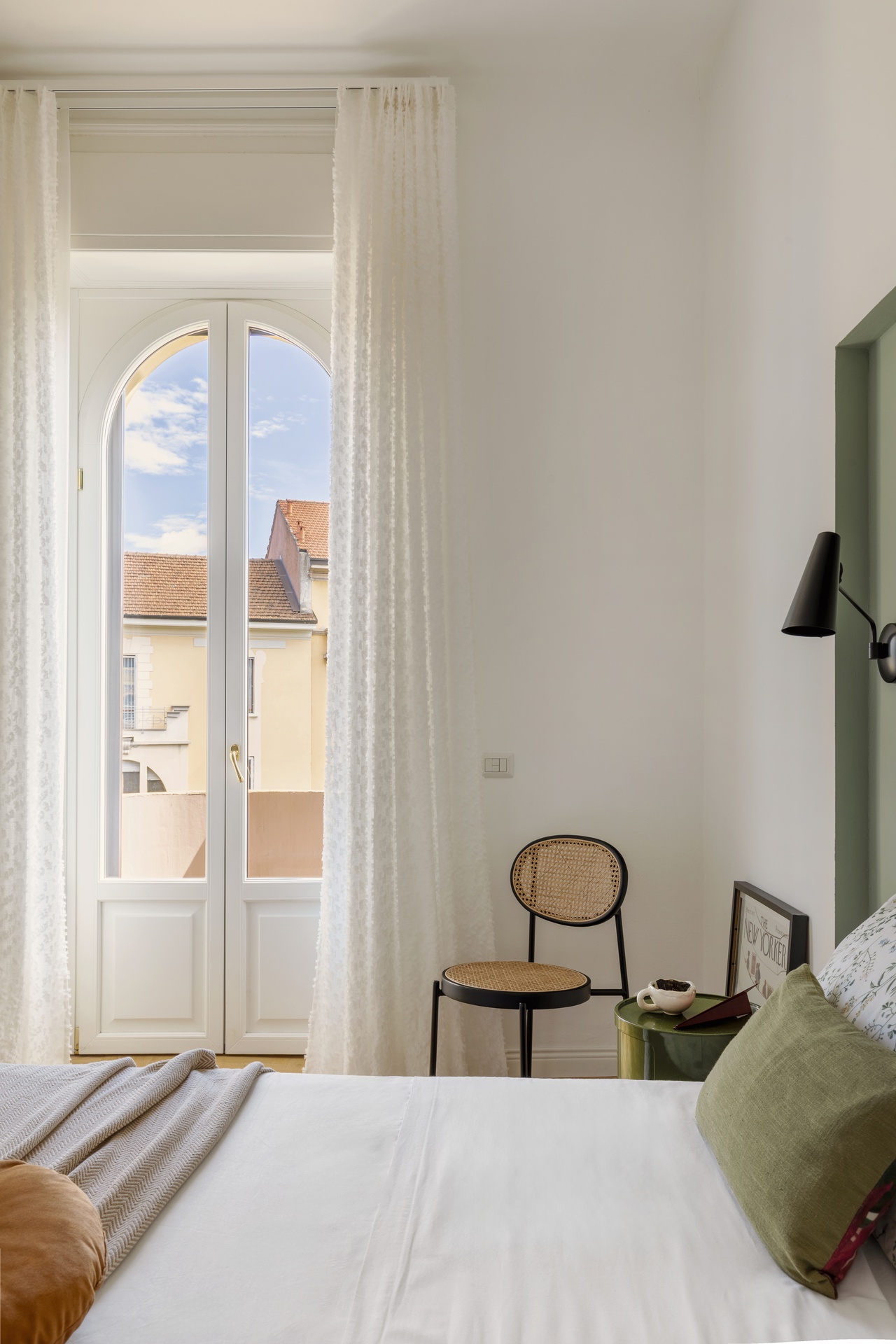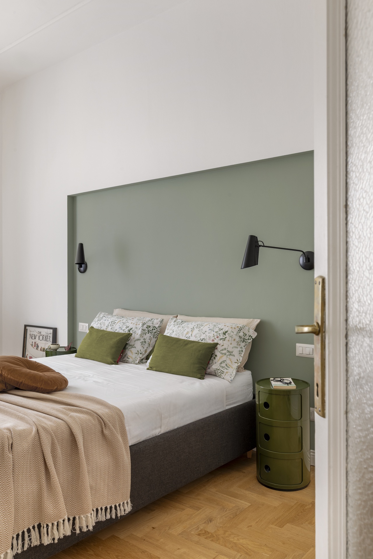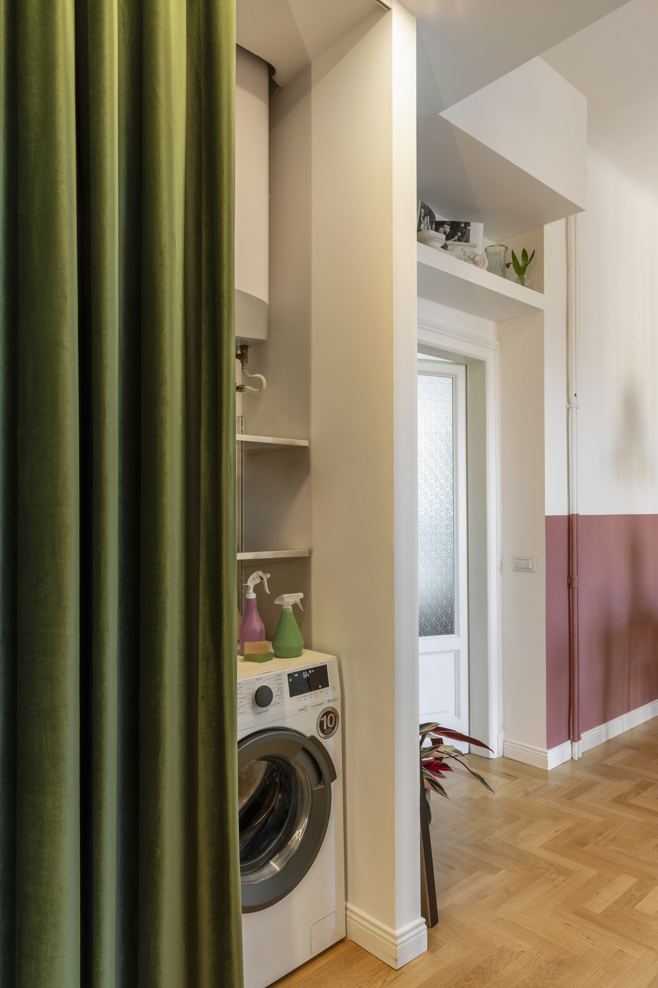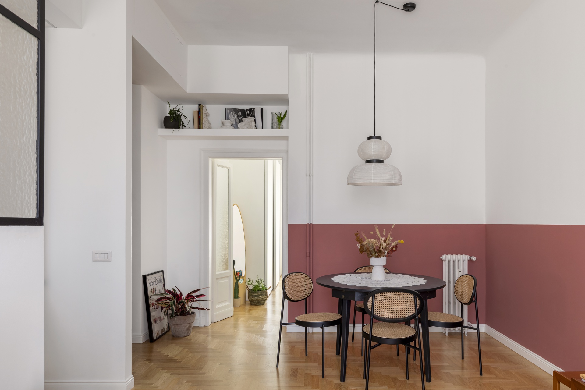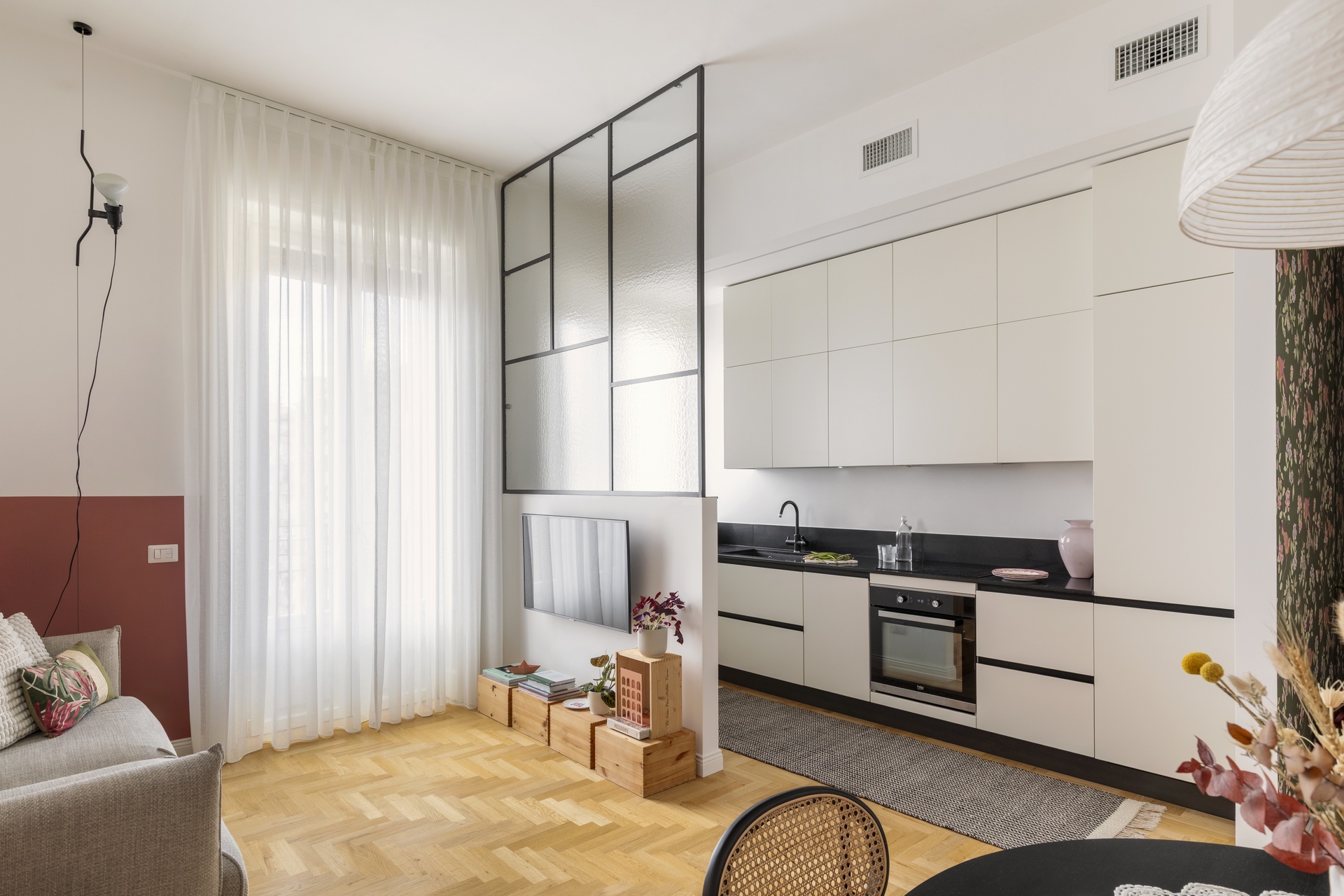 All’inizio, l’ingresso era frammentato tra corridoio, bagno, ripostiglio e cucina, generando spazi disgiunti e poco funzionali. La ristrutturazione ha trasformato questi ambienti in un ampio open space, dove la vecchia cucina e il ripostiglio dialogano con una boiserie color vinaccia che conferisce eleganza e continuità visiva. Un setto in muratura, completato da una grande vetrata in ferro e vetro progettata su misura, separa delicatamente una parte della cucina dal living, senza interrompere la percezione di apertura e profondità.La camera matrimoniale ha mantenuto le generose dimensioni originarie, impreziosita da un serramento ad arco che riprende quello storico dell’appartamento e da una grande nicchia colorata che funge da testata del letto, diventando elemento scenografico e funzionale.