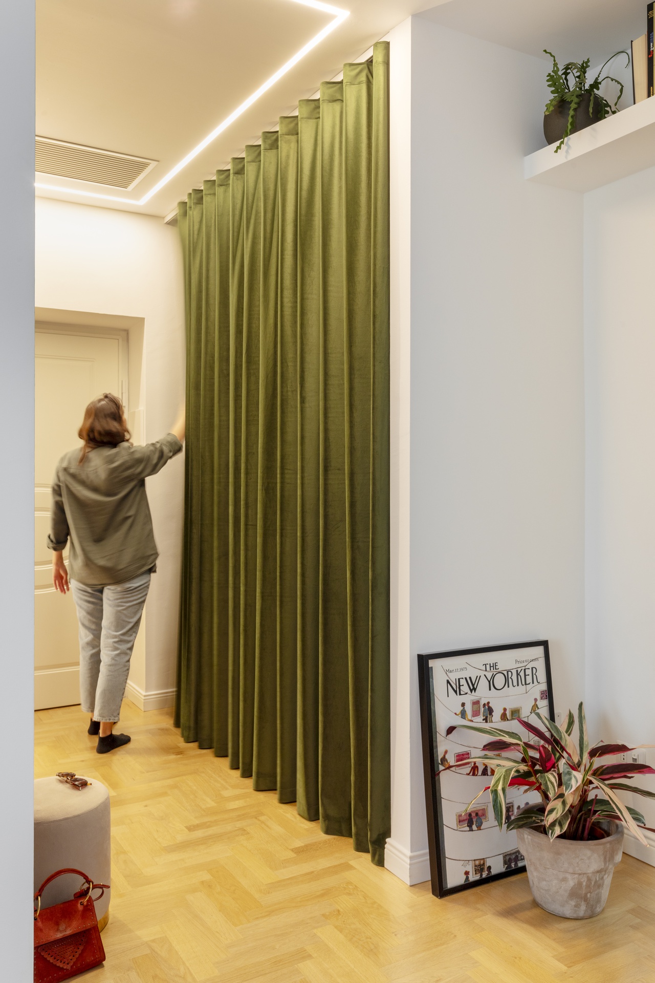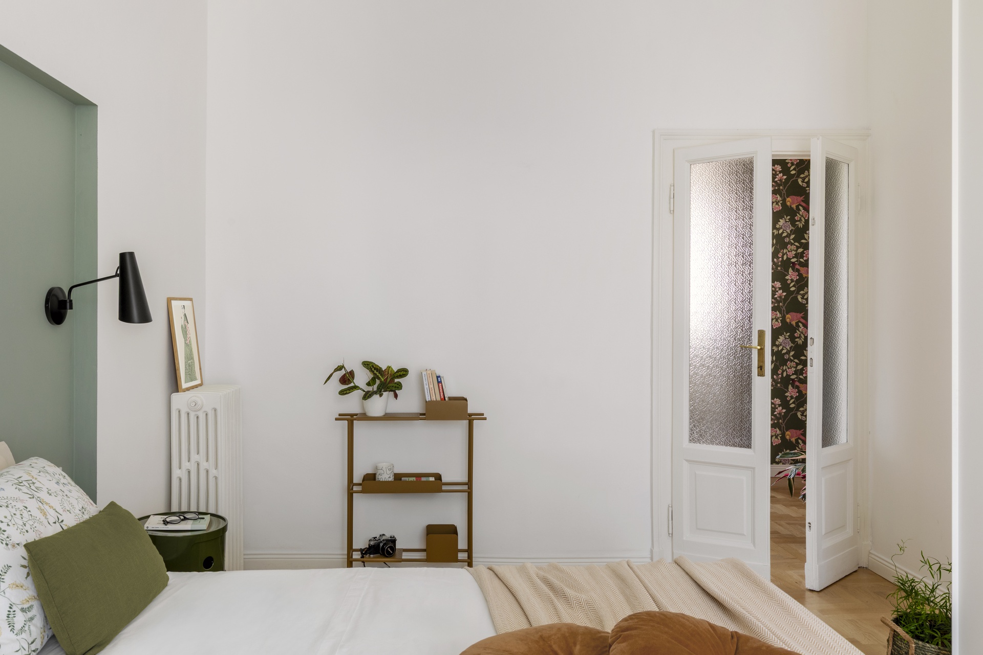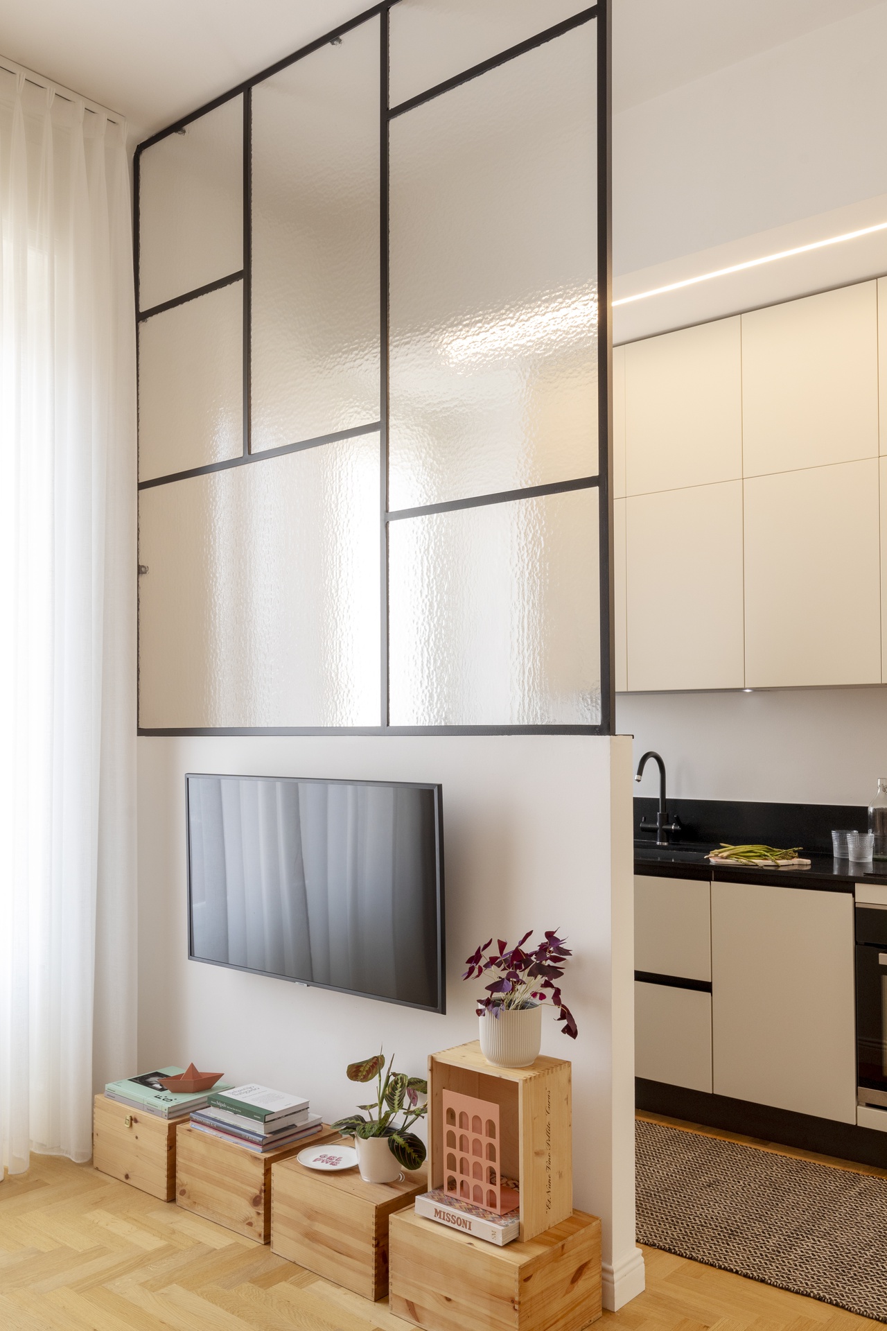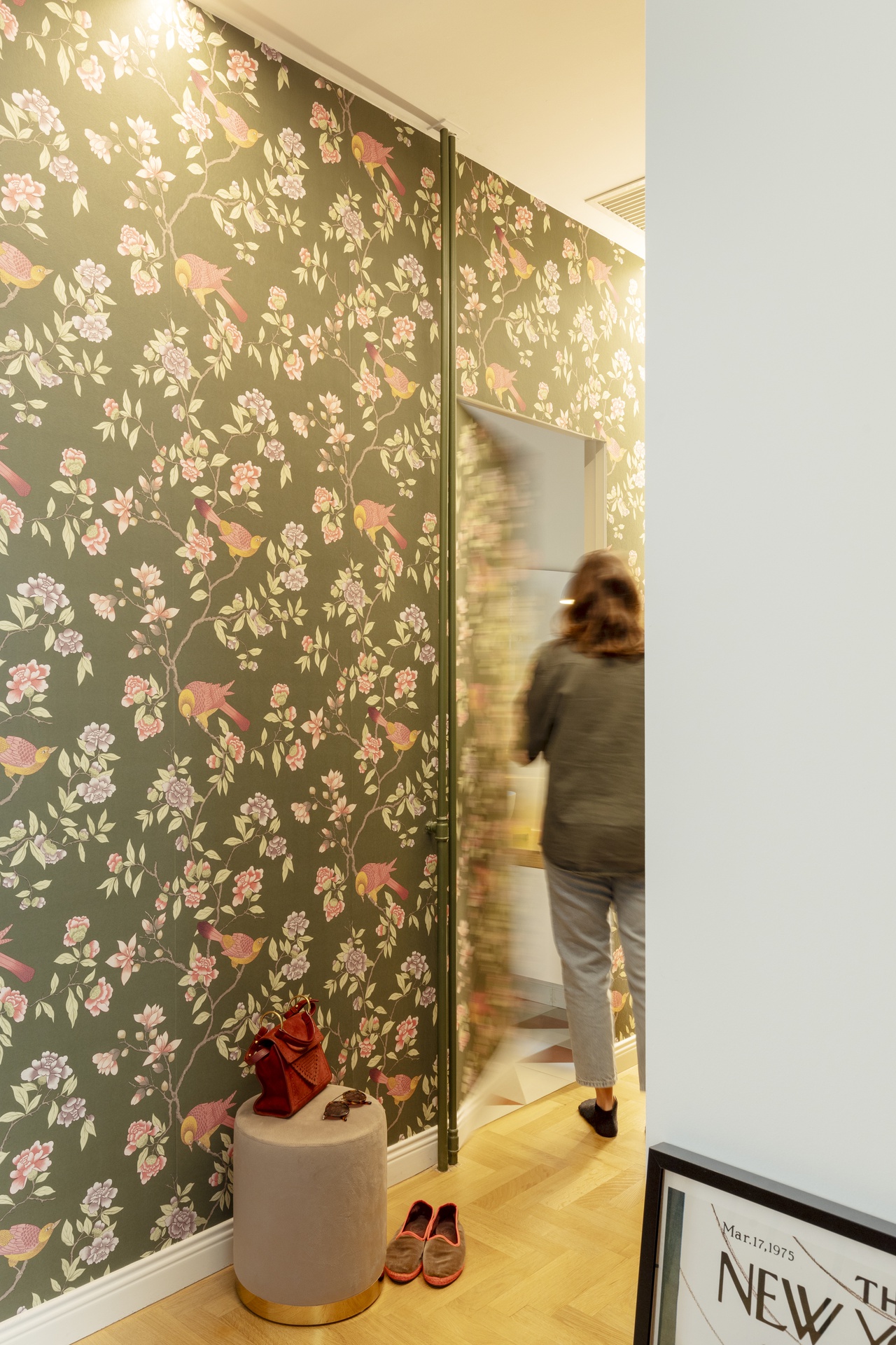 All’inizio, l’ingresso era frammentato tra corridoio, bagno, ripostiglio e cucina, generando spazi disgiunti e poco funzionali. La ristrutturazione ha trasformato questi ambienti in un ampio open space, dove la vecchia cucina e il ripostiglio dialogano con una boiserie color vinaccia che conferisce eleganza e continuità visiva. Un setto in muratura, completato da una grande vetrata in ferro e vetro progettata su misura, separa delicatamente una parte della cucina dal living, senza interrompere la percezione di apertura e profondità.La camera matrimoniale ha mantenuto le generose dimensioni originarie, impreziosita da un serramento ad arco che riprende quello storico dell’appartamento e da una grande nicchia colorata che funge da testata del letto, diventando elemento scenografico e funzionale.